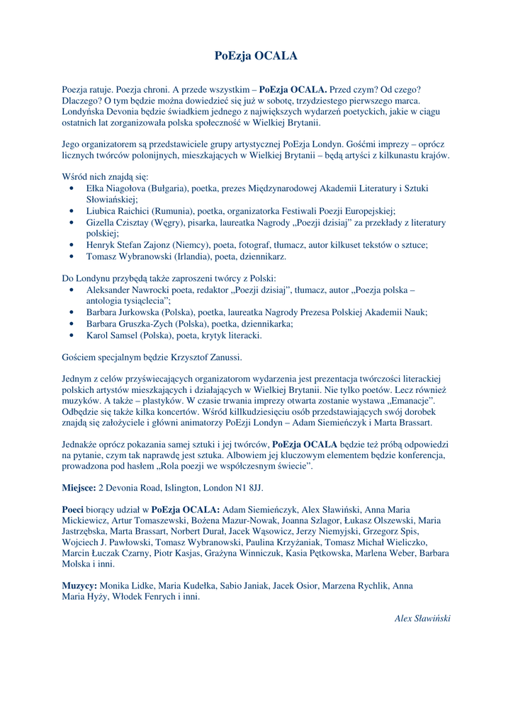 PoEzja OCALA Poezja ratuje. Poezja chroni. A przede wszystkim – PoEzja OCALA. Przed czym? Od czego? Dlaczego? O tym będzie można dowiedzieć się już w sobotę, trzydziestego pierwszego marca. Londyńska Devonia będzie świadkiem jednego z największych wydarzeń poetyckich, jakie w ciągu ostatnich lat zorganizowała polska społeczność w Wielkiej Brytanii. Jego organizatorem są przedstawiciele grupy artystycznej PoEzja Londyn. Gośćmi imprezy – oprócz licznych twórców polonijnych, mieszkających w Wielkiej Brytanii – będą artyści z kilkunastu krajów. Wśród nich znajdą się: • Ełka Niagołova (Bułgaria), poetka, prezes Międzynarodowej Akademii Literatury i Sztuki Słowiańskiej; • Liubica Raichici (Rumunia), poetka, organizatorka Festiwali Poezji Europejskiej; • Gizella Czisztay (Węgry), pisarka, laureatka Nagrody „Poezji dzisiaj” za przekłady z literatury polskiej; • Henryk Stefan Zajonz (Niemcy), poeta, fotograf, tłumacz, autor kilkuset tekstów o sztuce; • Tomasz Wybranowski (Irlandia), poeta, dziennikarz. Do Londynu przybędą także zaproszeni twórcy z Polski: • Aleksander Nawrocki poeta, redaktor „Poezji dzisiaj”, tłumacz, autor „Poezja polska – antologia tysiąclecia”; • Barbara Jurkowska (Polska), poetka, laureatka Nagrody Prezesa Polskiej Akademii Nauk; • Barbara Gruszka-Zych (Polska), poetka, dziennikarka; • Karol Samsel (Polska), poeta, krytyk literacki. Gościem specjalnym będzie Krzysztof Zanussi. Jednym z celów przyświecających organizatorom wydarzenia jest prezentacja twórczości literackiej polskich artystów mieszkających i działających w Wielkiej Brytanii. Nie tylko poetów. Lecz również muzyków. A także – plastyków. W czasie trwania imprezy otwarta zostanie wystawa „Emanacje”. Odbędzie się także kilka koncertów. Wśród killkudziesięciu osób przedstawiających swój dorobek znajdą się założyciele i główni animatorzy PoEzji Londyn – Adam Siemieńczyk i Marta Brassart. Jednakże oprócz pokazania samej sztuki i jej twórców, PoEzja OCALA będzie też próbą odpowiedzi na pytanie, czym tak naprawdę jest sztuka. Albowiem jej kluczowym elementem będzie konferencja, prowadzona pod hasłem „Rola poezji we współczesnym świecie”. Miejsce: 2 Devonia Road, Islington, London N1 8JJ. Poeci biorący udział w PoEzja OCALA: Adam Siemieńczyk, Alex Sławiński, Anna Maria Mickiewicz, Artur Tomaszewski, Bożena Mazur-Nowak, Joanna Szlagor, Łukasz Olszewski, Maria Jastrzębska, Marta Brassart, Norbert Durał, Jacek Wąsowicz, Jerzy Niemyjski, Grzegorz Spis, Wojciech J. Pawłowski, Tomasz Wybranowski, Paulina Krzyżaniak, Tomasz Michał Wieliczko, Marcin Łuczak Czarny, Piotr Kasjas, Grażyna Winniczuk, Kasia Pętkowska, Marlena Weber, Barbara Molska i inni. Muzycy: Monika Lidke, Maria Kudełka, Sabio Janiak, Jacek Osior, Marzena Rychlik, Anna Maria Hyży, Włodek Fenrych i inni. Alex Sławiński