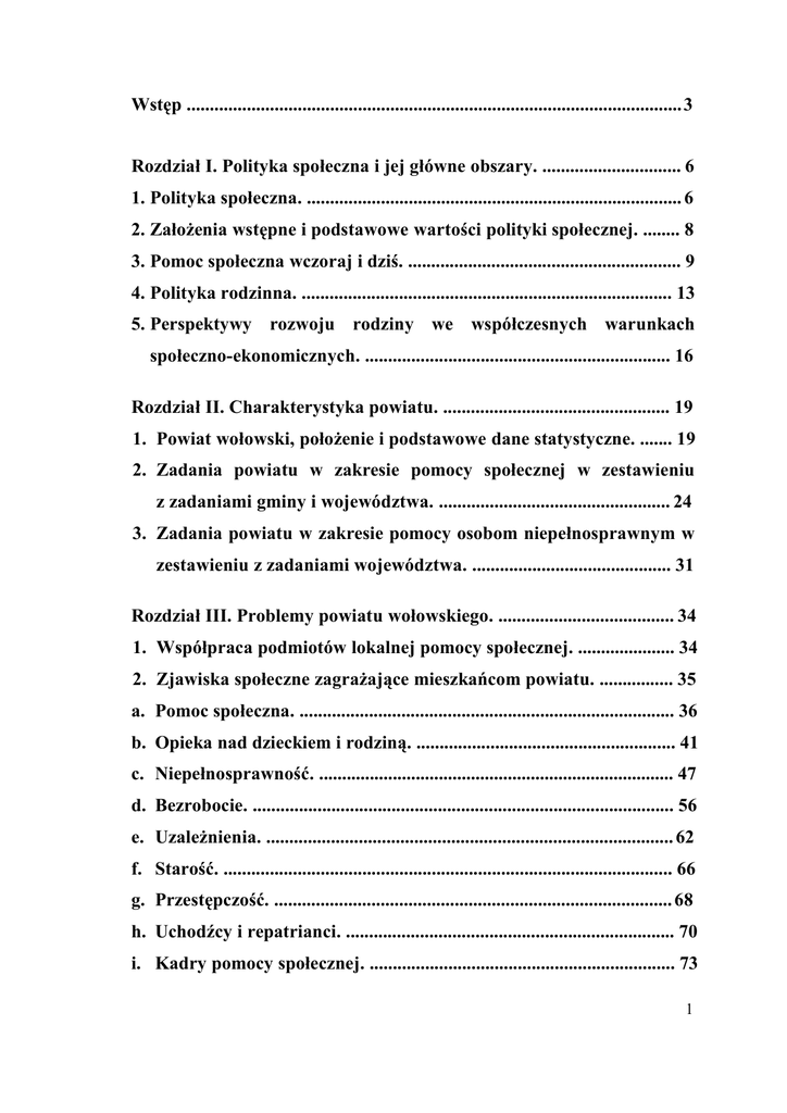 Wstęp ........................................................................................................... 3 Rozdział I. Polityka społeczna i jej główne obszary. .............................. 6 1. Polityka społeczna. ................................................................................. 6 2. Założenia wstępne i podstawowe wartości polityki społecznej. ........ 8 3. Pomoc społeczna wczoraj i dziś. ........................................................... 9 4. Polityka rodzinna. ................................................................................ 13 5. Perspektywy rozwoju rodziny we współczesnych warunkach społeczno-ekonomicznych. .................................................................. 16 Rozdział II. Charakterystyka powiatu. ................................................. 19 1. Powiat wołowski, położenie i podstawowe dane statystyczne. ....... 19 2. Zadania powiatu w zakresie pomocy społecznej w zestawieniu z zadaniami gminy i województwa. .................................................. 24 3. Zadania powiatu w zakresie pomocy osobom niepełnosprawnym w zestawieniu z zadaniami województwa. ........................................... 31 Rozdział III. Problemy powiatu wołowskiego. ...................................... 34 1. Współpraca podmiotów lokalnej pomocy społecznej. ..................... 34 2. Zjawiska społeczne zagrażające mieszkańcom powiatu. ................ 35 a. Pomoc społeczna. ................................................................................. 36 b. Opieka nad dzieckiem i rodziną. ........................................................ 41 c. Niepełnosprawność. ............................................................................. 47 d. Bezrobocie. ........................................................................................... 56 e. Uzależnienia. ........................................................................................ 62 f. Starość. ................................................................................................. 66 g. Przestępczość. ...................................................................................... 68 h. Uchodźcy i repatrianci. ....................................................................... 70 i. Kadry pomocy społecznej. .................................................................. 73 1 Rozdział IV. Kierunki rozwoju pomocy społecznej oraz propozycje radzenia sobie z istniejącymi problemami społecznymi. ..................... 75 1. Powiatowy program działań na rzecz osób niepełnosprawnych. .. 75 2. Powiatowy program działań na rzecz pomocy dziecku i rodzinie..79 3. Zespół Interwencji Kryzysowej. ........................................................ 93 4. Centrum Specjalistycznego Poradnictwa. ........................................ 96 5. Powiatowy Program Promocji Zatrudnienia oraz Aktywizacji Lokalnego Rynku Pracy. .................................................................... 97 Rozdział V. Strategia powiatu. .............................................................. 105 1. Analiza SWOT. .................................................................................. 105 2. Strategia i cele strategiczne. ............................................................. 109 Rozdział VI. Wdrażanie i monitorowanie strategii. ........................... 114 1. Pojęcie wdrażania i monitorowania. ................................................ 114 2. Wdrażanie i monitorowanie Powiatowej Strategii Rozwiązywania Problemów Społecznych Powiatu Wołowskiego. ............................ 116 Zakończenie. ............................................................................................ 119 Bibliografia. ............................................................................................. 121 Spis tabel. ................................................................................................. 124 Spis rysunków. ...................................................................... .................. 125 Spis aneksów. ........................................................................................... 126 2 Wstęp Zadaniem państwa jest stworzenie takich warunków, które umożliwiają rodzinie podjęcie różnych form aktywności, wpływających na polepszenie sytuacji materialnej i rozwój duchowy rodziny. Celem polityki społecznej, jako działalności, są: - wyrównywanie warunków życia i pracy poprzez zaspokajanie potrzeb ludności w różnym wieku, - tworzenie równego dostępu w korzystaniu z obywatelskich praw, - usuwanie nierówności społecznych, - kształtowanie stosunków społecznych, - asekurowanie przed ryzykami życiowymi. Szczególne miejsce w polityce społecznej zajmuje polityka rodzinna. Zgodnie z przyjętą powszechnie definicją „polityka rodzinna” to całokształt norm prawnych, działań i środków uruchamianych przez państwo w celu stworzenia odpowiednich warunków życia dla rodziny, jej powstania, prawidłowego funkcjonowania i spełniania przez nią wszystkich ważnych społecznie ról. Przyjmując tę definicję możemy stwierdzić, iż u podłoża polityki rodzinnej leżą następujące założenia: - rodzina to podstawowa i najważniejsza instytucja społeczna, - rodzina powinna być wspierana przez państwo, - polityka rodzinna oznacza wielość polityk, a nie pojedynczy, jednolity akt prawny. Państwo stanowi główny podmiot kształtowania polityki rodzinnej, albowiem na nim spoczywa obowiązek i odpowiedzialność za określenie, prowadzenie i finansowanie tej polityki. Zadania i uprawnienia państwa w zakresie polityki rodzinnej podzielone są między organy centralne, terenowe i samorządowe. Podmiotami polityki rodzinnej są również organizacje pozarządowe, związki zawodowe, związki pracodawców, 3 kościół i związki wyznaniowe. Ostatnim ogniwem w polityce socjalnej państwa, p