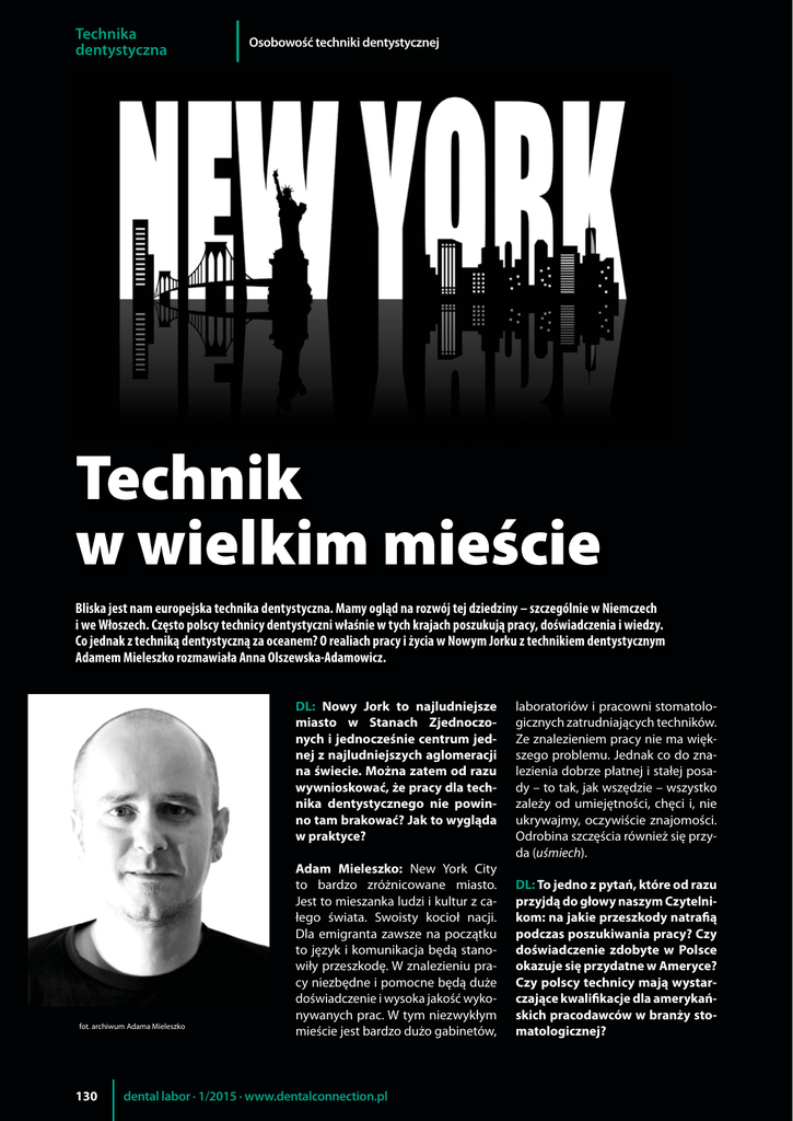 Technika dentystyczna Osobowość techniki dentystycznej Technik w wielkim mieście Bliska jest nam europejska technika dentystyczna. Mamy ogląd na rozwój tej dziedziny – szczególnie w Niemczech i we Włoszech. Często polscy technicy dentystyczni właśnie w tych krajach poszukują pracy, doświadczenia i wiedzy. Co jednak z techniką dentystyczną za oceanem? O realiach pracy i życia w Nowym Jorku z technikiem dentystycznym Adamem Mieleszko rozmawiała Anna Olszewska-Adamowicz. DL: Nowy Jork to najludniejsze miasto w Stanach Zjednoczonych i jednocześnie centrum jednej z najludniejszych aglomeracji na świecie. Można zatem od razu wywnioskować, że pracy dla technika dentystycznego nie powinno tam brakować? Jak to wygląda w praktyce? fot. archiwum Adama Mieleszko 130 Adam Mieleszko: New York City to bardzo zróżnicowane miasto. Jest to mieszanka ludzi i kultur z całego świata. Swoisty kocioł nacji. Dla emigranta zawsze na początku to język i komunikacja będą stanowiły przeszkodę. W znalezieniu pracy niezbędne i pomocne będą duże doświadczenie i wysoka jakość wykonywanych prac. W tym niezwykłym mieście jest bardzo dużo gabinetów, dental labor · 1/2015 · www.dentalconnection.pl laboratoriów i pracowni stomatologicznych zatrudniających techników. Ze znalezieniem pracy nie ma większego problemu. Jednak co do znalezienia dobrze płatnej i stałej posady – to tak, jak wszędzie – wszystko zależy od umiejętności, chęci i, nie ukrywajmy, oczywiście znajomości. Odrobina szczęścia również się przyda (uśmiech). DL: To jedno z pytań, które od razu przyjdą do głowy naszym Czytelnikom: na jakie przeszkody natrafią podczas poszukiwania pracy? Czy doświadczenie zdobyte w Polsce okazuje się przydatne w Ameryce? Czy polscy technicy mają wystarczające kwalifikacje dla amerykańskich pracodawców w branży stomatologicznej? Osobowość techniki dentystycznej Technika dentystyczna fot. archiwum Adama Mieleszko A.M.: Muszę przyznać, że europejski poziom edukacji w technice dentystycznej jest znacznie wyższy niż amerykański. W związku z tym polscy technicy nie powinni mieć większych problemów, jeśli chodzi o dobre kwalifikacje. Wszystko jednak zależy od indywidualnych zdolności plastycznych i umiejętności technicznych. DL: Nowy Jork wywiera znaczący wpływ na światowy biznes, media, sztukę, technologię oraz rozrywkę. To samo dotyczy edukacji i medycyny. Powiążmy to. Jak wygląda edukacja na kierunkach stomatologicznych w USA? W polskich szkołach od lat wypomina się brak zajęć praktycznych i praktyk na odpowiednim poziomie. A.M.: Tak jak wspomniałem, nie mamy się czego wstydzić, poziom europejskiej edukacji jest wyższy niż na amerykańskich uczelniach. Ponadto brak zajęć praktycznych na odpowiednim poziomie lub ich limitowana ilość jest również problemem USA. Większość absolwentów po ukończeniu szkoły nie ma wystarczającego doświadczenia. DL: Jak wyglądała Pana droga do osiągnięcia stabilnej sytuacji w Nowym Jorku? Jakie były Pana początki za oceanem? I może pytanie, od którego należałoby zacząć... Kiedy zrodził się pomysł na przeprowadzkę? DL: Na jakim poziomie są amerykańska technologia i materiały stomatologiczne? Czy są one w zasięgu ręki każdego nowojorskiego laboratorium? A.M.: Tak jak na całym świecie, Ameryka również jest zafascynowana najnowszą technologią. Stomatologia cyfrowa, systemy CAD/CAM oraz najnowsze materiały pełnoceramiczne zdobywają rynek. Są one dostępne poprzez lokalnych dystrybutorów i stosunkowo łatwo osiągalne – większość laborów je posiada. Zirconia i e.max są teraz jednymi z najbardziej popularnych materiałów w Nowym Jorku. A.M.: W Stanach Zjednoczonych jestem od 1990 roku. Wyemigrowałem zaraz po upadku systemu komunistycznego w Polsce i otworzeniu granic. Szkołę techniki dentystycznej ukończyłem już w Nowym Jorku. Tam też zdobyłem certyfikaty ceramisty dentystycznego. Po ukończeniu szkoły zostałem zatrudniony w laboratorium techniki dentystycznej w obrębie kliniki stomatologicznej, gdzie rozpocząłem współpracę ze światowej sławy specjalistami. DL: Dziękuję za rozmowę. dental labor · 1/2015 · www.dentalconnection.pl n 131
