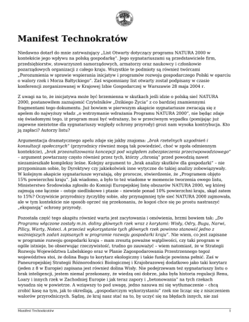 Manifest Technokratów Niedawno dotarł do mnie zatrważający „List Otwarty dotyczący programu NATURA 2000 w kontekście jego wpływu na polską gospodarkę”. Jego sygnatariuszami są przedstawiciele firm, przedsiębiorstw, stowarzyszeń samorządowych, armatorzy oraz naukowcy i członkowie pozarządowych organizacji z całego kraju. Wszystkie te podmioty są również twórcami „Porozumienia w sprawie wspierania inicjatyw i programów rozwoju gospodarczego Polski w oparciu o walory rzek i Morza Bałtyckiego”. Zaś wspomniany list otwarty został podpisany w czasie konferencji zorganizowanej w Krajowej Izbie Gospodarczej w Warszawie 28 maja 2004 r. Z uwagi na to, że inicjatywa może być brzemienna w skutkach jeśli idzie o polską sieć NATURA 2000, postanowiłem zaznajomić Czytelników „Dzikiego Życia” z co bardziej znamiennymi fragmentami tego dokumentu. Już bowiem w pierwszym akapicie sygnatariusze zwracają się z apelem do najwyższy władz „o wstrzymanie wdrażania Programu NATURA 2000”, nie będąc zdaje się świadomymi tego, iż program musi być wdrażany, bo w przeciwnym wypadku (pomijając już zapewne nieistotne dla sygnatariuszy względy ochrony przyrody) grozi nam wysoka kontrybucja. Kto ją zapłaci? Autorzy listu? Argumentacja dramatycznego apelu zdaje się jakby znajoma: „brak rzetelnych uzgodnień i konsultacji społecznych” (przyrodnicy również mogą tak powiedzieć, choć w zgoła odmiennym kontekście), „brak przeanalizowania koncepcji pod względem zabezpieczenia przeciwpowodziowego” – argument powtarzany często również przez tych, którzy „chronią” przed powodzią nawet niezamieszkałe kompleksy leśne. Kolejny argument to „brak analizy skutków dla gospodarki” – nie przypominam sobie, by Dyrektywy czy jakiekolwiek inne wytyczne do takiej analizy zobowiązywały. W kolejnym akapicie sygnatariusze wyrażają, oby prorocze, stwierdzenie, że „Programem objęto 15% powierzchni kraju”. Jak wiadomo, a było to też wiadome w momencie tworzenia owego listu, Ministerstwo Środowiska zgłosiło do Komisji Europejskiej listę obszarów NATURA 2000, wg której zajmują one łącznie – ostoje siedliskowe i ptasie – niewiele ponad 10% powierzchni kraju, skąd zatem to 15%? Oczywiście przyrodnicy życzyliby sobie, aby przynajmniej tyle sieć NATURA 2000 zajmowała, ale w tym kontekście nie sposób oprzeć się przekonaniu, że kogoś chce się po prostu nastraszyć „ekspansją” ochrony przyrody. Pozostała część tego akapitu również warta jest zacytowania i omówienia, brzmi bowiem tak: „Do Programu włączone zostały m.in. doliny głównych rzek wraz z korytami: Wisły, Odry, Bugu, Narwi, Pilicy, Warty, Noteci. A przecież wykorzystanie tych głównych rzek powinno stanowić jedno z ważniejszych zadań zapisanych w programie rozwoju gospodarki kraju”. Nie wiem, co jest zapisane w programie rozwoju gospodarki kraju – mam zresztą poważne wątpliwości, czy taki program w ogóle istnieje, bo obserwując rzeczywistość, trudno go zauważyć – wiem natomiast, że w Strategii Rozwoju Województwa Lubelskiego oraz w Planie Zagospodarowania Przestrzennego tegoż województwa stoi, że dolina Bugu to korytarz ekologiczny i takie funkcje powinna pełnić. Zaś w Paneuropejskiej Strategii Różnorodności Biologicznej i Krajobrazowej dodatkowo jako taki korytarz (jeden z 8 w Europie) zapisana jest również dolina Wisły. Nie podejrzewam też sygnatariuszy listu o brak inteligencji, jestem niemal przekonany, że wiedzą oni dobrze, jaka była historia regulacji Renu, Loary i innych rzek w Zachodniej Europie i jak teraz zapory i „betonowania” na tych rzekach wysadza się w powietrze. A wziąwszy to pod uwagę, jedno nasuwa mi się wytłumaczenie – chcą zrobić kasę na tym, jak to określają, „gospodarczym wykorzystaniu” rzek nie licząc się z niszczeniem walorów przyrodniczych. Sądzę, że kraj nasz stać na to, by uczyć się na błędach innych, nie zaś Manifest Technokratów 1 betonować najpierw, by potem ogromnym kosztem „rozbetonowywać”. O takim drobiazgu, że doliny i pradoliny rzeczne to najcenniejsze ekosystemy w naszym kraju, w tym towarzystwie chyba nawet nie warto wspominać. Dalej następuje coś, co nazwałbym budzeniem demonów: „Wiemy, że nie może powtórzyć się przeszłość w najgorszej formie kiedy to tylko władza (przecież przemijająca) wie lepiej, a inni, których decyzje dotyczą (niemal wszystkie samorządy w kraju!), są w błędzie, nie rozumieją nowego”. Znów rzuca się w oczy wielka nieścisłość, bo można by zapytać: jakie to „wszystkie samorządy w kraju”, skoro NATURA 2000 zajmuje nieco ponad 10% powierzchni kraju? Nikt nie zarzuca samorządom, że „nie rozumieją nowego” one go po prostu nie znają. Nie mają wiedzy o sieci NATURA 2000, co jest niestety zawinione również przez samych przyrodników. Te spośród gmin, które są w tej materii uświadomione, zachowują się zupełnie inaczej: same wystosowują zapytania do ministerstwa środowiska, dlaczego „zabrano” im obszary NATURA 2000, jak na Jurze Krakowsko-Częstochowskiej, lub nawet chcą zakładać Centra Natury 2000, jak na Lubelszczyźnie. Dalej czytamy: „Program NATURA 2000 w żaden sposób nie powinien zahamować rozwoju gospodarczego w rejonach głównych rzek, nie powinien pogłębiać strefy bezrobocia, stwarzać zagrożeń powodziowych”. To kolejne „strachy na samorządy”. A cóż stwarza większe zagrożenia powodziowe i zwiększa ilość strat, jeśli nie prowadzenie „rozwoju gospodarczego” w dolinie rzecznej? Zabudowa teraz zalewowych czy lokowanie tam jakiejkolwiek infrastruktury gospodarczej to jak zapalanie zapałki w składzie prochu, a następnie dziwienie się, że nastąpił wybuch. Rzeka jest „organizmem żywym”, jest dynamiczna, zmienna sezonowo – nawet jeśli przez kilkadziesiąt lat jest „w miarę spokojna”, to zawsze może z