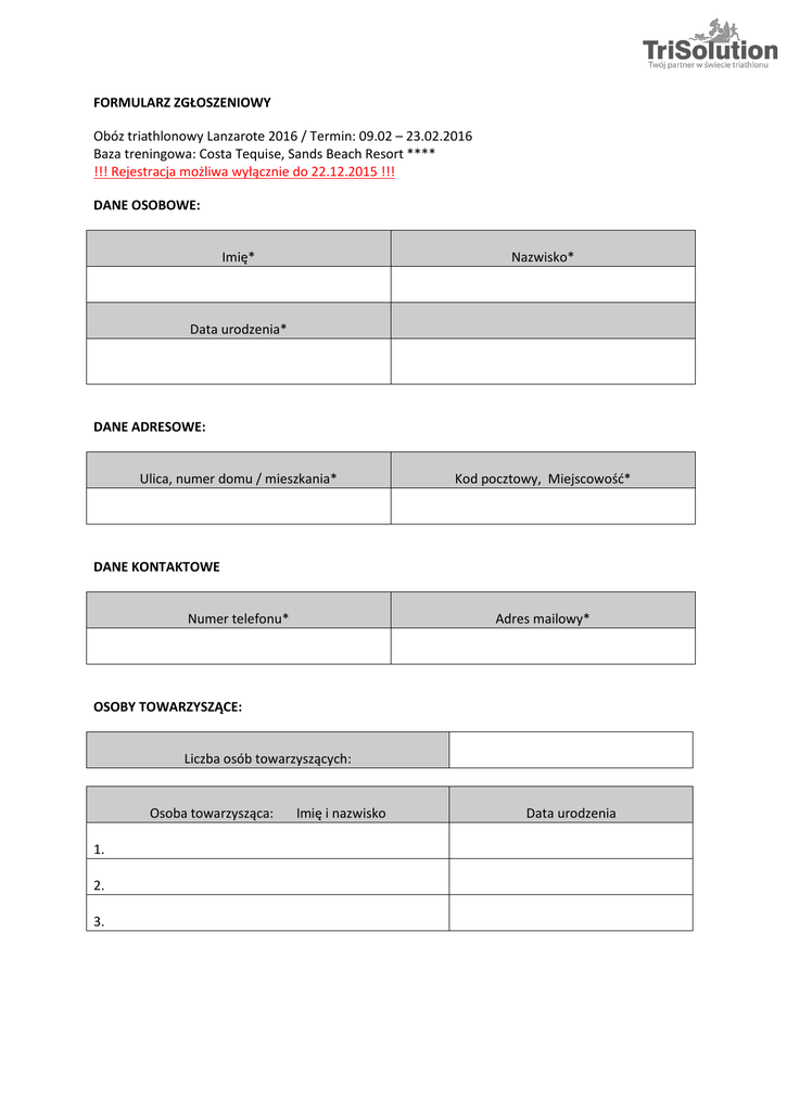 FORMULARZ ZGŁOSZENIOWY Obóz triathlonowy Lanzarote 2016 / Termin: 09.02 – 23.02.2016 Baza treningowa: Costa Tequise, Sands Beach Resort **** !!! Rejestracja możliwa wyłącznie do 22.12.2015 !!! DANE OSOBOWE: Imię* Nazwisko* Data urodzenia* DANE ADRESOWE: Ulica, numer domu / mieszkania* Kod pocztowy, Miejscowość* DANE KONTAKTOWE Numer telefonu* Adres mailowy* OSOBY TOWARZYSZĄCE: Liczba osób towarzyszących: Osoba towarzysząca: 1. 2. 3. Imię i nazwisko Data urodzenia TRANSFER* (Lotnisko Lanzarote – Hotel – Lotnisko Lanzarote) Grupa powyżej 10 osób transfer bezpłatny !!! Transfer Cena EUR bez transferu Prosimy wstawić “X” w odpowiednim polu poniżej: ------- 1 – 5 osób 45 EUR/osoba Rower 24 EUR/sztuka PROSZĘ O REZERWACJĘ* Ceny obejmują 2- tygodniowy obóz treningowy według oferty + zakwaterowanie + śniadanie i obiadokolacja. Ceny nie zawierają przelotów! APARTAMENT Z 1 SYPIALNIĄ STANDARDOWY (55m2) Rezerwacja bezzwrotna* Rezerwacja standardowa** APARTAMENT Z 1 SYPIALNIĄ PODWYŻSZONY STANDARD (75m2) Rezerwacja bezzwrotna* Rezerwacja standardowa** 1 osoba Proszę wstawić “X” w odpowiedn im polu poniżej 6.990,00 PLN 7.890,00 PLN 1 osoba 2 osoby 5.490,00 PLN 6.190,00 PLN Proszę wstawić “X” w odpowiedn im polu 3 osoby poniżej 2 osoby poniżej 7.690,00 PLN 8.690,00 PLN Proszę wstawić “X” w odpowiedn im polu xxx xxx Proszę wstawić “X” w odpowiedn im polu 3 osoby*** poniżej 5.900,00 PLN 6.690,00 PLN Proszę wstawić “X” w odpowiedn im polu poniżej 5.490,00 PLN 6.190,00 PLN * W przypadku rezerwacji bezzwrotnych wymagana jest płatność całej kwoty w momencie dokonywania rezerwacji oraz potwierdzenie braku możliwości anulowania rezerwacji. ** Do potwierdzenia rezerwacji standardowych wymagana jest wpłata kwoty w wysokości 25% ceny obozu, jest to forma zadatku, która nie podlega zwrotowi. Wpłata końcowa do 28.12.2015 bez ponownego przypomnienia. *** Rezerwacje apartamentów z podwyższonym standardem są możliwe tylko przez 3-osobowe grupy. Osoby towarzyszące nie biorące udziału w programie treningowym obozu otrzymują rabat w wysokości 1050,00 PLN. Dzieci do lat 12 bezpłatne zakwaterowanie. Dopłata do śniadania oraz obiadokolacji w wysokości 950,00 PLN. PRZELOT Proponujemy pomoc w znalezieniu optymalnych połączeń lotniczych. Prosimy wstawić “X” w odpowiednim polu poniżej: Sam zadbam o rezerwacje lotów i prześlę Wam numery oraz dane dotyczące przylotu i odlotu. Proszę o pomoc w znalezieniu optymalnych połączeń lotniczych. UBEZPIECZENIE KL 200.000 PLN NNW 20.000 PLN OC 200.000 PLN Bagaż sportowy 2000 PLN ROWER: Proszę wstawić “X” w odpowiednim polu poniżej: Przywiozę swój własny rower. Potrzebuję wypożyczyć rower na miejscu. Nie przywiozę własnego roweru i nie jestem zaineresowana/-y wypożyczeniem roweru na miejscu. Wypożyczalnia pianek triathlonowych sailfish Na okres trwania obozu oferujemy bezpłatne wypożyczenie pianki sailfish (G-Range, One, Attack, Vibrant). Osoby zainteresowane prosimy o wypełnienie poniższej tabeli. Rezerwacje będą potwierdzanie w kolejności ich wpływania. Prosimy o podanie następujących danych: Waga Wzrost Obwód klatki Preferowany model: *WSZYSTKIE POLA OZNACZONE GWAZKĄ SĄ OBOWIĄZKOWE UWAGI Wysłanie formularza nie jest równoznaczne z rezerwacją pobytu. Rezerwacja następuje w momencie potwierdzenia zamówionych świadczeń i wpłacenia zaliczki. Miejscowość, data: _______________ Czytelny podpis: ______________ Proszę o rezerwację bezzwrotną i niniejszym akceptuję brak możliwości jej anulowania. Miejscowość, data: _______________ Czytelny podpis: ______________ TriSolution, Glów 8, 33-130 Radłów Konto Bankowe: ING Bank Śląski S.A. 41 1050 1562 1000 0091 4706 0140 W tytule przelewu należy wpisać: "imię i nazwisko, obóz triathlonowy LANZAROTE 2016". Ogólny plan obozu na 14 dni Założenia obozu klimatycznego zrealizowane zostaną na wielu płaszczyznach, zawodnicy oprócz udziału w licznych treningach (poniżej szczegóły) zostaną uzbrojeni w wiedzę teoretyczno praktyczną podczas wykładów. Założenia treningowe zostaną dostosowane do poziomu uczestników - w planie mamy podział na 2 lub 3 grupy zaawansowania. Pływanie - Total Immersion a Pływanie w Triathlonie - Doskonalenie techniki pływania - Trening siły w wodzie - Videoanaliza techniki pływania Ilość - 4-5 jednostek treningowych Kolarstwo - Główny cel obozu ( na tą dyscyplinę zostanie położony największy nacisk) - Technika jazdy (nauka, doskonalenie pedałowania) - Treningi wytrzymałości, siły, utrzymywania tempa - Odżywianie w TRI (teoria + praktyka na treningach) - Wykłady - pomiar mocy (dlaczego warto trenować z miernikiem i jak analizować wyniki treningów) itp. Ilość - 8-10 jednostek treningowych Bieganie - Abc techniki - Wybiegania, siła biegowa, tempo - Treningi łączone z rowerem (zakładki) - Treningi stabilizacji - po co, dlaczego i jak je wykonywać - Wykłady Ilość 6-8 jednostek treningowych Zakładamy 2 treningi dziennie przez cały okres trwania obozu przydzielone dniami wolnymi lub treningami regeneracyjnymi. Szczegółowy plan zostanie podamy podczas spotkania integracyjnego na miejscu.
