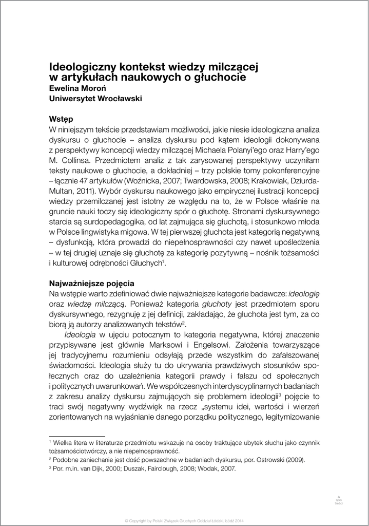 17 Ideologiczny kontekst wiedzy milczącej w artykułach naukowych o głuchocie Ewelina Moroń Uniwersytet Wrocławski Wstęp W niniejszym tekście przedstawiam możliwości, jakie niesie ideologiczna analiza dyskursu o głuchocie – analiza dyskursu pod kątem ideologii dokonywana z perspektywy koncepcji wiedzy milczącej Michaela Polanyi’ego oraz Harry’ego M. Collinsa. Przedmiotem analiz z tak zarysowanej perspektywy uczyniłam teksty naukowe o głuchocie, a dokładniej – trzy polskie tomy pokonferencyjne – łącznie 47 artykułów (Woźnicka, 2007; Twardowska, 2008; Krakowiak, DziurdaMultan, 2011). Wybór dyskursu naukowego jako empirycznej ilustracji koncepcji wiedzy przemilczanej jest istotny ze względu na to, że w Polsce właśnie na gruncie nauki toczy się ideologiczny spór o głuchotę. Stronami dyskursywnego starcia są surdopedagogika, od lat zajmująca się głuchotą, i stosunkowo młoda w Polsce lingwistyka migowa. W tej pierwszej głuchota jest kategorią negatywną – dysfunkcją, która prowadzi do niepełnosprawności czy nawet upośledzenia – w tej drugiej uznaje się głuchotę za kategorię pozytywną – nośnik tożsamości i kulturowej odrębności Głuchych1. Najważniejsze pojęcia Na wstępie warto zdefiniować dwie najważniejsze kategorie badawcze: ideologię oraz wiedzę milczącą. Ponieważ kategoria głuchoty jest przedmiotem sporu dyskursywnego, rezygnuję z jej definicji, zakładając, że głuchota jest tym, za co biorą ją autorzy analizowanych tekstów2. Ideologia w ujęciu potocznym to kategoria negatywna, której znaczenie przypisywane jest głównie Marksowi i Engelsowi. Założenia towarzyszące jej tradycyjnemu rozumieniu odsyłają przede wszystkim do zafałszowanej świadomości. Ideologia służy tu do ukrywania prawdziwych stosunków społecznych oraz do uzależnienia kategorii prawdy i fałszu od społecznych i politycznych uwarunkowań. We współczesnych interdyscyplinarnych badaniach z zakresu analizy dyskursu zajmujących się problemem ideologii3 pojęcie to traci swój negatywny wydźwięk na rzecz „systemu idei, wartości i wierzeń zorientowanych na wyjaśnianie danego porządku politycznego, legitymizowanie Wielka litera w literaturze przedmiotu wskazuje na osoby traktujące ubytek słuchu jako czynnik tożsamościotwórczy, a nie niepełnosprawność. 2 Podobne zaniechanie jest dość powszechne w badaniach dyskursu, por. Ostrowski (2009). 3 Por. m.in. van Dijk, 2000; Duszak, Fairclough, 2008; Wodak, 2007. 1 Δ spis treści © Copyright by Polski Związek Głuchych Oddział Łódzki, Łódź 2014 E. Moroń, Ideologiczny kontekst wiedzy milczącej... 18 istniejących relacji hierarchii i władzy oraz zachowanie tożsamości grupowych” (Chiapello, Fairclought, 2008, s. 376). Na gruncie polskim wyczerpującą definicję ideologii sformułowała Jadwiga Puzynina. W jej ujęciu ideologia to „zespół poglądów, zazwyczaj także zasad postępowania i haseł charakterystyczny dla jakiejś grupy społecznej, oparty na określonych wartościach, dotyczący całościowych koncepcji człowieka i/ lub życia społecznego” (Puzynina, 2008, s. 20). Tak rozumiana ideologia nadaje grupie określoną tożsamość, pozwala określić jej cele i działania oraz pomaga zająć stanowisko wobec poszczególnych wycinków rzeczywistości. Pomaga stwierdzać, co jest prawdziwe, a co fałszywe, zwłaszcza w przypadku problemów istotnych dla poszczególnych społeczności. W większości przypadków ideologia zabezpiecza symboliczne interesy danej grupy, co ma istotne znaczenie w konfrontacji z grupą dominującą4, której poglądy mogą stać się wiedzą powszechną. Wtedy to ideologia grupy dominującej ma znaczący wpływ na opinię publiczną, edukację, gospodarkę, prawo. W przypadku dyskursu o głuchocie (pojmowanego szeroko – jako dyskurs surdopedagogiczny, medyczny oraz z zakresu lingwistyki migowej) grupa dominująca, czyli społeczeństwo słyszące, ustala własną interpretację głuchoty (nienormalność fizjologiczna/ deficyt sensoryczny połączone z nienormalnością intelektualną). Następuje narzucenie własnego reżimu dyskursu: zgodnie z teorią grupy zagłuszanej grupa stanowiąca większość (tu: słyszące społeczeństwo) ma większe możliwości formułowania norm i kształtowania znaczeń w języku. Dzięki temu sprawę istotną dla tej grupy, czyli rehabilitację artykulacji mowy, uważa się za ważną społecznie. Kolejnym etapem jest specjalizacja (unaukowienie) działań, co pozwala na ich legitymizację i przyjęcie za naturalne. Z kolei w grupie zagłuszanej, polskich Głuchych – stanowiącej wg szacunków od 40 do 50 tys. osób – narasta opór wobec uprzedmiatawiających działań rewalidacyjnych. Głusi posługujący się polskim językiem migowym, świadomi własnej tożsamości uznają się bowiem za mniejszość językowo-kulturową, a nie za niepełnosprawnych. Wiedza milcząca (ang. tacitknowledge) to wg Michaela Polanyi’ego typ wiedzy, która jest wykorzystywana w danej sytuacji, ale którą trudno wyrazić wprost słowami (Chmielewska-Banaszak, 2010, s. 45). Można ją nazwać także wiedzą cichą, ukrytą, przemilczaną lub niezwerbalizowaną. W odniesieniu do dyskursu naukowego wiedza milcząca to wiedza wykorzystywana w procesie badawczym lub w trakcie tworzenia tekstów naukowych, jednak pomijana w opisie metanaukowym. 4 Por. koncepcja grupy zagłuszanej C. Kramare. Δ spis treści © Copyright by Polski Związek Głuchych Oddział Łódzki, Łódź 2014 E. Moroń, Ideologiczny kontekst wiedzy milczącej... 19 Model wiedzy milczącej w artykułach naukowych Omawiane w tym tekście elementy wiedzy milczącej w artykułach naukowych o głuchocie odnoszą się do osoby badacza. Można je podzielić na wewnętrzne (zależne od badacza) oraz zewnętrzne (niezależne od badacza). Do czynników wewnętrznych zaliczyć można m.in.: tożsamość badacza, jego orientację badawcz