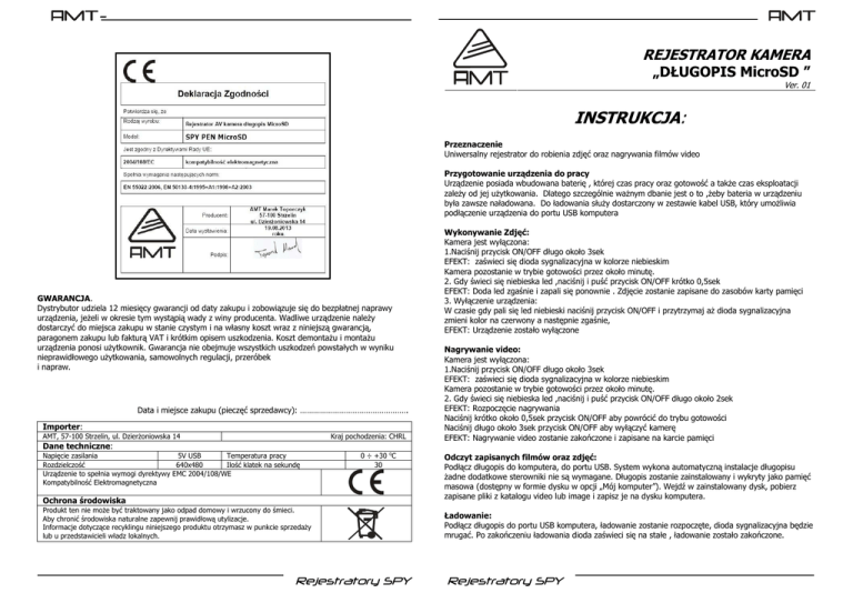 - - REJESTRATOR KAMERA „DŁUGOPIS MicroSD ” Ver. 01 INSTRUKCJA: Przeznaczenie Uniwersalny rejestrator do robienia zdjęć oraz nagrywania filmów video Przygotowanie urządzenia do pracy Urządzenie posiada wbudowana baterię , której czas pracy oraz gotowość a takŜe czas eksploatacji zaleŜy od jej uŜytkowania. Dlatego szczególnie waŜnym dbanie jest o to ,Ŝeby bateria w urządzeniu była zawsze naładowana. Do ładowania słuŜy dostarczony w zestawie kabel USB, który umoŜliwia podłączenie urządzenia do portu USB komputera GWARANCJA. Dystrybutor udziela 12 miesięcy gwarancji od daty zakupu i zobowiązuje się do bezpłatnej naprawy urządzenia, jeŜeli w okresie tym wystąpią wady z winy producenta. Wadliwe urządzenie naleŜy dostarczyć do miejsca zakupu w stanie czystym i na własny koszt wraz z niniejszą gwarancją, paragonem zakupu lub fakturą VAT i krótkim opisem uszkodzenia. Koszt demontaŜu i montaŜu urządzenia ponosi uŜytkownik. Gwarancja nie obejmuje wszystkich uszkodzeń powstałych w wyniku nieprawidłowego uŜytkowania, samowolnych regulacji, przeróbek i napraw. Data i miejsce zakupu (pieczęć sprzedawcy): …………………………………………. Importer: AMT, 57-100 Strzelin, ul. DzierŜoniowska 14 Kraj pochodzenia: CHRL Wykonywanie Zdjęć: Kamera jest wyłączona: 1.Naciśnij przycisk ON/OFF długo około 3sek EFEKT: zaświeci się dioda sygnalizacyjna w kolorze niebieskim Kamera pozostanie w trybie gotowości przez około minutę. 2. Gdy świeci się niebieska led ,naciśnij i puść przycisk ON/OFF krótko 0,5sek EFEKT: Doda led zgaśnie i zapali się ponownie . Zdjęcie zostanie zapisane do zasobów karty pamięci 3. Wyłączenie urządzenia: W czasie gdy pali się led niebieski naciśnij przycisk ON/OFF i przytrzymaj aŜ dioda sygnalizacyjna zmieni kolor na czerwony a następnie zgaśnie, EFEKT: Urządzenie zostało wyłączone Nagrywanie video: Kamera jest wyłączona: 1.Naciśnij przycisk ON/OFF długo około 3sek EFEKT: zaświeci się dioda sygnalizacyjna w kolorze niebieskim Kamera pozostanie w trybie gotowości przez około minutę. 2. Gdy świeci się niebieska led ,naciśnij i puść przycisk ON/OFF długo około 2sek EFEKT: Rozpoczęcie nagrywania Naciśnij krótko około 0,5sek przycisk ON/OFF aby powrócić do trybu gotowości Naciśnij długo około 3sek przycisk ON/OFF aby wyłączyć kamerę EFEKT: Nagrywanie video zostanie zakończone i zapisane na karcie pamięci Dane techniczne: Napięcie zasilania 5V USB Temperatura pracy Rozdzielczość 640x480 Ilość klatek na sekundę Urządzenie to spełnia wymogi dyrektywy EMC 2004/108/WE Kompatybilność Elektromagnetyczna 0 ÷ +30 oC 30 Ochrona środowiska Produkt ten nie moŜe być traktowany jako odpad domowy i wrzucony do śmieci. Aby chronić środowiska naturalne zapewnij prawidłową utylizacje. Informacje dotyczące recyklingu niniejszego produktu otrzymasz w punkcie sprzedaŜy lub u przedstawicieli władz lokalnych. Rejestratory SPY Odczyt zapisanych filmów oraz zdjęć: Podłącz długopis do komputera, do portu USB. System wykona automatyczną instalacje długopisu Ŝadne dodatkowe sterowniki nie są wymagane. Długopis zostanie zainstalowany i wykryty jako pamięć masowa (dostępny w formie dysku w opcji „Mój komputer”). Wejdź w zainstalowany dysk, pobierz zapisane pliki z katalogu video lub image i zapisz je na dysku komputera. Ładowanie: Podłącz długopis do portu USB komputera, ładowanie zostanie rozpoczęte, dioda sygnalizacyjna będzie mrugać. Po zakończeniu ładowania dioda zaświeci się na stałe , ładowanie zostało zakończone. Rejestratory SPY - - Umiejscowienie elementów kamery na obudowie długopisu Przycisk „reset” wielokrotne naciskanie przycisku ON/OFF w krótkim odstępie czasu moŜe doprowadzić do zwieszenia się urządzenia. Za pomocą szpilki moŜna wówczas nacisnąć przycisk reset ,który restartuje urządzenie WAśNE Przycisk ON/OFF oraz reset są bardzo delikatne dlatego naleŜy obchodzić się z nim delikatnie i z wyczuciem. W przeciwnym wypadku moŜe to doprowadzić do uszkodzenia kamery Zmiana parametrów daty wyświetlanych na nagraniu Podłączyć urządzenie do portu USB W komputerze stworzyć odpowiedni plik tekstowy o nazwie: time Zapisać w pliku parametr nowej daty według przykładu poniŜej: 2013.08.30 09.01.00 Zapisać plik i umieścić go w głównym katalogu pamięci urządzenia Parametry techniczne -Rozdzielczość nagrywania: 640x480 - format AVI -Ilość klatek na sekundę: 30 klatek -Rozmiar pliku video 1 minuta: około 35MB -Rozmiar pliku jednego zdjęcia: około 100Kb -Kamera ma obiektyw - 1mm - zamaskowany -Wbudowana pamięć 4G -Wbudowany akumulator -Obraz bezpośrednio zapisywany na kartę pamięci -WyposaŜony w diodę sygnalizująca stan urządzenia -Nie wymaga sterowników -Ładowanie przez gniazdo USB komputera -Odczytywanie danych na komputer poprzez port USB -Czas nagrywania na nowej naładowanej baterii do 2 -Obsługa kart pamięci do 8G Rejestratory SPY Rejestratory SPY godzin