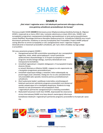 SHARE II „Sieć miast i regionów wraz z ich lokalnymi partnerami oferująca ochronę oraz gościnę uchodźcom przesiedlonym do Europy” Pierwszy projekt SHARE (SHARE I) kierowany przez Międzynarodową Katolicką Komisję ds. Migracji (ICMC), rozpoczął się w marcu 2012 roku i zostanie zakończony w lutym 2014 roku. SHARE I jest europejskim programem nawiązywania kontaktów wprowadzonym w życie pod przewodnictwem miasta Sheffiled, Wysokiego Komisarza Narodów Zjednoczonych ds. Uchodźców (UNHCR) oraz innych kluczowych partnerów. Osadzony w szerszej Europejskiej Sieci Przesiedleń, Project SHARE połączył szereg aktorów na arenie europejskiej w celu zaangażowania miast i regionów mających doświadczenie w kwestiach przesiedleń uchodźców, jak i tych, które chciałyby się tego podjąć w przyszłości. Od czasu powstania program SHARE I: Zaangażował ponad 300 uczestników wywodzących się z europejskich regionów, miast, władz samorządowych i innych partnerów społeczeństwa obywatelskiego w 15 krajach europejskich w ramach programu strukturalnego dialogu, wymiany doświadczeń oraz nawiązywania kontaktów; Umożliwił regionalnym i miejskim delegacjom z 9 europejskich krajów złożenie Wizyty w ramach Wymiany w Mieście SHARE, mającej na celu zapoznanie się z brytyjskim programem przesiedleńczym; Umożliwił rozpoczęcie dialogu z miastami, które zobowiązały się przestrzegać praw człowieka. Dialog ten ma na celu uświadomienie roli przesiedleń jako sposobu niesienia pomocy prześladowanym uchodźcom; Zlecił wykonanie badań i publikacje materiałów umożliwiających lokalnym partnerom wdrożenie programu przesiedleń oraz dostarczył zasoby zaopatrujące ich w niezbędną ekspertyzę. Działania te mają również na celu promowanie roli europejskich miast i regionalnych partnerstw zaangażowanych w kwestię przesiedleń; Wykształcił tożsamość marki Sieci SHARE, doprowadził do stworzenia strony internetowej SHARE oraz bazy danych zawierającej informacje kontaktowe lokalnych i regionalnych partnerów programu przesiedleń w Europie jak i poza nią. Współfinansowany przez Komisję Europejską W celu rozbudowy Sieci SHARE w latach 2014-15, zatwierdzone zostało finansowanie ze środków europejskich umożliwiające wprowadzenie programu w życie w okresie od marca 2014 roku do sierpnia 2015 roku. SHARE II 1. Partnerzy W ramach programu SHARE II europejski oddział ICMC kontynuował będzie współpracę z europejskimi miastami, regionami, organizacjami i sieciami międzynarodowymi, organizacjami społeczeństwa obywatelskiego w Belgii, Czechach, Finlandii, Francji, Niemczech, Irlandii, Holandii, Hiszpanii, Szwecji i Wielkiej Brytanii. Współpraca ta będzie obejmowała partnerów stowarzyszonych we wszystkich wyżej wymienionych krajach, jak również na Węgrzech, w Polsce, Portugalii i Rumunii. Pełny wykaz partnerów programu SHARE II znajduje się w Aneksie A. 2. Działania projektu a. Rozszerzenie i wzmocnienie Sieci SHARE Wraz ze swoimi partnerami oraz interesariuszami, ICMC będzie kontynuowała rozbudowę Sieci SHARE poprzez intensywny program informacyjny, działania oceniające oraz współpracę z europejskimi regionami, miastami, władzami samorządowymi oraz partnerami społeczeństwa obywatelskiego. Działania informacyjne będą koncentrowały się na wyjaśnianiu zjawiska przesiedleń uchodźców oraz promowaniu roli, jaką miasta mogą odegrać w ochronie uchodźców i przestrzeganiu praw człowieka. Działania te będą również skupiały się na oferowaniu konkretnych rozwiązań dla określonych aspektów przesiedleń, jak na przykład planowanie przyjazdu uchodźców czy zapewnienie im miejsca zamieszkania. SHARE II kontynuował będzie rozbudowę programu SHARE jako integralnej części Europejskiej Sieci Przesiedleń, umożliwiając lokalnym i regionalnym partnerom uczestniczenie w krajowych spotkaniach na rzecz przesiedleń organizowanych we współpracy z Centralnymi Punktami Krajowych Sieci. Program SHARE II będzie podtrzymywał rozwój kampanii "Przesiedlenia Ratują Życie” oraz inicjatyw zwiększających świadomość w społeczeństwie, jak na przykład tych obecnie odnoszących się do uchodźców syryjskich. W ramach SHARE II kontynuowany będzie rozwój internetowych narzędzi oraz zasobów informacyjnych na www.resettlement.eu, w tym: Narzędzi wymiany wiedzy i doświadczeń w ramach partnerstwa w Sieci SHARE (rysunek obok) Danych zawierających charakterystykę stowarzyszonych miast i regionów będących partnerami programu SHARE Rejestru członków Sieci SHARE opublikowanego na stronie internetowej Najnowszych informacji dotyczących przyjazdu osób przesiedlonych do miast europejskich. Współfinansowany przez Komisję Europejską Magazyn Sieci SHARE będzie regularnie wysyłany do wszystkich partnerów i interesariuszy programu w czasie jego trwania. b. Poparcie oraz zwiększanie świadomości na temat przesiedleń uchodźców Przesiedleni uchodźcy odgrywają zasadniczą rolę w zakresie zwiększania świadomości oraz poparcia dla zjawiska przesiedleń. SHARE II utworzy Program Ambasadora SHARE ds. Przesiedleń umożliwiający 10 wcześniej przesiedlonym uchodźcom z 5 europejskich regionów i miast wyrażanie poparcia dla przesiedleń oraz występowanie w mediach w celu promowania przesiedleń na arenie lokalnej, krajowej i europejskiej. Ambasadorowie ds. Przesiedleń będą mogli skorzystać z internetowego treningu oraz programu mającego na celu zwiększenie ich kompetencji. Program SHARE II promował będzie gotowość ambasadorów do odpowiadania na zapytania mediów oraz uczestnictwa we wspomagających działaniach partnerów i interesariuszy programu. Ambasadorowie z niektórych miast i regionów zostaną przedstawieni w 3 krótkich filmach dokumentalnych dostępnych na www.resettlement.eu, mających służyć jako narzędzie wspomagające we współpracy z mediami europejskimi. Na zakońc
