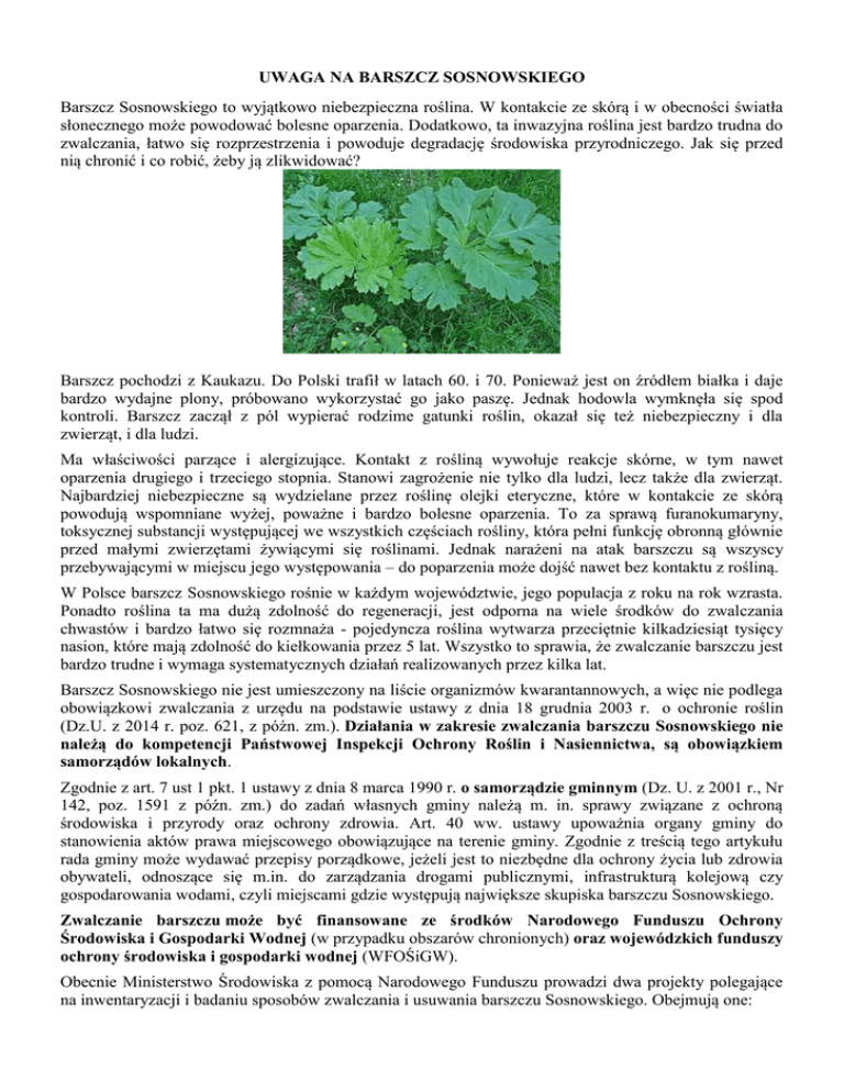 UWAGA NA BARSZCZ SOSNOWSKIEGO Barszcz Sosnowskiego to wyjątkowo niebezpieczna roślina. W kontakcie ze skórą i w obecności światła słonecznego może powodować bolesne oparzenia. Dodatkowo, ta inwazyjna roślina jest bardzo trudna do zwalczania, łatwo się rozprzestrzenia i powoduje degradację środowiska przyrodniczego. Jak się przed nią chronić i co robić, żeby ją zlikwidować? Barszcz pochodzi z Kaukazu. Do Polski trafił w latach 60. i 70. Ponieważ jest on źródłem białka i daje bardzo wydajne plony, próbowano wykorzystać go jako paszę. Jednak hodowla wymknęła się spod kontroli. Barszcz zaczął z pól wypierać rodzime gatunki roślin, okazał się też niebezpieczny i dla zwierząt, i dla ludzi. Ma właściwości parzące i alergizujące. Kontakt z rośliną wywołuje reakcje skórne, w tym nawet oparzenia drugiego i trzeciego stopnia. Stanowi zagrożenie nie tylko dla ludzi, lecz także dla zwierząt. Najbardziej niebezpieczne są wydzielane przez roślinę olejki eteryczne, które w kontakcie ze skórą powodują wspomniane wyżej, poważne i bardzo bolesne oparzenia. To za sprawą furanokumaryny, toksycznej substancji występującej we wszystkich częściach rośliny, która pełni funkcję obronną głównie przed małymi zwierzętami żywiącymi się roślinami. Jednak narażeni na atak barszczu są wszyscy przebywającymi w miejscu jego występowania – do poparzenia może dojść nawet bez kontaktu z rośliną. W Polsce barszcz Sosnowskiego rośnie w każdym województwie, jego populacja z roku na rok wzrasta. Ponadto roślina ta ma dużą zdolność do regeneracji, jest odporna na wiele środków do zwalczania chwastów i bardzo łatwo się rozmnaża - pojedyncza roślina wytwarza przeciętnie kilkadziesiąt tysięcy nasion, które mają zdolność do kiełkowania przez 5 lat. Wszystko to sprawia, że zwalczanie barszczu jest bardzo trudne i wymaga systematycznych działań realizowanych przez kilka lat. Barszcz Sosnowskiego nie jest umieszczony na liście organizmów kwarantannowych, a więc nie podlega obowiązkowi zwalczania z urzędu na podstawie ustawy z dnia 18 grudnia 2003 r. o ochronie roślin (Dz.U. z 2014 r. poz. 621, z późn. zm.). Działania w zakresie zwalczania barszczu Sosnowskiego nie należą do kompetencji Państwowej Inspekcji Ochrony Roślin i Nasiennictwa, są obowiązkiem samorządów lokalnych. Zgodnie z art. 7 ust 1 pkt. 1 ustawy z dnia 8 marca 1990 r. o samorządzie gminnym (Dz. U. z 2001 r., Nr 142, poz. 1591 z późn. zm.) do zadań własnych gminy należą m. in. sprawy związane z ochroną środowiska i przyrody oraz ochrony zdrowia. Art. 40 ww. ustawy upoważnia organy gminy do stanowienia aktów prawa miejscowego obowiązujące na terenie gminy. Zgodnie z treścią tego artykułu rada gminy może wydawać przepisy porządkowe, jeżeli jest to niezbędne dla ochrony życia lub zdrowia obywateli, odnoszące się m.in. do zarządzania drogami publicznymi, infrastrukturą kolejową czy gospodarowania wodami, czyli miejscami gdzie występują największe skupiska barszczu Sosnowskiego. Zwalczanie barszczu może być finansowane ze środków Narodowego Funduszu Ochrony Środowiska i Gospodarki Wodnej (w przypadku obszarów chronionych) oraz wojewódzkich funduszy ochrony środowiska i gospodarki wodnej (WFOŚiGW). Obecnie Ministerstwo Środowiska z pomocą Narodowego Funduszu prowadzi dwa projekty polegające na inwentaryzacji i badaniu sposobów zwalczania i usuwania barszczu Sosnowskiego. Obejmują one: gminy powiatu sanockiego (Program ochrony rodzimej flory powiatu sanockiego przed gatunkami inwazyjnymi oraz ograniczenia ich rozprzestrzeniania się i wnikania w obręb Międzynarodowego Rezerwatu Biosfery Karpaty Wschodnie) – koszt realizacji to 1 219 201 zł, z czego dofinansowanie wynosi 85% kosztów (tj. 1 036 320,85 zł); gminy województwa małopolskiego (Środowisko bez barszczu Sosnowskiego (Heracleum sosnowskyi Manden) – koszt realizacji to 3 798 806 zł, z czego dofinansowanie wynosi 85% kosztów (tj. 3 228 985,00 zł). Walkę z barszczem podjął także WFOŚiGW w Krakowie, który 30 czerwca br. zatwierdził program priorytetowy „Likwidacja barszczu Sosnowskiego na terenie województwa małopolskiego”. Realizacja programu jest zaplanowana na 4 lata (2015-2018), a alokacja środków wynosi łącznie 2 mln zł. Program skierowany jest do jednostek samorządu terytorialnego województwa małopolskiego, które mogą się ubiegać o dotację w wysokości do 90% kosztów kwalifikowanych zadania. Termin składania wniosków w 2015 r. upływa 31 sierpnia, a budżet programu na ten rok wynosi 0,5 mln zł. WFOŚiGW w Szczecinie realizuje program, który finansuje działania związane z usuwaniem barszczu Sosnowskiego na terenie województwa zachodniopomorskiego. Na ten cel przewidziano 300 tys. zł do wykorzystania w 2015 r., z czego wysokość dofinansowania może wynosić maksymalnie do 75% kosztów kwalifikowanych zadania. Program jest przeznaczony dla jednostek samorządu terytorialnego (jst) i jednostek sektora finansów publicznych (jsfp) z województwa zachodniopomorskiego. Wsparciem finansowym mogą zostać objęte grunty, których właścicielami są jst, państwowe jednostki budżetowe, stowarzyszenia, fundacje, osoby fizyczne, osoby prawne, jsfp, kościoły i związki wyznaniowe oraz wspólnoty mieszkaniowe i spółdzielnie (z uwzględnieniem przepisów dotyczących pomocy publicznej). Wnioski są przyjmowane aż do wyczerpania środków przeznaczonych na ten cel na 2015 rok. Eliminacja obcych gatunków inwazyjnych, m.in. barszczu Sosnowskiego, jest priorytetem również dla WFOŚiGW w Gdańsku. Fundusz udzielił dotacji w wysokości 55 tys. zł na realizację zadania „Likwidacja barszczu Sosnowskiego na terenie gminy Kępice - etap I”. Całkowity koszt przedsięwzięcia to 74 tys. zł. Planowane są kolejne działania, aby całkowicie zwalczyć barszcz Sosnowskiego w tej gminie. WFOŚiGW w Poznan