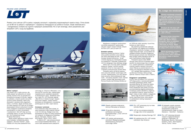 J Historia narodowego przewoźni- ka jest pełna pięknych wspomnień i… podróży. Wiedeń był pierwszym zagranicznym portem, do którego LOT otworzył połączenie tuż po rozpoczęciu działalności w styczniu 1929 roku. Polskie Linie Lotnicze LOT to jedna z najwyżej cenionych i najbardziej rozpoznawalnych marek w kraju. Firma działa już od 80 lat na jednym z największych i najszybciej rozwijających się rynków w Europie. Dzięki doświadczeniu i zaangażowaniu znalazła się w gronie najlepszych przewoźników. Nic w tym dziwnego, skoro pasażerowie pod skrzydłami LOT-u czują się wyjątkowo. lot.com To, czego nie wiedziałeś J W latach 30. XX wieku LOT wykonywał próbne pasażerskie rejsy do Kopenhagi wodnosamolotami z… plaż w Pucku. J Pierwsza polska stewardesa Współpraca z wiodącymi producentami samolotów pasażerskich zaowocowała zakupem nowych maszyn Embraer, których we flocie LOT-u jest już razem 24. Kontekst rynkowy Rynek bez przerwy się zmienia. Z jednej strony podróż samolotem coraz częściej jest realną alternatywą dla kolei, z drugiej znacząco wzrasta konkurencja – do gry o klienta włączają się niskokosztowi europejscy przewoźnicy i luksusowe, bliskowschodnie linie obsługujące trasy dalekiego zasięgu. Oferta LOT-u musi być zatem niezwykle elastyczna. Dbając o komfort podróży pasażerów, firma nie może zapominać o tworzeniu konkurencyjnej cenowo oferty. Niezwykle ważne są również wypracowane przez lata wartości wyróżniające LOT na rynku. Najważniejszą z nich jest identyfikacja wizualna, której podstawą jest logo marki – tak dobrze wszystkim znane. Symbol żurawia i polskiej flagi opracowany przez Romana Duszka oraz Andrzeja Zbrożka już Oferta i wartości Cały zespół LOT-u ciężko pracuje, aby każdy pasażer był zadowolony ze swojej podróży. Atutami firmy są sympatyczna, kompetentna obsługa na lotnisku, wygoda na pokładzie, smaczne posiłki oraz profesjonalna opieka stewardes. Warto więc skorzystać z szerokiej oferty dogodnych lotów z i do Polski. Dzięki wnikliwej analizie siatki połączeń LOT stara się na bieżąco dopasowywać ofertę do aktualnych trendów. Firma uwzględnia oczekiwania pasażerów podróżujących w celach biznesowych i turystycznych. Dziś LOT staje się linią pierwszego wyboru nie tylko dla Polaków, ale i dla mieszkańców Europy Środkowo-Wschodniej. Marka została nagrodzona między innymi przez brytyjską i amerykańską edycję magazynu „Business Traveller”, portal Pasażer.com oraz przez pasażerów Portu 66 SUPERBRANDS POLSKA Lotniczego im. Chopina w Warszawie. Linię lotniczą LOT oceniono jako „zapewniającą najwyższy poziom satysfakcji pasażerów ze świadczonych usług”. Dodatkowo trzeci raz z rzędu PLL LOT otrzymały nagrodę „Best Airline in Eastern Europe” przyznawaną przez magazyn „Global Traveler”, skierowany do amerykańskich menedżerów podróżujących po USA i całym świecie. Innowacje i promocje Firma doskonale zdaje sobie sprawę, że stałe rozszerzanie siatki połączeń stanowi o sile linii lotniczej. Dlatego w tym roku wprowadziła do oferty 10 nowych bezpośrednich połączeń: do Bydgoszczy, Bratysławy, Bejrutu, Damaszku, Erewanu, Kairu, Kaliningradu, Tallina, Tbilisi i Hanoi. To właśnie LOT – jako pierwszy przewoźnik w Europie Środkowo-Wschodniej – uruchomił stałe dalekowschodnie połączenie. od 1978 roku zdobi samoloty i biura firmy rozsiane po całym świecie. Aby zaistnieć w świadomości potencjalnych klientów, LOT angażuje się w działania charytatywne i społeczne, budujące i wzmacniające wizerunek marki. Już od czterech lat udostępnia Wielkiej Orkiestrze Świątecznej Pomocy specjalny samolot, tzw. OrkiestroLOT, który pomaga Jurkowi Owsiakowi dotrzeć do wielu miast podczas finałów Orkiestry. Przewoźnik wspiera także WOŚP, oferując bilety lotnicze na potrzeby organizatorów lub przeznaczając dary na aukcje, m.in. przelot szybowcem z wielokrotnym mistrzem świata w sportach lotniczych Jerzym Makulą czy przelot balonem z mistrzem w tej dyscyplinie Witoldem Filusem. LOT nawiązał także współpracę z Fundacją Dziecięca Fantazja, której pomaga spełniać marzenia chorych dzieci o lataniu. zadebiutowała 27 sierpnia 1945 roku. Była to Aldona Skiergiełło, która na pokładzie samolotu DC-3 odbyła lot z Warszawy do Paryża. Męski reprezentant tej profesji dołączył do załogi LOT-u osiem lat później. J Berlin był jedynym miastem, w którym LOT do 1989 roku miał dwa biura: jedno w Berlinie Wschodnim, drugie w Berlinie Zachodnim. Osiągnięcia i perspektywy W 2012 roku do Polskich Linii Lotniczych LOT dołączą jedne z najnowocześniejszych samolotów pasażerskich świata. Sześć samolotów Boeing 787 Dreamliner będzie obsługiwać długodystansowe połączenia. Polscy pasażerowie jako pierwsi w Europie poczują prawdziwą wygodę podróżowania. Innowacyjny system oświetlenia, wilgotniejsze powietrze w kabinie, lepsze tłumienie drgań i hałasu to tylko niektóre z udogodnień. Oprócz tego dla swoich klientów LOT tworzy nową klasę biznes, która zapewni im podróżowanie według najwyższych standardów. 1920 Otwarto pierwsze połączenie lotnicze Warszawy ze światem 1933 PLL LOT przenoszą się na nowe lotnisko Okęcie 1928 29 grudnia utworzono państwowo-samorządowe przedsiębiorstwo „Linje Lotnicze LOT Sp. z o.o.” 1971 LOT po raz pierwszy przewiózł w ciągu roku milion pasażerów 1931 LOT zostaje pełnoprawnym członkiem Międzynarodowego Stowarzyszenia Transportu Lotniczego (IATA) 2003 26 października PLL LOT zostały członkiem Star Alliance 1992 Rozpoczęto dostawy Boeinga 767 2009 8 listopada ruszyło pierwsze w historii polskiego lotnictwa bezpośrednie połączenie transatlantyckie cargo na trasie Katowice – Hamilton – Katowice 2010 PLL LOT otwierają dziewięć nowych międzynarodowych połączeń z Warszawy: do Bratysławy, Bejrutu, Damaszku