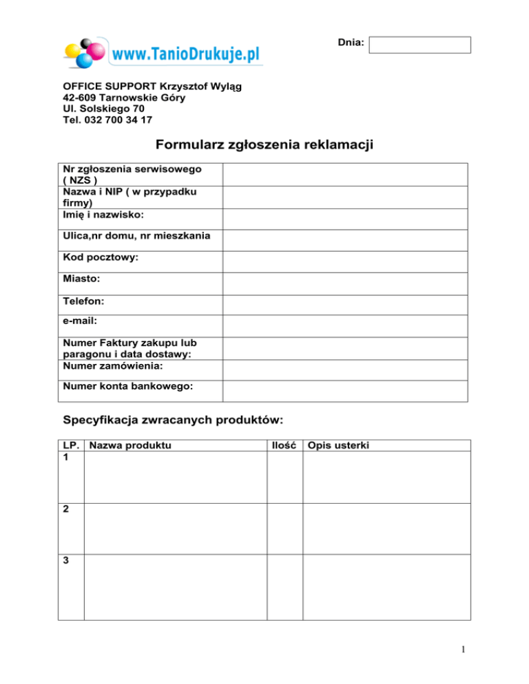 Dnia: OFFICE SUPPORT Krzysztof Wyląg 42-609 Tarnowskie Góry Ul. Solskiego 70 Tel. 032 700 34 17 Formularz zgłoszenia reklamacji Nr zgłoszenia serwisowego ( NZS ) Nazwa i NIP ( w przypadku firmy) Imię i nazwisko: Ulica,nr domu, nr mieszkania Kod pocztowy: Miasto: Telefon: e-mail: Numer Faktury zakupu lub paragonu i data dostawy: Numer zamówienia: Numer konta bankowego: Specyfikacja zwracanych produktów: LP. Nazwa produktu 1 Ilość Opis usterki 2 3 1 Oświadczam, Ŝe zapoznałem się z regulaminem sklepu oraz warunkami reklamacji dostępnymi na stronie www.taniodrukuje.pl Podpis : Reklamacje rozpatrujemy w ciągu 14 dni roboczych. W wyjątkowych przypadkach naprawa moŜe potrwać nawet do 30 dni, jeŜeli do jej rozpatrzenia musimy wysłać produkt poza granice Polski. Aby reklamacja mogła zostać przyjęta do naszego serwisu muszą być spełnione poniŜsze warunki: 1. Zanim złoŜysz reklamację, przeczyść dysze w drukarce za pomocą oprogramowania dostarczonego wraz z drukarką i sprawdź jeszcze raz poprawność wydruku. 2. KaŜdy kartridŜ powinien być raz na 2 tygodnie „przedrukowany”, co zapobiega jego zasychaniu w drukarce. 3. W produkcie, który jest długo nie uŜywany, moŜe dojść do zaschnięcia głowicy. W celu udroŜnienia głowicę naleŜy zamoczyć wyłącznie w płynie do udraŜniania głowic lub w ciepłej wodzie destylowanej. JeŜeli 3 powyŜsze warunki zostały spełnione, a mimo to wydruk jest nie prawidłowy prosimy stosować się do zaleceń podanych poniŜej: 1. Prosimy nie zrywać plomb gwarancyjnych i innych naklejek producenta, z wyłączeniem naklejek określających model tuszu (dotyczy tylko i wyłącznie produktów OEM). 2. KaŜdy kartridŜ musi mieć przyklejoną naklejkę, określającą jego rodzaj. Brak tej naklejki powoduje wysychanie tuszu, co prowadzi do niepoprawnego wydruku. 3. Bardzo waŜne tusz kolorowy: jeŜeli reklamacja dotyczy jakości wydruku (nie drukuje któryś z kolorów lub drukuje niepoprawnie) to prosimy o załączenie testowego wydruku (Jest to warunek konieczny do przyjęcia reklamacji); 4. Przy składaniu reklamacji dotyczącej kartridŜa kolorowego Klient powinien określić, jakie kolory pojawiły się przy pierwszym wydruku (są 3 podstawowe barwy). JeŜeli były one poprawne, to przyczyną zmieszania kolorów było nieprawidłowe przechowywanie kartridŜa, np. umieszczenie kartridŜa na materiale chłonącym, np. chusteczce higienicznej. 2 5. Czarny kartridŜ zaraz po wyjęciu z drukarki powinien mieć przyklejoną oryginalną taśmę zerwaną wcześniej przy pierwszym włoŜeniu do urządzenia. Brak tej taśmy powoduje niepoprawny wydruk. Proszę nie stosować róŜnego rodzaju taśm klejących mających zastosowanie biurowe. UWAGA! Proszę tego nie stosować przy kartridŜach kolorowych, gdyŜ powoduje to zmieszanie kolorów! W takim przypadku reklamacja zostanie odrzucona. 6. KaŜdy kartridŜ pozbawiony taśmy lub klipa musi być umieszczony w drukarce! KartridŜe kolorowe posiadające klip wymagają zaraz po wyjęciu z drukarki włoŜenia do tego samego klipa! (dotyczy to tylko i wyłącznie klipów z wkładem GUMOWYM, tusze 100% new posiadają klipy z wkładem GĄBKOWYM, który w przypadku braku taśmy zabezpieczającej powoduje zmieszanie kolorów. W takim przypadku prosimy o oczyszczenie dysz za pomocą miękkiego ręcznika papierowego i pozostawienie tuszu bez klipa! NaleŜy tak zabezpieczyć tusz na czas transportu, aby dysze nie stykały się z jakąkolwiek powierzchnią). 7. Produkty oryginalne naleŜy dostarczać w ich oryginalnych opakowaniach; Gwarancji nie podlegają: uszkodzenia mechaniczne produktów; produkty z zerwanymi naklejkami identyfikacyjnymi i plombami gwarancyjnymi; produkty oryginalne nie posiadające oryginalnych opakowań; produkty zuŜyte. Następnie prosimy o bezpieczne spakowanie produktu i oznaczenie przesyłki numerem zgłoszenia serwisowego oraz o załączenie wymaganych dokumentów Faktura VAT , Formularza reklamacji dostępny do pobranie ze strony www.taniodrukuje.pl oraz wydruków testowych celem dokumentacji złej jakości wydruku. Wysyłka produktu do naszego serwisu, odbywa się na Państwa koszt - który rekompensujemy kuponem zniŜkowym na następne zakupy. Nie odbieramy paczek wysyłanych za pobraniem Moment rozpoczęcia naprawy zaczyna się w dniu otrzymania przez nasz serwis paczki a okres naprawy naleŜy liczyć wyłączając dni wolne od pracy. Po pozytywnym rozpatrzeniu reklamacji, wysyłamy go do Państwa na swój koszt. Informujemy o tym zdarzeniu e-mail-em. W przypadku braku pozytywnego rozpatrzenia reklamacji, odsyłamy go na Państwa koszt. Uwaga: Nie zastosowanie się powyŜszych zasad obsługi, moŜe powodować odmowę przyjęcia reklamacji do serwisu. Reklamującemu przysługuje prawo do wymiany produktu na nowy, posiadający te same lub zbliŜone parametry techniczne i eksploatacyjne, w przypadku: 3 1. jeŜeli w okresie gwarancji TANIODRUKUJE.PL dokona trzech napraw, a produkt nadal będzie wykazywał wady uniemoŜliwiające uŜywanie go zgodnie z przeznaczeniem; 2. jeŜeli TANIODRUKUJE.PL uzna, Ŝe usunięcie wady nie jest moŜliwe lub nie jest moŜliwe w terminie określonym warunkach gwarancji. 4