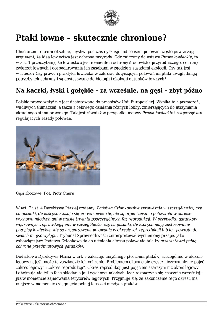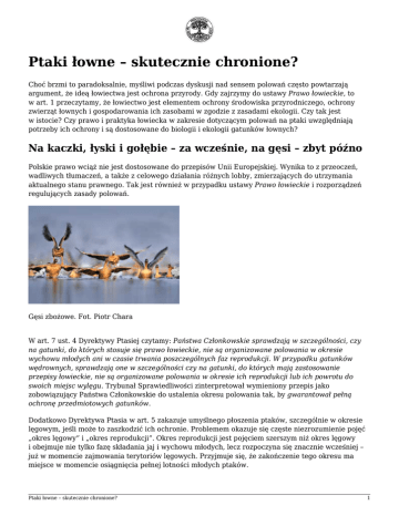 Ptaki łowne – skutecznie chronione? Choć brzmi to paradoksalnie, myśliwi podczas dyskusji nad sensem polowań często powtarzają argument, że ideą łowiectwa jest ochrona przyrody. Gdy zajrzymy do ustawy Prawo łowieckie, to w art. 1 przeczytamy, że łowiectwo jest elementem ochrony środowiska przyrodniczego, ochrony zwierząt łownych i gospodarowania ich zasobami w zgodzie z zasadami ekologii. Czy tak jest w istocie? Czy prawo i praktyka łowiecka w zakresie dotyczącym polowań na ptaki uwzględniają potrzeby ich ochrony i są dostosowane do biologii i ekologii gatunków łownych? Na kaczki, łyski i gołębie – za wcześnie, na gęsi – zbyt późno Polskie prawo wciąż nie jest dostosowane do przepisów Unii Europejskiej. Wynika to z przeoczeń, wadliwych tłumaczeń, a także z celowego działania różnych lobby, zmierzających do utrzymania aktualnego stanu prawnego. Tak jest również w przypadku ustawy Prawo łowieckie i rozporządzeń regulujących zasady polowań. Gęsi zbożowe. Fot. Piotr Chara W art. 7 ust. 4 Dyrektywy Ptasiej czytamy: Państwa Członkowskie sprawdzają w szczególności, czy na gatunki, do których stosuje się prawo łowieckie, nie są organizowane polowania w okresie wychowu młodych ani w czasie trwania poszczególnych faz reprodukcji. W przypadku gatunków wędrownych, sprawdzają one w szczególności czy na gatunki, do których mają zastosowanie przepisy łowieckie, nie są organizowane polowania w okresie ich reprodukcji lub ich powrotu do swoich miejsc wylęgu. Trybunał Sprawiedliwości zinterpretował wymieniony przepis jako zobowiązujący Państwa Członkowskie do ustalenia okresu polowania tak, by gwarantował pełną ochronę przedmiotowych gatunków. Dodatkowo Dyrektywa Ptasia w art. 5 zakazuje umyślnego płoszenia ptaków, szczególnie w okresie lęgowym, jeśli może to zaszkodzić ich ochronie. Problemem okazuje się częste niezrozumienie pojęć „okres lęgowy” i „okres reprodukcji”. Okres reprodukcji jest pojęciem szerszym niż okres lęgowy i obejmuje nie tylko fazę składania jaj i wychowu młodych, lecz rozpoczyna się znacznie wcześniej – już w momencie zajmowania terytoriów lęgowych. Przyjmuje się, że zakończenie tego okresu ma miejsce w momencie osiągnięcia pełnej lotności młodych ptaków. Ptaki łowne – skutecznie chronione? 1 Wśród ogromnych stad gęsi ilościowy prym wiodą gęsi zbożowe i widoczne na zdjęciu białoczelne. Fot. Piotr Chara 15 sierpnia rozpoczyna się sezon łowiecki na większość gatunków ptaków łownych – kaczki, łyski oraz grzywacza. Paradoksalnie, najwcześniej zaczyna się okres polowań na gatunki o najdłuższym okresie reprodukcji. W polskich warunkach okres wychowu młodych u kaczek (zwłaszcza grążyc – głowienki i czernicy) oraz łysek kończy się zazwyczaj dopiero w pierwszej dekadzie września, a czasami nawet dopiero pod koniec tego miesiąca. Sytuacja taka, poza łownymi gatunkami kaczek i łyskami, dotyczy także gatunków chronionych – pozostałych kaczek, perkozów, łabędzi i rybitw. Choć teoretycznie do ptaków chronionych się nie strzela, to w wyniku płoszenia przez myśliwych i aportujące psy może dochodzić do znacznych strat w lęgach tych ptaków. Problem ten dotyczy także grzywaczy, które odbywają 3, a nawet 4 lęgi w roku, a w sierpniu i na początku września regularnie opiekują się nielotnymi młodymi. Większość myśliwych, ale także Ministerstwo Środowiska, nie widzą potrzeby zmiany prawa. Tłumaczą, że sierpniowe i wrześniowe lęgi ptaków to wydarzenie wyjątkowe i marginalne, spowodowane anomaliami pogodowymi i zmianami klimatu. Jest to ewidentnie niezgodne ze stanem wiedzy naukowej – to zjawisko powszechne, występujące co roku na terenie całej Polski. Trzeba mieć także na uwadze fakt, że zgodnie z wytycznymi Komisji Europejskiej, dotyczącymi polowań na ptaki, konieczne jest uwzględnianie wszelkich zmian w terminach migracji oraz długości trwania okresu reprodukcji, jakie mogą wystąpić na skutek zmian klimatu oraz w wyniku innych niekorzystnych oddziaływań na środowisko, np. ekspansji obcych geograficznie gatunków ssaków drapieżnych, powodujących straty w lęgach i konieczność ich powtarzania. W Polsce można polować na trzy gatunki gęsi – gęś zbożową, białoczelną oraz gęgawę. Ten ostatni gatunek gniazduje w naszym kraju, pozostałe lęgną się na północy Europy i w Rosji. W okresie przelotów i zimowania, zwłaszcza w zachodniej Polsce, tworzą one często wielotysięczne mieszane stada. Zgodnie z obowiązującym obecnie rozporządzeniem Ministra Środowiska z dnia 16 marca 2005 r. w sprawie określenia okresów polowań na zwierzęta łowne, na większości terytorium Polski okres polowań na te trzy gatunki trwa od 1 września do 21 grudnia, czyli w czasie jesiennej wędrówki na zimowiska i na początku sezonu zimowania. Jednak na terenie województw dolnośląskiego, lubuskiego, wielkopolskiego i zachodniopomorskiego okres polowań na gęsi zbożowe i białoczelne jest wydłużony do 31 stycznia, a na gęgawy do 15 stycznia. Ministerstwo Środowiska, przyjmując takie terminy, argumentowało, że myśliwi zgodnie z przepisami strzelają tylko do rozpoznanego celu, więc przypadkowe zastrzelenie gęgawy w drugiej połowie stycznia, w wyniku pomylenia jej z gęsią zbożową lub białoczelną nie będzie możliwe na gruncie obowiązującego w Polsce prawa. Ptaki łowne – skutecznie chronione? 2 Przyrodnicy, a nieoficjalnie także niektórzy bardziej światli myśliwi nie wierzą w cudowną moc sprawczą tego przepisu. Poziom wiedzy na temat gatunków łownych, ich biologii lęgowej, ekologii, a także rozpoznawania poszczególnych gatunków przez myśliwych jest generalnie na bardzo niskim poziomie. Strzelanie o zmroku lub podczas porannej mgły do mieszanego stada przelatujących gęsi i twierdzenie, że strzela się do „rozpoznanego celu” jest w wi