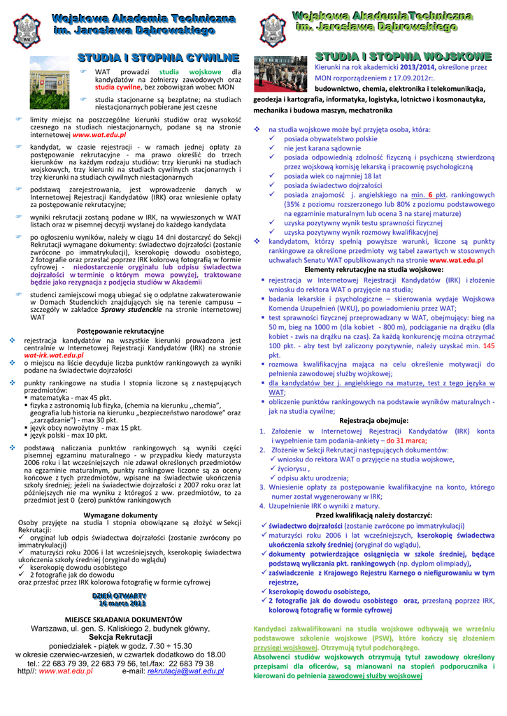 W Wo ojjssk ko ow wa aA Ak ka ad de em miia aT Te ec ch hn niic czzn na a iim . J a r o s ł a w a D ą b r o w s k i e g o m. Jarosława Dąbrowskiego W Wo ojjssk ko ow wa aA Ak ka ad de em miia aT Te ec ch hn niic czzn na a iim . J a r o s ł a w a D ą b r o w s k i e g o m. Jarosława Dąbrowskiego S ST TU UD DIIA A II S ST TO OP PN NIIA AC CY YW WIIL LN NE E WAT prowadzi studia wojskowe dla kandydatów na żołnierzy zawodowych oraz studia cywilne, bez zobowiązań wobec MON studia stacjonarne są bezpłatne; na studiach niestacjonarnych pobierane jest czesne limity miejsc na poszczególne kierunki studiów oraz wysokość czesnego na studiach niestacjonarnych, podane są na stronie internetowej www.wat.edu.pl kandydat, w czasie rejestracji - w ramach jednej opłaty za postępowanie rekrutacyjne - ma prawo określić do trzech kierunków na każdym rodzaju studiów: trzy kierunki na studiach wojskowych, trzy kierunki na studiach cywilnych stacjonarnych i trzy kierunki na studiach cywilnych niestacjonarnych podstawą zarejestrowania, jest wprowadzenie danych w Internetowej Rejestracji Kandydatów (IRK) oraz wniesienie opłaty za postępowanie rekrutacyjne; wyniki rekrutacji zostaną podane w IRK, na wywieszonych w WAT listach oraz w pisemnej decyzji wysłanej do każdego kandydata po ogłoszeniu wyników, należy w ciągu 14 dni dostarczyć do Sekcji Rekrutacji wymagane dokumenty: świadectwo dojrzałości (zostanie zwrócone po immatrykulacji), kserokopię dowodu osobistego, 2 fotografie oraz przesłać poprzez IRK kolorową fotografią w formie cyfrowej - niedostarczenie oryginału lub odpisu świadectwa dojrzałości w terminie o którym mowa powyżej, traktowane będzie jako rezygnacja z podjęcia studiów w Akademii studenci zamiejscowi mogą ubiegać się o odpłatne zakwaterowanie w Domach Studenckich znajdujących się na terenie campusu – szczegóły w zakładce Sprawy studenckie na stronie internetowej WAT Postępowanie rekrutacyjne rejestracja kandydatów na wszystkie kierunki prowadzona jest centralnie w Internetowej Rejestracji Kandydatów (IRK) na stronie wat-irk.wat.edu.pl o miejscu na liście decyduje liczba punktów rankingowych za wyniki podane na świadectwie dojrzałości punkty rankingowe na studia I stopnia liczone są z następujących przedmiotów: matematyka - max 45 pkt. fizyka z astronomią lub fizyka, (chemia na kierunku ,,chemia”, geografia lub historia na kierunku „bezpieczeństwo narodowe” oraz ,,zarządzanie”) - max 30 pkt. język obcy nowożytny - max 15 pkt. język polski - max 10 pkt. podstawą naliczania punktów rankingowych są wyniki części pisemnej egzaminu maturalnego - w przypadku kiedy maturzysta 2006 roku i lat wcześniejszych nie zdawał określonych przedmiotów na egzaminie maturalnym, punkty rankingowe liczone są za oceny końcowe z tych przedmiotów, wpisane na świadectwie ukończenia szkoły średniej; jeżeli na świadectwie dojrzałości z 2007 roku oraz lat późniejszych nie ma wyniku z któregoś z ww. przedmiotów, to za przedmiot jest 0 (zero) punktów rankingowych Wymagane dokumenty Osoby przyjęte na studia I stopnia obowiązane są złożyć w Sekcji Rekrutacji: oryginał lub odpis świadectwa dojrzałości (zostanie zwrócony po immatrykulacji) maturzyści roku 2006 i lat wcześniejszych, kserokopię świadectwa ukończenia szkoły średniej (oryginał do wglądu) kserokopię dowodu osobistego 2 fotografie jak do dowodu oraz przesłać przez IRK kolorowa fotografię w formie cyfrowej D D Ń O W DZZZIIIEEEŃ ŃO OTTTW WAAARRRTTTYYY 111666m m maaarrrcccaaa222000111333 MIEJSCE SKŁADANIA DOKUMENTÓW Warszawa, ul. gen. S. Kaliskiego 2, budynek główny, Sekcja Rekrutacji poniedziałek - piątek w godz. 7.30 ÷ 15.30 w okresie czerwiec-wrzesień, w czwartek dodatkowo do 18.00 tel.: 22 683 79 39, 22 683 79 56, tel./fax: 22 683 79 38 http//: www.wat.edu.pl e-mail: [email protected] S ST TU UD DIIA A II S ST TO OP PN NIIA AW WO OJ JS SK KO OW WE E Kierunki na rok akademicki 2013/2014, określone przez MON rozporządzeniem z 17.09.2012r:. budownictwo, chemia, elektronika i telekomunikacja, geodezja i kartografia, informatyka, logistyka, lotnictwo i kosmonautyka, mechanika i budowa maszyn, mechatronika na studia wojskowe może być przyjęta osoba, która: posiada obywatelstwo polskie nie jest karana sądownie posiada odpowiednią zdolność fizyczną i psychiczną stwierdzoną przez wojskową komisję lekarską i pracownię psychologiczną posiada wiek co najmniej 18 lat posiada świadectwo dojrzałości posiada znajomość j. angielskiego na min. 6 pkt. rankingowych (35% z poziomu rozszerzonego lub 80% z poziomu podstawowego na egzaminie maturalnym lub ocena 3 na starej maturze) uzyska pozytywny wynik testu sprawności fizycznej uzyska pozytywny wynik rozmowy kwalifikacyjnej kandydatom, którzy spełnią powyższe warunki, liczone są punkty rankingowe za określone przedmioty wg tabel zawartych w stosownych uchwałach Senatu WAT opublikowanych na stronie www.wat.edu.pl Elementy rekrutacyjne na studia wojskowe: rejestracja w Internetowej Rejestracji Kandydatów (IRK) i złożenie wniosku do rektora WAT o przyjęcie na studia; badania lekarskie i psychologiczne – skierowania wydaje Wojskowa Komenda Uzupełnień (WKU), po powiadomieniu przez WAT; test sprawności fizycznej przeprowadzany w WAT, obejmujący: bieg na 50 m, bieg na 1000 m (dla kobiet - 800 m), podciąganie na drążku (dla kobiet - zwis na drążku na czas). Za każdą konkurencję można otrzymać 100 pkt. - aby test był zaliczony pozytywnie, należy uzyskać min. 145 pkt. rozmowa kwalifikacyjna mająca na celu określenie motywacji do pełnienia zawodowej służby wojskowej; dla kandydatów bez j. angielskiego na maturze, test z tego języka w WAT; obliczenie punktów rankingowych na podstawie wyników maturalnych jak na studia cywilne; Rejestracja obejmuje: 1. Założenie w Internetowej Rejestracji Kandydatów (IRK) konta i wypełnienie tam podania-a