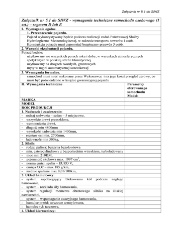 Załącznik nr 5.1 do SIWZ Załącznik nr 5.1 do SIWZ - wymagania techniczne samochodu osobowego (1 szt.) – segment D lub E I. Wymagania ogólne. 1. Przeznaczenie pojazdu. Pojazd wykorzystywany będzie podczas realizacji zadań Państwowej Służby Hydrologiczno–Meteorologicznej, w zakresie transportu towarów i osób. Konstrukcja pojazdu musi zapewniać bezpieczny przewóz 5 osób. 2. Warunki eksploatacji pojazdu. Pojazd będzie: użytkowany we wszystkich porach roku i doby, w warunkach atmosferycznych spotykanych w polskiej strefie klimatycznej użytkowany na drogach twardych, gruntowych myty w myjni automatycznej szczotkowej 3. Wymagania formalne. samochód musi mieć wykonany przez Wykonawcę i na jego koszt przegląd zerowy, co musi być potwierdzone w książce gwarancyjnej pojazdu II. Wymagania techniczne Parametry oferowanego samochodu Model: MARKA MODEL ROK PRODUKCJI 1. Nadwozie i zawieszenie: - rodzaj nadwozia – sedan – 5 miejscowe, - wszystkie drzwi przeszklone, - wzmocnienia drzwi, - długość min 4800mm - wysokość nadwozia min 1400mm, - rozstaw osi min. 2700mm, - ładowność min 500kg, 2. Silnik: - rodzaj paliwa: benzyna bezołowiowa - min. czterocylindrowy z bezpośrednim wtryskiem, turboładowany - moc min 210KM, - pojemność skokowa max. 1997 cm3, - norma emisji spalin – EURO V, - emisja CO2 – max 185 g/km, - średnie spalanie max 8,0 l/100km, 3. Układ hamulcowy: - system zapobiegający blokowaniu kół podczas nagłego hamowania, - system – rozkładu siły hamowania, - system regulacji momentu obrotowego silnika na śliskiej nawierzchni, - system – wspomaganie awaryjnego hamowania, - hamulce przód: tarczowe wentylowane, - hamulce tył: tarczowe, 4. Układ kierowniczy: Załącznik nr 5.1 do SIWZ - system stabilizacji toru jazdy, - wspomaganie układu kierowniczego, - regulacja kolumny kierowniczej, co najmniej: góra – dół, - skórzana kierownica, 5. Układ napędowy: - napęd na przednią lub tylną oś, - automatyczna lub manualna skrzynia biegów, - liczba biegów: min 6 biegów do przodu i 1 do tyłu, - system optymalizacji przyczepności podczas przyspieszania, 6. Bezpieczeństwo: - pasy bezpieczeństwa przednich foteli trzypunktowe, bezwładnościowe z regulacją wysokości mocowania, - pasy bezpieczeństwa na tylnych siedzeniach trzypunktowe, bezwładnościowe, - sygnalizator nie zapiętych pasów bezpieczeństwa – fotele przednie, - poduszki powietrzne czołowe dla kierowcy i pasażera, - poduszki boczne, co najmniej dla kierowcy i pasażera, - kurtyny powietrzne - blokada przeciwuruchomieniowa (immobiliser), - zdalnie sterowany centralny zamek, - autoalarm, 7. Koła: - tarcze kół aluminiowe min 17 cali z bezdętkowym ogumieniem letnim (w tym pełno wymiarowe aluminiowe koło zapasowe) – szt. 5, - dodatkowy komplet tarcz kół aluminiowych min 16 cali z bezdętkowym, kierunkowym ogumieniem zimowym (w tym pełno wymiarowe aluminiowe koło zapasowe) – szt. 5, - opony nie starsze niż 9 miesięcy, 8. Ergonomia: - regulacja fotela kierowcy, co najmniej w dwóch płaszczyznach (przód – tył, góra – dół) oraz fotela pasażera (co najmniej przód tył), - siedzenia tylne dzielone i składane, - podgrzewane fotele przednie, 9. Oświetlenie i wyposażenie elektryczne: - reflektory przednie biksenonowe, - światła do jazdy dziennej LED, - światła przeciwmgielne przednie, wbudowane w zderzak lub spojler lub światła przeciwmgielne zintegrowane z lampami zespolonymi, - oświetlenie wnętrza pojazdu z funkcją włączenia przy otwartych drzwiach, możliwością wyłączenia tej funkcji oraz możliwością włączenia tego światła na stałe, - oświetlenie wnętrza schowka w desce rozdzielczej, - oświetlenie przestrzeni bagażowej, - automatyczne włączanie świateł mijania, - sygnalizator niewyłączonych świateł zewnętrznych, Załącznik nr 5.1 do SIWZ - dodatkowe trzecie światło STOP, 10. Inne urządzenia i wyposażenie dodatkowe: - elektrycznie opuszczane i podnoszone szyby drzwi, - ogrzewana tylna szyba, - sygnalizator niedomkniętych drzwi, - lusterka boczne podgrzewane, regulowane elektrycznie, - obrotomierz, - instalacja radiowa, min. 6 głośników oraz radioodtwarzacz z odtwarzaczem CD i MP3, - schowek w desce rozdzielczej po stronie pasażera, - kieszenie w drzwiach przednich, - podłokietnik przedni ze schowkiem, - gniazdo 12V w konsoli centralnej, - klimatyzacja automatyczna dwustrefowa, - komputer pokładowy, - tempomat, - czujniki parkowania przód i tył z kamerą cofania, - wycieraczki przednie z czujnikiem deszczu, - autoalarm, - zestaw głośnomówiący Bluetooth, - system nawigacji satelitarnej w desce rozdzielczej, - komplet fabrycznych dywaników, - gaśnica proszkowa typu samochodowego o masie środka gaśniczego co najmniej 1 kg, posiadająca odpowiedni certyfikat CNBOP, - trójkąt ostrzegawczy zgodnie z Dz.U nr 32 poz. 262 z dnia 31 grudnia 2002 roku, w sprawie warunków technicznych pojazdów oraz zakresu i niezbędnego wyposażenia, - zestaw podręcznych narzędzi, w którego skład wchodzi, co najmniej: podnośnik samochodowy, klucz do kół, wkrętak dwustronny (gwiazdkowy i płaski), klucz umożliwiający odłączenie biegunów akumulatora, - apteczka samochodowa, - zestaw zapasowych żarówek i bezpieczników, co najmniej po jednej sztuce na każdy typ zastosowany w samochodzie, 11. Warunki gwarancji: - gwarancja na zespoły i podzespoły mechaniczne, elektryczne i elektroniczne minimum 36 miesięcy z limitem 120 000 km, - gwarancja na powłokę lakierniczą minimum 36 miesięcy - gwarancja na perforację elementów nadwozia minimum 72 miesiące, - codzienne mycie samochodów w myjni automatycznej szczotkowej nie może skutkować utratą ani ograniczeniem gwarancji, 12. Rok produkcji: - pojazd fabrycznie nowy, bieżący dla danego roku dostawy, 13. Kolor nadwozia i oznakowanie: a) samochód oznakowany dla Państwowej Służby Hydrologiczno Meteorologicznej musi posiadać oznakowanie naklejo