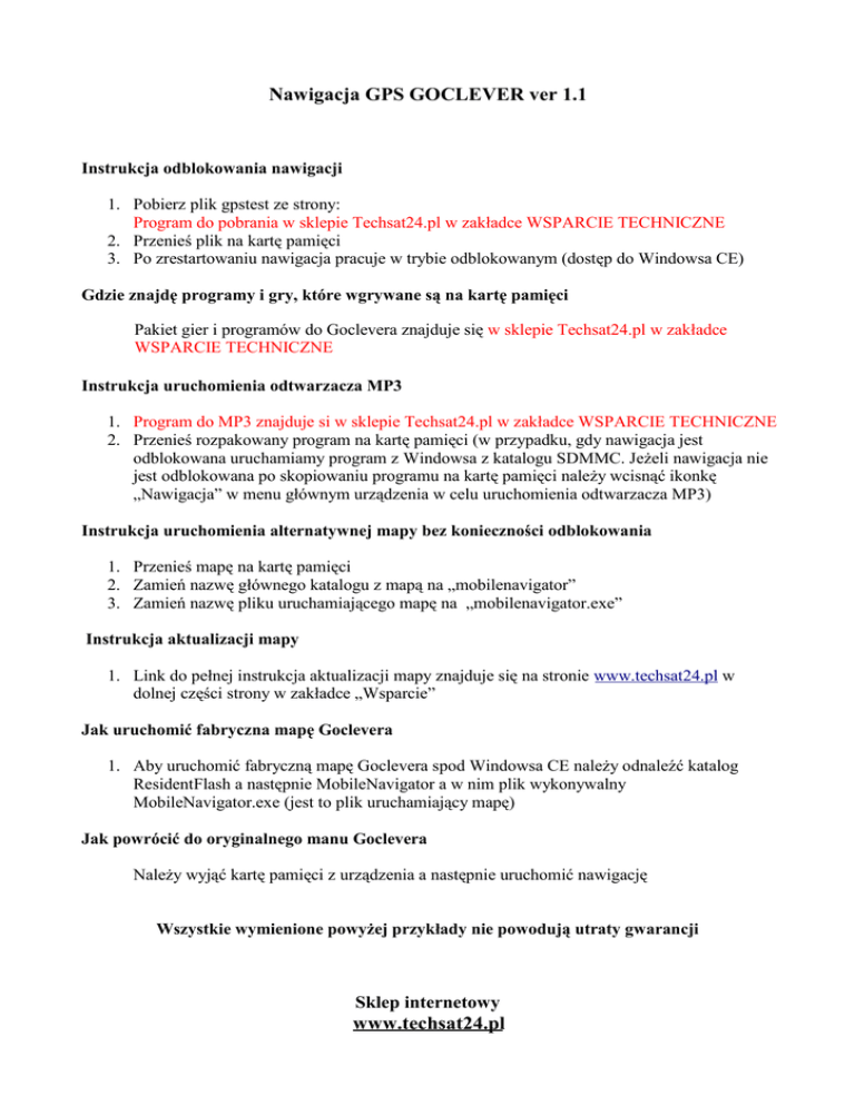 Nawigacja GPS GOCLEVER ver 1.1 Instrukcja odblokowania nawigacji 1. Pobierz plik gpstest ze strony: Program do pobrania w sklepie Techsat24.pl w zakładce WSPARCIE TECHNICZNE 2. Przenieś plik na kartę pamięci 3. Po zrestartowaniu nawigacja pracuje w trybie odblokowanym (dostęp do Windowsa CE) Gdzie znajdę programy i gry, które wgrywane są na kartę pamięci Pakiet gier i programów do Goclevera znajduje się w sklepie Techsat24.pl w zakładce WSPARCIE TECHNICZNE Instrukcja uruchomienia odtwarzacza MP3 1. Program do MP3 znajduje si w sklepie Techsat24.pl w zakładce WSPARCIE TECHNICZNE 2. Przenieś rozpakowany program na kartę pamięci (w przypadku, gdy nawigacja jest odblokowana uruchamiamy program z Windowsa z katalogu SDMMC. Jeżeli nawigacja nie jest odblokowana po skopiowaniu programu na kartę pamięci należy wcisnąć ikonkę „Nawigacja” w menu głównym urządzenia w celu uruchomienia odtwarzacza MP3) Instrukcja uruchomienia alternatywnej mapy bez konieczności odblokowania 1. Przenieś mapę na kartę pamięci 2. Zamień nazwę głównego katalogu z mapą na „mobilenavigator” 3. Zamień nazwę pliku uruchamiającego mapę na „mobilenavigator.exe” Instrukcja aktualizacji mapy 1. Link do pełnej instrukcja aktualizacji mapy znajduje się na stronie www.techsat24.pl w dolnej części strony w zakładce „Wsparcie” Jak uruchomić fabryczna mapę Goclevera 1. Aby uruchomić fabryczną mapę Goclevera spod Windowsa CE należy odnaleźć katalog ResidentFlash a następnie MobileNavigator a w nim plik wykonywalny MobileNavigator.exe (jest to plik uruchamiający mapę) Jak powrócić do oryginalnego manu Goclevera Należy wyjąć kartę pamięci z urządzenia a następnie uruchomić nawigację Wszystkie wymienione powyżej przykłady nie powodują utraty gwarancji Sklep internetowy www.techsat24.pl