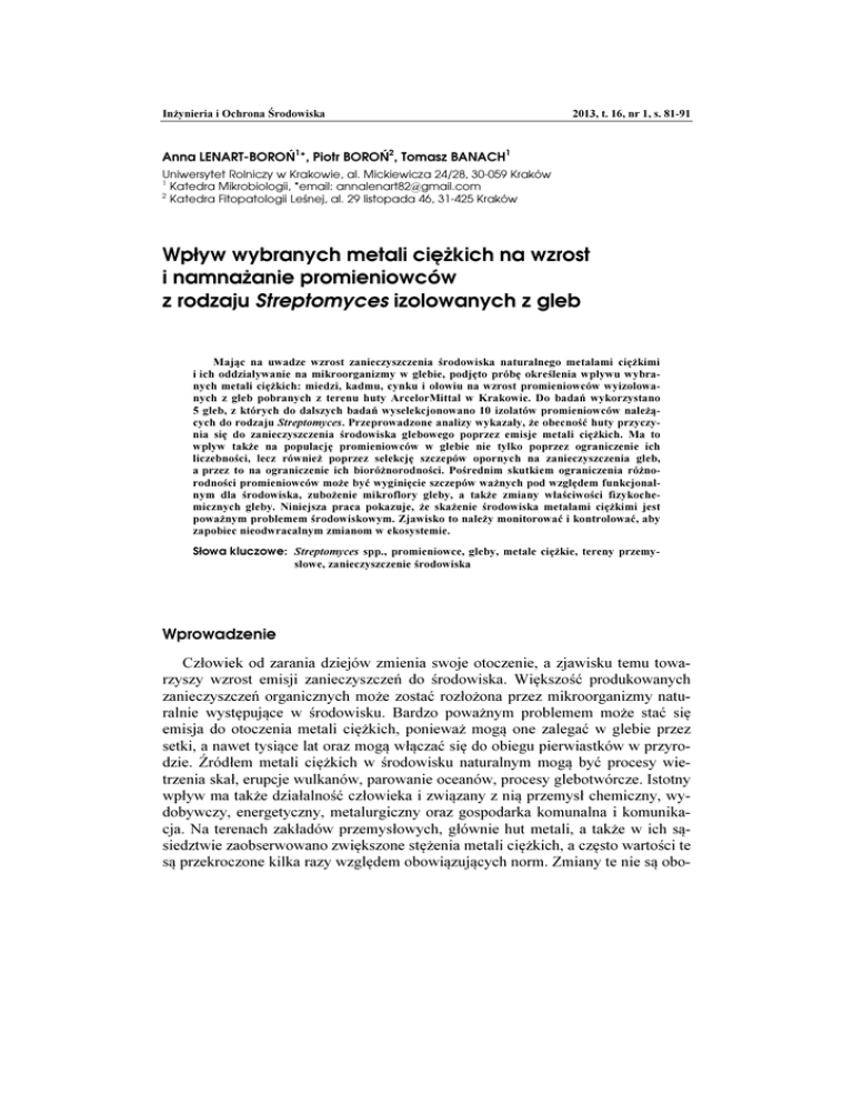 Inżynieria i Ochrona Środowiska 2013, t. 16, nr 1, s. 81-91 Anna LENART-BOROŃ1*, Piotr BOROŃ2, Tomasz BANACH1 Uniwersytet Rolniczy w Krakowie, al. Mickiewicza 24/28, 30-059 Kraków 1 Katedra Mikrobiologii, *email: [email protected] 2 Katedra Fitopatologii Leśnej, al. 29 listopada 46, 31-425 Kraków Wpływ wybranych metali ciężkich na wzrost i namnażanie promieniowców z rodzaju Streptomyces izolowanych z gleb Mając na uwadze wzrost zanieczyszczenia środowiska naturalnego metalami ciężkimi i ich oddziaływanie na mikroorganizmy w glebie, podjęto próbę określenia wpływu wybranych metali ciężkich: miedzi, kadmu, cynku i ołowiu na wzrost promieniowców wyizolowanych z gleb pobranych z terenu huty ArcelorMittal w Krakowie. Do badań wykorzystano 5 gleb, z których do dalszych badań wyselekcjonowano 10 izolatów promieniowców należących do rodzaju Streptomyces. Przeprowadzone analizy wykazały, że obecność huty przyczynia się do zanieczyszczenia środowiska glebowego poprzez emisje metali ciężkich. Ma to wpływ także na populację promieniowców w glebie nie tylko poprzez ograniczenie ich liczebności, lecz również poprzez selekcję szczepów opornych na zanieczyszczenia gleb, a przez to na ograniczenie ich bioróżnorodności. Pośrednim skutkiem ograniczenia różnorodności promieniowców może być wyginięcie szczepów ważnych pod względem funkcjonalnym dla środowiska, zubożenie mikroflory gleby, a także zmiany właściwości fizykochemicznych gleby. Niniejsza praca pokazuje, że skażenie środowiska metalami ciężkimi jest poważnym problemem środowiskowym. Zjawisko to należy monitorować i kontrolować, aby zapobiec nieodwracalnym zmianom w ekosystemie. Słowa kluczowe: Streptomyces spp., promieniowce, gleby, metale ciężkie, tereny przemysłowe, zanieczyszczenie środowiska Wprowadzenie Człowiek od zarania dziejów zmienia swoje otoczenie, a zjawisku temu towarzyszy wzrost emisji zanieczyszczeń do środowiska. Większość produkowanych zanieczyszczeń organicznych może zostać rozłożona przez mikroorganizmy naturalnie występujące w środowisku. Bardzo poważnym problemem może stać się emisja do otoczenia metali ciężkich, ponieważ mogą one zalegać w glebie przez setki, a nawet tysiące lat oraz mogą włączać się do obiegu pierwiastków w przyrodzie. Źródłem metali ciężkich w środowisku naturalnym mogą być procesy wietrzenia skał, erupcje wulkanów, parowanie oceanów, procesy glebotwórcze. Istotny wpływ ma także działalność człowieka i związany z nią przemysł chemiczny, wydobywczy, energetyczny, metalurgiczny oraz gospodarka komunalna i komunikacja. Na terenach zakładów przemysłowych, głównie hut metali, a także w ich sąsiedztwie zaobserwowano zwiększone stężenia metali ciężkich, a często wartości te są przekroczone kilka razy względem obowiązujących norm. Zmiany te nie są obo- 82 A. Lenart-Boroń, P. Boroń, T. Banach jętne dla środowiska [1]. Metale ciężkie emitowane do środowiska ulegają w glebach różnym transformacjom w zależności od ich typu, zawartości koloidów organicznych i nieorganicznych, zawartości związków pochodzących z rozkładu biomasy, metabolitów wtórnych czynnie wydzielanych przez systemy korzeniowe roślin oraz przez mikroorganizmy, w zależności od odczynu czy zawartości wody [2]. Metale ciężkie mogą zaburzać funkcjonowanie poszczególnych enzymów glebowych, ważnych ze względu na aktywny udział w rozkładzie biomasy [3]. Wysokie stężenia miedzi w glebie zmniejszają aktywność enzymów, takich jak dehydrogenaza, ureaza, fosfataza kwaśna i fosfataza alkaliczna [4]. Hamują także namnażanie się mikroorganizmów w glebie, zwłaszcza promieniowców. Wykazano, że wyższe stężenia cynku powodowały zahamowanie ich sporulacji [5]. Wrażliwość promieniowców z rodzaju Streptomyces na metale ciężkie zależy od fazy rozwojowej: wegetatywnej lub generatywnej. Miedź nie wpływa na procesy kiełkowania konidiów promieniowców, ponieważ jest ważnym mikroelementem. Jej obecność jest niezbędna do prawidłowego funkcjonowania oksydazy cytochromowej. Natomiast kadm ma odmienne działanie, wyraźnie hamuje przechodzenie jasnej fazy kiełkowania konidiów promieniowców w fazę ciemną. Formy wegetatywne Streptomyces charakteryzują się mniejszą wrażliwością na kadm niż ich kiełkujące konidia [6]. Promieniowce są mikroorganizmami, które bardzo licznie zasiedlają warstwę próchniczną gleby. Ich obecność w środowisku glebowym jest ściśle uzależniona m.in. od właściwości chemicznych, fizycznych oraz fizykochemicznych gleby. Promieniowce ze względu na zdolności do rozkładu różnych związków chemicznych, w tym polisacharydów oraz związków aromatycznych, odgrywają kluczową rolę w obiegu wielu pierwiastków w przyrodzie. Uczestniczą także w procesach tworzenia związków humusowych w glebie [7]. Mając na uwadze wzrost zanieczyszczenia środowiska naturalnego metalami ciężkimi i ich oddziaływanie na mikroorganizmy w glebie, podjęto próbę określenia wpływu wybranych metali ciężkich: miedzi, kadmu, cynku i ołowiu na wzrost promieniowców wyizolowanych z gleb pobranych z terenu huty ArcelorMittal w Krakowie. Priorytetem tej analizy było wyznaczenie stężeń hamujących wzrost i namnażanie uzyskanych izolatów. Wyniki tych badań umożliwią ocenę oporności promieniowców pochodzących z terenów przemysłowych na podwyższone stężenia metali ciężkich, co pozwoli uzyskać informacje, czy odpowiedzią na silne skażenie gleb jest selekcja i ewolucja w kierunku zwiększającej się oporności. 1. Materiały i metody Pięć próbek wierzchniej warstwy gleby (ok. 20 cm od powierzchni) zostało pobranych z terenu huty ArcelorMittal w Krakowie wiosną 2012 roku, zgodnie z zasadami określonymi przez normę PN-ISO 10381-6:1998 [8]. W tabeli 1 podano lokalizację punktów pobrania. Każda próba został