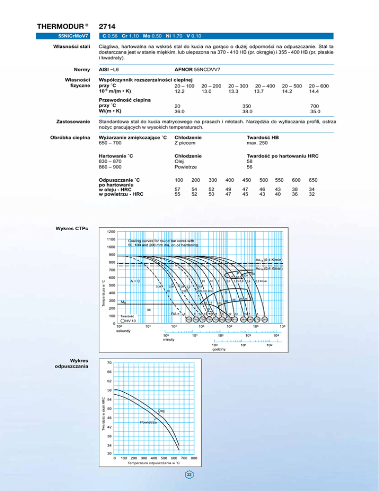 THERMODUR® 55NiCrMoV7 Własności stali Normy Własności fizyczne 2714 C 0.56 Cr 1.10 Mo 0.50 Ni 1.70 V 0.10 Ciągliwa, hartowalna na wskroś stal do kucia na gorąco o dużej odporności na odpuszczanie. Stal ta dostarczana jest w stanie miękkim, lub ulepszona na 370 - 410 HB (pr. okrągłe) i 355 - 400 HB (pr. płaskie i kwadraty). AFNOR 55NCDVV7 AISI ~L6 Współczynnik rozszerzalności cieplnej przy ˚C 20 – 100 10-6 m/(m • K) 12.2 Przewodność cieplna przy ˚C W/(m • K) Zastosowanie Obróbka cieplna 20 – 200 13.0 20 – 300 13.3 20 36.0 20 – 400 13.7 20 – 500 14.2 350 38.0 20 – 600 14.4 700 35.0 Standardowa stal do kucia matrycowego na prasach i młotach. Narzędzia do wytłaczania profili, ostrza nożyc pracujących w wysokich temperaturach. Wyżarzanie zmiękczające ˚C 650 – 700 Chłodzenie Z piecem Twardość HB max. 250 Hartowanie ˚C 830 – 870 860 – 900 Chłodzenie Olej Powietrze Twardość po hartowaniu HRC 58 56 Odpuszczanie ˚C po hartowaniu w oleju - HRC w powietrzu - HRC 100 200 300 400 450 500 550 600 650 57 55 54 52 52 50 49 47 47 45 46 43 43 40 38 36 34 32 Temperatura w ˚C Wykres CTPc Twardość w skali HRC Wykres odpuszczania Olej Powietrze Temperatura odpuszczania w ˚C 22