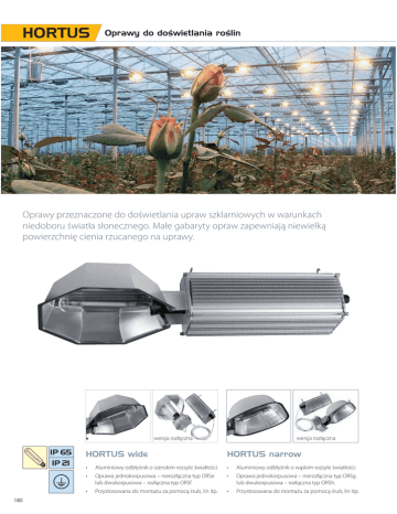 HORTUS Oprawy do doświetlania roślin Oprawy przeznaczone do doświetlania upraw szklarniowych w warunkach niedoboru światła słonecznego. Małe gabaryty opraw zapewniają niewielką powierzchnię cienia rzucanego na uprawy. wersja rozłączna IP 65 IP 21 180 wersja rozłączna HORTUS wide HORTUS narrow • Aluminiowy odbłyśnik o szerokim rozsyle światłości. • Aluminiowy odbłyśnik o wąskim rozsyle światłości. • Oprawa jednokorpusowa – nierozłączna typ ORSe lub dwukorpusowa – rozłączna typ ORSf. • Oprawa jednokorpusowa – nierozłączna typ ORSg lub dwukorpusowa – rozłączna typ ORSh. • Przystosowana do montażu za pomocą śrub, lin itp. • Przystosowana do montażu za pomocą śrub, lin itp. Indeks Model HORTUS wide EG-WO0025-62 Źródło światła Trzonek lampy Stopień ochrony Klasa ochronności Statecznik magnetyczny Kompensacja mocy biernej Napięcie zasilania Oprawa do doświetlania roślin, jednokorpusowa, nierozłączna, z odbłyśnikiem o rozsyle szerokim ORSe-400 EG-WO0026-93 ORSe-600 EG-WO0026-95 ORSe-600 HORTUS wide Moc źródła światła wysokoprężna lampa sodowa do doświetlania roślin 400W E40 IP 65/21 • I • 230V 600W E40 IP 65/21 I • • 230V 600W E40 IP 65/21 I • • 400V Oprawa do doświetlania roślin, dwukorpusowa, rozłączna, z odbłyśnikiem o rozsyle szerokim EG-WO0026-97 ORSf-400 EG-WO0026-99 ORSf-600 EG-WO0027-01 ORSf-600 HORTUS narrow wysokoprężna lampa sodowa do doświetlania roślin 400W E40 IP 65/21 I • • 230V 600W E40 IP 65/21 I • • 230V 600W E40 IP 65/21 I • • 400V Oprawa do doświetlania roślin, jednokorpusowa, nierozłączna, z odbłyśnikiem o rozsyle wąskim EG-WO0027-03 ORSg-400 EG-WO0027-05 ORSg-600 EG-WO0027-07 ORSg-600 HORTUS narrow wysokoprężna lampa sodowa do doświetlania roślin 400W E40 IP 65/21 I • • 230V 600W E40 IP 65/21 I • • 230V 600W E40 IP 65/21 I • • 400V Oprawa do doświetlania roślin, dwukorpusowa, rozłączna, z odbłyśnikiem o rozsyle wąskim EG-WO0027-09 ORSh-400 EG-WO0027-11 ORSh-600 EG-WO0027-13 ORSh-600 wysokoprężna lampa sodowa do doświetlania roślin 400W E40 IP 65/21 I • • 230V 600W E40 IP 65/21 I • • 230V 600W E40 IP 65/21 I • • 400V Model ORSe-400 ORSe-600 ORSf-400 ORSf-600 ORSg-400 ORSg-600 ORSh-400 ORSh-600 A A C – – 360 388 – – 360 388 C HORTUS wide ORSe HORTUS wide ORSf B B HORTUS narrow ORSg Wymiary [mm] B max. 310 355 280 310 310 355 280 310 B B A A 745 790 453 453 753 798 461 461 A C HORTUS narrow ORSh 230V 400V IP 65 IP 21 www.elgo.pl 181 FLORA Oprawy do doświetlania roślin Oprawy przeznaczone do doświetlania upraw szklarniowych w warunkach niedoboru światła słonecznego. Małe gabaryty opraw zapewniają niewielką powierzchnię cienia rzucanego na uprawy. wersja rozłączna wersja rozłączna IP 65 IP 21 FLORA FLORA ref • Oprawa z osłoną zabezpieczającą lampę przed uszkodzeniami mechanicznymi i małogabarytowym odbłyśnikiem metalizowanym. • • Oprawa jednokorpusowa – nierozłączna typ ORSc lub dwukorpusowa – rozłączna typ ORSd. Oprawa z osłoną zabezpieczającą lampę przed uszkodzeniami mechanicznymi, bez odbłyśnika, przystosowana do współpracy ze specjalnymi lampami z odbłyśnikiem wewnętrznym np. typu REFLUX. • Oprawa jednokorpusowa – nierozłączna typ ORSa lub dwukorpusowa – rozłączna typ ORSb. • Przystosowana do montażu za pomocą śrub, lin itp. • 182 Przystosowana do montażu za pomocą śrub, lin itp. Indeks Model FLORA Źródło światła Moc źródła światła Trzonek lampy Stopień ochrony Klasa ochronności Statecznik magnetyczny Kompensacja mocy biernej Napięcie zasilania Oprawa do doświetlania roślin, jednokorpusowa, nierozłączna, z odbłyśnikiem małogabarytowym EG-WO0022-14 ORSc-400 EG-WO0025-22 ORSc-600 EG-WO0022-16 ORSc-600 FLORA wysokoprężna lampa sodowa do doświetlania roślin 400W E40 IP 65/21 I • • 230V 600W E40 IP 65/21 I • • 230V 600W E40 IP 65/21 I • • 400V Oprawa do doświetlania roślin, dwukorpusowa, rozłączna, z odbłyśnikiem małogabarytowym EG-WO0021-09 ORSd-400 EG-WO0022-18 ORSd-600 EG-WO0021-11 ORSd-600 FLORA ref E40 IP 65/21 • I • 230V 600W E40 IP 65/21 I • • 230V 600W E40 IP 65/21 I • • 400V Oprawa do doświetlania roślin, jednokorpusowa, nierozłączna, do lampy z odbłyśnikiem wewnętrznym EG-WO0025-58 ORSa-400 EG-WO0025-61 ORSa-600 FLORA ref 400W wysokoprężna lampa sodowa do doświetlania roślin wysokoprężna lampa sodowa z wewnętrznym odbłyśnikiem 400W E40 IP 65/21 I • • 230V 600W E40 IP 65/21 I • • 230V Oprawa do doświetlania roślin, dwukorpusowa, rozłączna, do lampy z odbłyśnikiem wewnętrznym EG-WO0025-64 ORSb-400 EG-WO0025-66 ORSb-600 wysokoprężna lampa sodowa z wewnętrznym odbłyśnikiem 400W E40 IP 65/21 I • • 230V 600W E40 IP 65/21 I • • 230V B A FLORA ORSc FLORA ref ORSa B max. 4 mb D Model C A FLORA ORSd FLORA ref ORSb A Wymiary [mm] B max. C D max. ORSa-400 780 310 – ORSa-600 825 355 – – – ORSb-400 488 375 360 280 ORSb-600 488 375 388 310 ORSc-400 740 310 – – ORSc-600 785 355 – – ORSd-400 448 335 360 280 ORSd-600 448 335 388 310 230V 400V IP 65 IP 21 www.elgo.pl 183 GREEN Oprawy do doświetlania roślin Oprawy przeznaczone do doświetlania upraw szklarniowych w warunkach niedoboru światła słonecznego poza obszarem bezpośredniego zraszania. Oprawy rozłączne stosowane w szklarniach, tunelach foliowych itp., których konstrukcja nie jest przystosowana do przenoszenia obciążeń od znacznej ilości opraw. IP 21 184 Budowa • Odbłyśnik składany, wieloelementowy z aluminium o gruboziarnistej powierzchni. • Oprawa jednokorpusowa – nierozłączna typ ORX2 lub dwukorpusowa – rozłączna typ ORX3. • Korpus lampy i osprzętu wykonany z blachy aluminiowej, malowany proszkowo. • W korpusie lampy i osprzętu znajdują się: zamocowany odbłyśnik, osprzęt elektryczny, nitowane wieszaki umożliwiające podwieszenie oprawy do kons