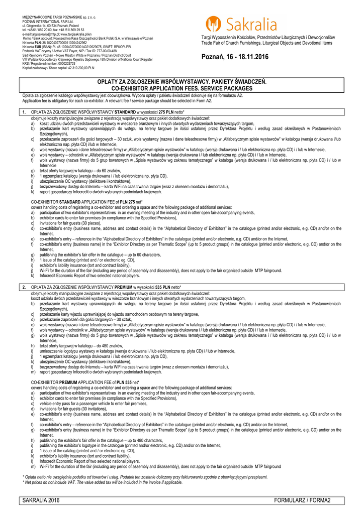 MIĘDZYNARODOWE TARGI POZNAŃSKIE sp. z o. o. POZNAŃ INTERNATIONAL FAIR Ltd. ul. Głogowska 14, 60-734 Poznań, Poland tel. +48/61/ 869 20 00, fax: +48 /61/ 869 29 53 e-mail:[email protected]; www.targisakralia.pl/en Konto / Bank account: Powszechna Kasa Oszczędności Bank Polski S.A. w Warszawie o/Poznań Nr konta PLN: 38 102040270000110204242962 Nr konta EUR (IBAN): PL 46 102040270000140210929075, SWIFT: BPKOPLPW Podatnik VAT czynny / Active VAT Payer, NIP / Tax ID: 777-00-00-488 Sąd Rejonowy Poznań – Nowe Miasto i Wilda w Poznaniu / Poznan District Court VIII Wydział Gospodarczy Krajowego Rejestru Sądowego / 8th Division of National Court Register KRS / Registered number: 0000202703 Kapitał zakładowy / Share capital: 42 310 200,00 PLN Targi Wyposażenia Kościołów, Przedmiotów Liturgicznych i Dewocjonaliów Trade Fair of Church Furnishings, Liturgical Objects and Devotional Items Poznań, 16 - 18.11.2016 OPŁATY ZA ZGŁOSZENIE WSPÓŁWYSTAWCY. PAKIETY ŚWIADCZEŃ. CO-EXHIBITOR APPLICATION FEES. SERVICE PACKAGES Opłata za zgłoszenie każdego współwystawcy jest obowiązkowa. Wyboru opłaty / pakietu świadczeń dokonuje się na formularzu A2. Application fee is obligatory for each co-exhibitor. A relevant fee / service package should be selected in Form A2. 1. OPŁATA ZA ZGŁOSZENIE WSPÓŁWYSTAWCY STANDARD w wysokości 275 PLN netto* obejmuje koszty manipulacyjne związane z rejestracją współwystawcy oraz pakiet dodatkowych świadczeń: a) koszt udziału dwóch przedstawicieli wystawcy w wieczorze branżowym i innych otwartych wydarzeniach towarzyszących targom, b) przekazanie kart wystawcy uprawniających do wstępu na tereny targowe (w ilości ustalonej przez Dyrektora Projektu i według zasad określonych w Postanowieniach Szczegółowych), c) przekazanie zaproszeń dla gości targowych – 30 sztuk, wpis wystawcy (nazwa i dane teleadresowe firmy) w „Alfabetycznym spisie wystawców” w katalogu (wersja drukowana i/lub elektroniczna nap. płyta CD) i/lub w Internecie, d) wpis wystawcy (nazwa i dane teleadresowe firmy) w „Alfabetycznym spisie wystawców” w katalogu (wersja drukowana i / lub elektroniczna np. płyta CD) i / lub w Internecie, e) wpis wystawcy – odnośnik w „Alfabetycznym spisie wystawców” w katalogu (wersja drukowana i / lub elektroniczna np. płyta CD) i / lub w Internecie, f) wpis wystawcy (nazwa firmy) do 5 grup towarowych w „Spisie wystawców wg zakresu tematycznego” w katalogu (wersja drukowana i / lub elektroniczna np. płyta CD) i / lub w Internecie g) tekst oferty targowej w katalogu – do 60 znaków, h) 1 egzemplarz katalogu (wersja drukowana i / lub elektroniczna np. płyta CD), i) ubezpieczenie OC wystawcy (deliktowe i kontraktowe), j) bezprzewodowy dostęp do Internetu – karta WiFi na czas trwania targów (wraz z okresem montażu i demontażu), k) raport gospodarczy Infocredit o dwóch wybranych podmiotach krajowych. CO-EXHIBITOR STANDARD APPLICATION FEE of PLN 275 net* covers handling costs of registering a co-exhibitor and ordering a space and the following package of additional services: a) participation of two exhibitor’s representatives in an evening meeting of the industry and in other open fair-accompanying events, b) exhibitor cards to enter fair premises (in compliance with the Specified Provisions), c) invitations for fair guests (30 pieces), d) co-exhibitor’s entry (business name, address and contact details) in the “Alphabetical Directory of Exhibitors” in the catalogue (printed and/or electronic, e.g. CD) and/or on the Internet, e) co-exhibitor’s entry – reference in the “Alphabetical Directory of Exhibitors” in the catalogue (printed and/or electronic, e.g. CD) and/or on the Internet, f) co-exhibitor’s entry (business name) in the “Exhibitor Directory as per Thematic Scope” (up to 5 product groups) in the catalogue (printed and/or electronic, e.g. CD) and/or on the Internet, g) publishing the exhibitor’s fair offer in the catalogue – up to 60 characters, h) 1 issue of the catalog (printed and / or electronic eg. CD), i) exhibitor’s liability insurance (tort and contract liability), j) Wi-Fi for the duration of the fair (including any period of assembly and disassembly), does not apply to the fair organized outside MTP fairground. k) Infocredit Economic Report of two selected national players. 2. OPŁATA ZA ZGŁOSZENIE WSPÓŁWYSTAWCY PREMIUM w wysokości 535 PLN netto* obejmuje koszty manipulacyjne związane z rejestracją współwystawcy oraz pakiet dodatkowych świadczeń: koszt udziału dwóch przedstawicieli wystawcy w wieczorze branżowym i innych otwartych wydarzeniach towarzyszących targom, b) przekazanie kart wystawcy uprawniających do wstępu na tereny targowe (w ilości ustalonej przez Dyrektora Projektu i według zasad określonych w Postanowieniach Szczegółowych), c) przekazanie karty wjazdu uprawniającej do wjazdu samochodem osobowym na tereny targowe, d) przekazanie zaproszeń dla gości targowych – 30 sztuk, e) wpis wystawcy (nazwa i dane teleadresowe firmy) w „Alfabetycznym spisie wystawców” w katalogu (wersja drukowana i / lub elektroniczna np. płyta CD) i / lub w Internecie, f) wpis wystawcy – odnośnik w „Alfabetycznym spisie wystawców” w katalogu (wersja drukowana i / lub elektroniczna np. płyta CD) i / lub w Internecie, g) wpis wystawcy (nazwa firmy) do 5 grup towarowych w „Spisie wystawców wg zakresu tematycznego” w katalogu (wersja drukowana i / lub elektroniczna np. płyta CD) i / lub w Internecie, h) tekst oferty targowej w katalogu – do 480 znaków, i) umieszczenie logotypu wystawcy w katalogu (wersja drukowana i / lub elektroniczna np. płyta CD) i / lub w Internecie, j) 1 egzemplarz katalogu (wersja drukowana i / lub elektroniczna np. płyta CD), k) ubezpieczenie OC wystawcy (deliktowe i kontraktowe), l) bezprzewodowy dostęp do Internetu – karta WiFi na czas trwania targów (wraz z okresem montażu i demontażu), m) r