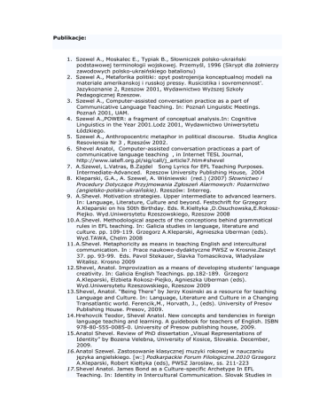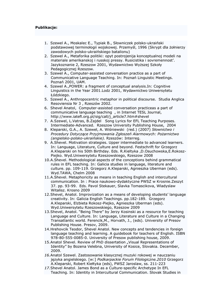 Publikacje: 1. Szewel A., Moskalec E., Typiak B., Słowniczek polsko-ukraiński podstawowej terminołogii wojskowej. Przemyśl, 1996 (Skrypt dla żołnierzy zawodowych polsko-ukraińskiego batalionu) 2. Szewel A., Metaforika politiki: opyt postrojenija konceptualnoj modeli na materiale amerikanskoj i russkoj pressy. Rusicistika i sovremennost’. Jazykoznanie 2, Rzeszow 2001, Wydawnictwo Wyższej Szkoły Pedagogicznej Rzeszow. 3. Szewel A., Computer-assisted conversation practice as a part of Communicative Language Teaching. In: Poznań Linguistic Meetings. Poznań 2001, UAM. 4. Szewel A.,POWER: a fragment of conceptual analysis.In: Cognitive Linguistics in the Year 2001.Lodz 2001, Wydawnictwo Uniwersytetu Łódzkiego. 5. Szewel A., Anthropocentric metaphor in political discourse. Studia Anglica Resoviensia Nr 3 , Rzeszów 2002. 6. Shevel Anatol, Computer-assisted conversation practiceas a part of communicative language teaching , in Internet TESL Journal, http://www.iatefl.org.pl/sig/call/j_article7.htm#shevel 7. A.Szewel, L.Vatras, B.Zajdel Song Lyrics for EFL Teaching Purposes. Intermediate-Advanced. Rzeszow University Publishing House, 2004 8. Kleparski, G.A., A. Szewel, A. Wiśniewski (red.) (2007) Słownictwo i Procedury Dotyczące Przyjmowania Zgłoszeń Alarmowych: Pożarnictwo (angielsko-polsko-ukraińskie). Rzeszów: Interreg. 9. A.Shevel. Motivation strategies. Upper intermediate to advanced learners. In: Language, Literature, Culture and beyond. Festschrift for Grzegorz A.Kleparski on his 50th Birthday. Eds. R.Kieltyka ,D.Osuchowska,E.RokoszPiejko. Wyd.Uniwersytetu Rzeszowskiego, Rzeszow 2008 10. A.Shevel. Methodological aspects of the conceptions behind grammatical rules in EFL teaching. In: Galicia studies in language, literature and culture. pp. 109-119. Grzegorz A.Kleparski, Agnieszka Uberman (eds). Wyd.TAWA, Chelm 2008 11. A.Shevel. Metaphoricity as means in teaching English and intercultural communication. In : Prace naukowo-dydaktyczne PWSZ w Krosnie.Zeszyt 37. pp. 93-99. Eds. Pavol Stekauer, Slavka Tomascikova, Wladyslaw Witalisz. Krosno 2009 12. Shevel, Anatol. Improvization as a means of developing students’ language creativity. In: Galicia English Teachings. pp.182-189. Grzegorz A.Kleparski, Elzbieta Rokosz-Piejko, Agnieszka Uberman (eds). Wyd.Uniwersytetu Rzeszowskiego, Rzeszow 2009 13. Shevel, Anatol. “Being There” by Jerzy Kosinski as a resource for teaching Language and Culture. In: Language, Literature and Culture in a Changing Transatlantic world. Ferencik,M., Horvath, J., (eds). University of Presov Publishing House. Presov, 2009. 14. Hrehovcik Teodor, Shevel Anatol. New concepts and tendencies in foreign language teaching and learning. A guidebook for teachers of English. ISBN 978-80-555-0085-0. University of Presow publishing house, 2009. 15. Anatol Shevel. Review of PhD dissertation „Visual Representations of Identity” by Bozena Velebna, University of Kosice, Slovakia. December, 2009. 16. Anatol Szewel. Zastosowanie klasycznej muzyki rokowej w nauczaniu języka angielskiego. [w:] Podkarpackie Forum Filologiczne.2010 Grzegorz A.Kleparski, Robert Kiełtyka (eds), PWSZ Jaroslaw, ss. 211-223 17. Shevel Anatol. James Bond as a Culture-specific Archetype In EFL Teaching. In: Identity in Intercultural Communication. Slovak Studies in English III. Ada Bohmerova (ed). Faculty of Arts, Comenius University, Bratislava. 2011, pp 223-229. Czynne uczestnictwo w konferencjach naukowych: 1. Cognitive Linguistics in the Year 2001. University of Lodz ,19-22 kwietnia 2001. "Anthropocentric Metaphor in Political Discourse" 2. Poznan Linguistic Meetings. University of Poznan, 27-27 kwietnia 2001. "Computer-aided Conversation Practice in Communicative Teaching" 3. IATEFL . Multimedia in EFL Teaching. Glivice 23-24 czerwca 2001. "Live-book Software in Communicative Practice." 4. Kognitywizm w Poetyce i Stylistyce. University of Lodz, 17-19 września 2001. "Metaphoricity and Symbolic Associations: Masculine vs Feminine." 5. I Anglistentag. Rzeszów, Poland 22 - 23.10.2007.Referat: Motivation strategies. Upper intermediate to advanced learners. 6. Culture, Language and Literature Across Border Regions. University of Kosice, Slovak Republic, kwiecień 28-29, 2008. Referat: Metaphoricity as means in teaching English and intercultural communication. 7. Second Anglistentad in Rzeszów: GALICIA ENGLISH TEACHINGS: OLD PITFALLS, CHANGING ATTITUDES AND NEW VISTAS. Rzeszów, marzec 2009. Referat: . Improvization as a means of developing students’ language creativity. 8. Language, Literature and Culture in a Changing Transatlantic world.University of Presow, Slovak Republic, kwiecień 22-23, 2009. Referat: “Being There” by Jerzy Kosinski as a resource for teaching Language and Culture. 9. Jaroslaw PWSZ. Referat: Zastosowanie klasycznej muzyki rokowej w nauczaniu języka angielskiego. May 2010 10. University of Kosice. Referat: The motive of horror and spying in EFL teaching. May 2010 11. Krosno PWSZ. April 2010 Referat: Humour as a motivating factor in language teaching. 12. Bratislava. October, 2010. Identity in Intercultural Communication: 3d Triennial Conference in English and American Studies. University of Bratislava, Slovak Republic. Referat: James Bond as a Culture-specific Archetype In EFL Teaching 13. Konin. Institute of Modern Languages, State School of Higher Professional Education in Konin and Department of English Studies, Faculty of Pedagogy and Fine Arts, Adam Mickiewicz University, Kalisz. May 2011 Referat: Speaking in a foreign language: Effective learning, teaching and assessment. Wykłady w zagranicznych ośrodkach naukowo-badawczych: 1. A course in the role of humour in EFL teaching. University of Kosice, Slovak Republic. March 2008. 2. A course in Didactics of EFL teaching. University of Kosice, Slovak Republic. March 2010. 3. A course in Didactics of EFL teaching. University of Kosice, Slovak Republic. March 2011.