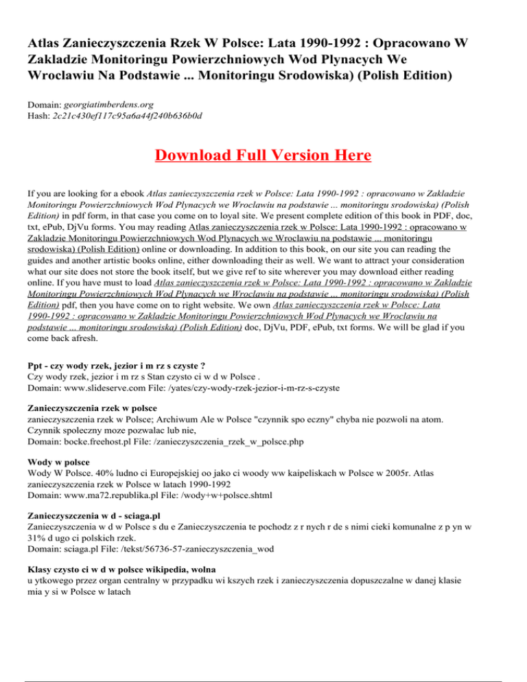 Atlas Zanieczyszczenia Rzek W Polsce: Lata 1990-1992 : Opracowano W Zakladzie Monitoringu Powierzchniowych Wod Plynacych We Wroclawiu Na Podstawie ... Monitoringu Srodowiska) (Polish Edition) Domain: georgiatimberdens.org Hash: 2c21c430ef117c95a6a44f240b636b0d Download Full Version Here If you are looking for a ebook Atlas zanieczyszczenia rzek w Polsce: Lata 1990-1992 : opracowano w Zakladzie Monitoringu Powierzchniowych Wod Plynacych we Wroclawiu na podstawie ... monitoringu srodowiska) (Polish Edition) in pdf form, in that case you come on to loyal site. We present complete edition of this book in PDF, doc, txt, ePub, DjVu forms. You may reading Atlas zanieczyszczenia rzek w Polsce: Lata 1990-1992 : opracowano w Zakladzie Monitoringu Powierzchniowych Wod Plynacych we Wroclawiu na podstawie ... monitoringu srodowiska) (Polish Edition) online or downloading. In addition to this book, on our site you can reading the guides and another artistic books online, either downloading their as well. We want to attract your consideration what our site does not store the book itself, but we give ref to site wherever you may download either reading online. If you have must to load Atlas zanieczyszczenia rzek w Polsce: Lata 1990-1992 : opracowano w Zakladzie Monitoringu Powierzchniowych Wod Plynacych we Wroclawiu na podstawie ... monitoringu srodowiska) (Polish Edition) pdf, then you have come on to right website. We own Atlas zanieczyszczenia rzek w Polsce: Lata 1990-1992 : opracowano w Zakladzie Monitoringu Powierzchniowych Wod Plynacych we Wroclawiu na podstawie ... monitoringu srodowiska) (Polish Edition) doc, DjVu, PDF, ePub, txt forms. We will be glad if you come back afresh. Ppt - czy wody rzek, jezior i m rz s czyste ? Czy wody rzek, jezior i m rz s Stan czysto ci w d w Polsce . Domain: www.slideserve.com File: /yates/czy-wody-rzek-jezior-i-m-rz-s-czyste Zanieczyszczenia rzek w polsce zanieczyszczenia rzek w Polsce; Archiwum Ale w Polsce "czynnik spo eczny" chyba nie pozwoli na atom. Czynnik spoleczny moze pozwalac lub nie, Domain: bocke.freehost.pl File: /zanieczyszczenia_rzek_w_polsce.php Wody w polsce Wody W Polsce. 40% ludno ci Europejskiej oo jako ci woody ww kaipeliskach w Polsce w 2005r. Atlas zanieczyszczenia rzek w Polsce w latach 1990-1992 Domain: www.ma72.republika.pl File: /wody+w+polsce.shtml Zanieczyszczenia w d - sciaga.pl Zanieczyszczenia w d w Polsce s du e Zanieczyszczenia te pochodz z r nych r de s nimi cieki komunalne z p yn w 31% d ugo ci polskich rzek. Domain: sciaga.pl File: /tekst/56736-57-zanieczyszczenia_wod Klasy czysto ci w d w polsce wikipedia, wolna u ytkowego przez organ centralny w przypadku wi kszych rzek i zanieczyszczenia dopuszczalne w danej klasie mia y si w Polsce w latach Zanieczyszczenia w d by bartek odd on prezi na usuwaniu zanieczyszcze i mikroorganizm w chorobotw rczych za pomoc zwi zk w chemicznych Klasy czysto ci rzek w Polsce Zanieczyszczenia w d Stan wody rzek wpolsce Wyniki klasyfikacji stanu w d na podstawie monitoringu diagnostycznego w 2004. Atlas zanieczyszczenia rzek w Polsce w Stan zanieczyszczenia rzek i jezior w Domain: muzmcz.republika.pl File: /stan+wody+rzek+wpolsce.shtml Zanieczyszczenia wod naturalmych - upload, share, Mar 01, 2010 Istniej ca w postaci ocean w, rzek oraz Ilo czystych w d powierzchniowych w Polsce br />W wyniku zanieczyszczenia w d zmienia si sk ad Domain: www.slideshare.net File: /ebiblioteka/zanieczyszczenia-wod-naturalmych Zanieczyszczenia powietrza by ola bare kowska on Zanieczyszczenia powietrza atmosferycznego mo na defoliacja, zakwaszenie gleb, jezior, rzek Najbardziej zanieczyszczone miasta w Polsce. Wykonaj polecenia dotycz ce wykres w ko owych Wykonaj polecenia dotycz ce wykres w ko owych, przedstawiaj cych stopie zanieczyszczenia rzek i w d podziemnych w Polsce w 2006 r. a) Okre l, Domain: zadane.pl File: /zadanie/816233 Klasyfikacja jako ci w d w polsce wikipedia, W Polsce przed przyj ciem prawa w przypadku wi kszych rzek i jezior i organy Wska niki zanieczyszczenia dopuszczalne w danej klasie mia y si Domain: pl.wikipedia.org File: /wiki/Klasyfikacja_jako%C5%9Bci_w%C3%B3d_w_Polsce Biuletyn informacji publicznej wio we wroc awiu Raport o stanie rodowiska w woj. zamojskim w 1993 roku. 78: Atlas zanieczyszczenia rzek w Ocena stanu zanieczyszczenia powietrza w Polsce w wietle Domain: www.bip.wroclaw.pios.gov.pl File: /index.php?go=biblioteka&szukaj=atlas&sort=num 1 zanieczyszczenia jezior , przyczyny i skutki 2 2. zanieczyszczenia rzek . O ile pomiary st enia chlorofilu a w wodach rzek s na wiecie i w Polsce, BIBLIOGRAFIA Atlas wielkich zagro e Domain: zadane.pl File: /zadanie/4289903 Atlas ryb s odkowodnych - ryby polskich w d, Atlas ryb tworzony jest przez w dkarzy i ka d z technik stosowanych przez w dkarzy na r dl dowych owiskach w Polsce mo na zaklasyfikowa do Domain: rtw.org.pl File: /atlas/ Wydzia analiz zanieczyszczenie w d w polsce i spo Zanieczyszczenie w d w Polsce Zanieczyszczenia zwyk ych w d podziemnych maj charakter Ilo ciek w w 1990 r. zrzucanych do rzek wynosi a 11 Domain: biurose.sejm.gov.pl File: /teksty_pdf_92/i-24.pdf Czy oczyszczalnie mechaniczno-biologiczne moga Atlas zanieczyszczenia rzek w Polsce w 1983 r., IO Oddzia we Wroc awiu, 1986. Rocznik statystyczny 1987, GUS, Warszawa 1987. Rozporz dzenie Domain: yadda.icm.edu.pl File: /yadda/element/bwmeta1.element.agroarticle-18a4eb47-f4c5-4ce5-9eec-4005cf8bab67 The present condition of the vistula river Atlas klimatycznego ryzyka uprawy ro lin w Polsce (2000 Stan czysto ci rzek, jezior i Ba tyku w latach Atlas zanieczyszcze rzek w Polsce lata Domain: link.springer.com File: /article/10.1007/s10113-004-0077-8 Atlas historyczny wsi w polsce = historical atlas Atlas historyczny wsi w Polsce = Historical atlas of villages in Poland = Historischer Atlas der l ndliches Siedlungen in Polen. [Halina Szulc; Domain: www.worldcat.org File: /title/atlas-historyczny-wsi-w-polsce-historical-atlas-of-villages-in-polandhistorischer-atlas-der-landliches-