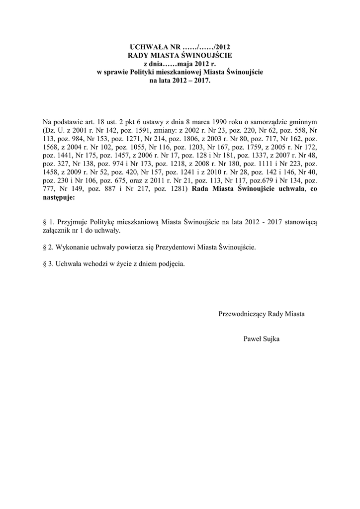 UCHWAŁA NR ……/……/2012 RADY MIASTA ŚWINOUJŚCIE z dnia……maja 2012 r. w sprawie Polityki mieszkaniowej Miasta Świnoujście na lata 2012 – 2017. Na podstawie art. 18 ust. 2 pkt 6 ustawy z dnia 8 marca 1990 roku o samorządzie gminnym (Dz. U. z 2001 r. Nr 142, poz. 1591, zmiany: z 2002 r. Nr 23, poz. 220, Nr 62, poz. 558, Nr 113, poz. 984, Nr 153, poz. 1271, Nr 214, poz. 1806, z 2003 r. Nr 80, poz. 717, Nr 162, poz. 1568, z 2004 r. Nr 102, poz. 1055, Nr 116, poz. 1203, Nr 167, poz. 1759, z 2005 r. Nr 172, poz. 1441, Nr 175, poz. 1457, z 2006 r. Nr 17, poz. 128 i Nr 181, poz. 1337, z 2007 r. Nr 48, poz. 327, Nr 138, poz. 974 i Nr 173, poz. 1218, z 2008 r. Nr 180, poz. 1111 i Nr 223, poz. 1458, z 2009 r. Nr 52, poz. 420, Nr 157, poz. 1241 i z 2010 r. Nr 28, poz. 142 i 146, Nr 40, poz. 230 i Nr 106, poz. 675, oraz z 2011 r. Nr 21, poz. 113, Nr 117, poz.679 i Nr 134, poz. 777, Nr 149, poz. 887 i Nr 217, poz. 1281) Rada Miasta Świnoujście uchwala, co następuje: § 1. Przyjmuje Politykę mieszkaniową Miasta Świnoujście na lata 2012 - 2017 stanowiącą załącznik nr 1 do uchwały. § 2. Wykonanie uchwały powierza się Prezydentowi Miasta Świnoujście. § 3. Uchwała wchodzi w życie z dniem podjęcia. Przewodniczący Rady Miasta Paweł Sujka Uzasadnienie Polityka mieszkaniowa Miasta Świnoujście na lata 2012-2017 określa cele, zasady i kierunki działania, jakie Miasto będzie podejmowało by realizować jedno ze swoich podstawowych zadań, jakim jest zaspokajanie potrzeb mieszkaniowych społeczności samorządowej. Dokument pod nazwą „Polityka mieszkaniowa Miasta Świnoujście na lata 2012-2017” jest wynikiem prac zespołu powołanego Zarządzeniem Nr 433/2011 z dnia 29 czerwca 2011 roku Prezydenta Miasta Świnoujście, przy udziale eksperta zewnętrznego Pani Ewy Bończak-Kucharczyk (specjalistka w zakresie mieszkalnictwa i nieruchomości, autorka licznych publikacji m.in. komentarzy do przepisów dotyczących spółdzielni mieszkaniowych, własności lokali i wspólnot mieszkaniowych). Przyjmując założenia do opracowania polityki mieszkaniowej oparto się na diagnozie: a) aktualnej sytuacji mieszkaniowej w Świnoujściu; b) sytuacji demograficznej i dochodowej mieszkańców Świnoujścia i wynikających z niej potrzeb mieszkaniowych; oraz aktualnie obowiązującym stanie prawnym w zakresie prawa miejscowego. Ustalając kierunki dalszych działań oparto się również na konsultacjach: a) z radnymi Rady Miasta ; b) z przedstawicielami organizacji społecznych i podmiotów gospodarczych (Społeczna Komisja Mieszkaniowa, przedstawiciele spółdzielni mieszkaniowych, zarządcy nieruchomości, Północna Izba Gospodarcza, deweloperzy itd). Polityka mieszkaniowa realizowana będzie poprzez obowiązujące akty prawa miejscowego, takie jak; miejscowe plany zagospodarowania przestrzennego, Wieloletnie Plany Inwestycyjne oraz kolejne budżety Miasta uwzględniające środki na zaplanowane działania. W odniesieniu do zasobu mieszkaniowego Miasta, polityka mieszkaniowa realizowana będzie poprzez rozwiązania zawarte w trzech uchwałach tj.: w sprawie zasad wynajmowania lokali wchodzących w skład mieszkaniowego zasobu Miasta Świnoujście; wieloletniego programu gospodarowania mieszkaniowym zasobem Gminy Miasta Świnoujście oraz gospodarki nieruchomościami Miasta Świnoujście (w zakresie m.in. stosowania bonifikat). Wszystkie przyjęte rozwiązania w wyżej wymienionych aktach prawnych są ze sobą powiązane i pozwolą na realizację polityki mieszkaniowej w najbliższych latach. POLITYKA MIESZKANIOWA MIASTA ŚWINOUJŚCIE NA LATA 2012-2017 maj 2012 Załącznik nr 1 do Uchwały NR ……………….. Rady Miasta Świnoujście z dnia……………. 1. ZADANIA GMINY W ZAKRESIE GOSPODARKI MIESZKANIOWEJ Zadania gminy w zakresie mieszkalnictwa unormowane są m.in. przez następujące akty prawne: − Konstytucja Rzeczypospolitej Polskiej; − Ustawa z dnia 23 kwietnia 1964 r. Kodeks cywilny; − Ustawa z dnia 8 marca 1990 r. o samorządzie gminnym (tj. Dz. U. z 2001r. nr 142 poz. 1591 ze zm.); − Ustawa z dnia 24 czerwca 1994 r. o własności lokali z późn. zm.; − Ustawa z dnia 26 października 1995 r. o niektórych formach popierania budownictwa mieszkaniowego oraz o zmianie niektórych ustaw; − Ustawa z dnia 21 sierpnia 1997 r. o gospodarce nieruchomościami; − Ustawa z dnia 21 czerwca 2001 r. o ochronie praw lokatorów w mieszkaniowym zasobie gminy i o zmianie kodeksu cywilnego; − Ustawa z dnia 21 czerwca 2001 r. o dodatkach mieszkaniowych; − Ustawa z dnia 12 marca 2004 r. o pomocy społecznej; − Ustawa z dnia 29 lipca 2005r. o przekształceniu prawa użytkowania wieczystego w prawo własności nieruchomości. Zagadnienia gospodarki nieruchomościami oraz polityki mieszkaniowej w Świnoujściu regulują także akty prawa miejscowego, m.in.: − Uchwała NR XVI/126/2011 Rady Miasta Świnoujście z dnia 27 października 2011 r. w sprawie zasad wynajmowania lokali wchodzących w skład mieszkaniowego zasobu Miasta Świnoujście; − Uchwała NR XXXVIII/325/2008 Rady Miasta Świnoujścia z dnia 29 maja 2008 r. w sprawie gospodarki nieruchomościami miasta Świnoujście z późn. zmianami; − Uchwała NR XIV/148/2007 Rady Miasta Świnoujścia z dnia 26 kwietnia 2007 r. w sprawie wyrażenia zgody na wydzierżawianie nieruchomości; − Uchwała NR LXV/526/2010 Rady Miasta Świnoujście z dnia 25 lutego 2010 r. w sprawie zasad i trybu udzielania ulg w spłatach należności pieniężnych o charakterze cywilnoprawnym przysługujących gminie; − Uchwała NR XXXIV/294/2008 Rady Miasta Świnoujścia z dnia 27 marca 2008 r. w sprawie wyrażenia zgody na udzielenie bonifikaty od opłaty z tytułu przekształcenia prawa użytkowania wieczystego w prawo własności. W świetle wymienionych przepisów gmina winna prowadzić politykę sprzyjającą zaspokajaniu potrzeb mieszkaniowych obywateli zgodnie z ich własnymi preferencjami, aspiracjami i możliwościami ek