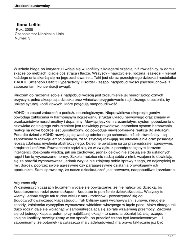 Urodzeni buntownicy Ilona Lelito Rok: 2005 Czasopismo: Niebieska Linia Numer: 3 W szkole biega po korytarzu i wdaje się w konflikty z kolegami częściej niż rówieśnicy, w domu skacze po meblach, ciągle coś strąca i tłucze. Wszyscy - nauczyciele, rodzina, sąsiedzi - niemal każdego dnia skarżą się na jego zachowanie... Taki jest obraz przeciętnego dziecka i nastolatka z ADHD (Attention Deficit Hyperactivity Disorder - zespół nadpobudliwości psychoruchowej z zaburzeniami koncentracji uwagi). Kluczem do radzenia sobie z nadpobudliwością jest zrozumienie jej neurofizjologicznych przyczyn, pełna akceptacja dziecka oraz właściwe przygotowanie najbliższego otoczenia, by unikać sytuacji konfliktowych, które potęgują nadpobudliwość. ADHD to zespół zaburzeń o podłożu neurologicznym. Nieprawidłowa ekspresja genów powoduje zakłócenia w harmonijnym dojrzewaniu struktur układu nerwowego oraz zmiany w przekaźnictwie noradrenaliny i dopaminy. Mówiąc językiem zrozumiałym: system pobudzenia u człowieka dotkniętego zaburzeniem jest rozwinięty prawidłowo, natomiast system hamowania reakcji na nowe bodźce jest upośledzony, co powoduje niewspółmierne reakcje do sytuacji1. Ponadto dzieci z ADHD rozwijają się według odmiennego schematu niż ich rówieśnicy - są zapóźnione w rozwoju emocjonalnym, za to szybciej rozwijają się intelektualnie oraz posiadają lepszą zdolność myślenia abstrakcyjnego. Dzieci te uważane są za przemądrzałe, agresywne, krnąbrne i złośliwe. Powszechnie sądzi się, że w związku z ponadprzeciętnym ilorazem inteligencji doskonale wiedzą, jak się zachować, jednak celowo nie stosują się do ustalonych reguł i łamią wyznaczane normy. Szkoła i rodzice nie radzą sobie z nimi, wzajemnie obwiniają się za porażki wychowawcze, jednak zwykle nie zdajemy sobie sprawy z tego, że najczęściej to my, dorośli, poprzez swoje agresywne czy paraagresywne działania prowokujemy ich oportunizm. Sami sprawiamy, że nasze dziecko/uczeń jest nerwowe, nadpobudliwe i przekorne. Argument siły W dzisiejszych czasach truizmem wydaje się powtarzanie, że nie należy bić dziecka, bo "przemoc rodzi przemoc", "bo to poniżenie dziecka"... Wszyscy to wiemy, jednak ciągle tak trudno wielu z nas - rodziców - powstrzymać się od "wychowawczego klapsa". Tak byliśmy sami wychowywani: surowe, nieugięte zasady, żołnierska dyscyplina wymuszana widokiem wiszącego w kącie pasa. Może dlatego tak dużo rodzin daje się wciągnąć w samonakręcającą się spiralę wzajemnej przemocy. Zaczyna się od jednego klapsa, potem przy najbliższej okazji - to samo, a później już siłą rozpędu kolejne konflikty rozwiązujemy w ten sposób, bo przecież trzeba być konsekwentnym... I zapominamy, że potomek (a zwłaszcza mały adehadowiec) ma prawo faktycznie już być 1/3 Urodzeni buntownicy przekorny, bo myśli: "Skoro ty traktujesz mnie w ten sposób, to dlaczego ja mam robić to, co chcesz?!", a może też przyzwyczaił się już, że mamy/taty słucha się dopiero, gdy uderzy... Jeden z ojców powiedział, dlaczego przestał bić dorastającą córkę: pewnego dnia, gdy po raz kolejny uniósł rękę, uświadomił sobie, że robi to, bo nie wie, jak wygrać spór z dzieckiem. Gdy nie pomagają argumenty, gdy okazuje się, że dziecko jest od niego mądrzejsze i że on, ojciec, przegrywa kolejną batalię z małolatą, wtedy kończy się spoliczkowaniem dziewczyny - w ten sposób wykazuje swoją wyższość i ucina spór. Gdy zdał sobie sprawę, jak niskie pobudki nim kierują, nigdy więcej nie podniósł ręki na żadne z dzieci. Upokorzenia i konflikty Nie można też nie wspomnieć o bagatelizowanej często formie przemocy - werbalnej, a nawet niewerbalnej. Zdarza się, że rodzice twierdzą, iż nie stosują przemocy wobec potomstwa, bo nie biją dzieci, ale nie uświadamiają sobie, że zwracając się do malca niegrzecznie czy poniżająco, spoglądając na niego w podobny sposób czy wykonując określone gesty - krzywdzą je i urażają w takim samym stopniu, jakby je bili. Niedopuszczalne są nie tylko takie sformułowania, jak "Ty głupku..., durniu", ale też "Już nie mam do ciebie sił! Czego znowu chcesz?! Uspokoisz się wreszcie?!". Podobne wypowiedzi niszczą wzajemne relacje w takim samym stopniu jak przemoc fizyczna i blokują dialog. To samo dotyczy atmosfery panującej w rodzinie. Jeśli panuje między nami oziębłość i nie liczymy się nawzajem ze swoimi uczuciami, efekty wychowawcze będą zapewne równie kiepskie. Wszystko, co można powiedzieć o przemocy w rodzinie, w dwójnasób dotyczy rodzin, w których jest dziecko nadpobudliwe. Po pierwsze dlatego, że z racji cech ADHD dzieci te częściej popadają w tarapaty (niechcący niszczą różne przedmioty, wpadają na przechodniów na ulicy itp.), a to z kolei sprawia, że jest więcej okazji do awantur w domu. Po drugie dlatego, że dzieci z zespołem nadpobudliwości psychoruchowej to urodzeni buntownicy. Mają bardziej niż rówieśnicy rozwinięte poczucie niesprawiedliwości, nie umieją przejść do porządku dziennego nad faktem, że ktoś narusza ich godność osobistą. Ponadto nie są w stanie zauważyć, że czasem może o coś nie warto kruszyć kopii. Dzieciom "normalnym" zdarza się przemilczeć słowo wypowiedziane "nie w porę" przez kogoś z najbliższych czy inne niestosowne zachowanie, młody nadpobudliwiec tak się nie zachowa. On wybuchnie za każdym razem i drobne nieporozumienie przerodzi się w konflikt. Mając poczucie głębokiej niesprawiedliwości, jaka go spotyka (faktycznej czy też urojonej), będzie walczył o swoje racje bez względu na wszystko. Jest to efekt wspomnianego zapóźnienia w rozwoju emocjonalnym. Wszystko to skutkuje tym, że w rodzinach dzieci nadpobudliwych częściej niż w innych dochodzi do spięć na linii rodzic-dziecko i pomiędzy samymi rodzicami. Tylko odpowiednio wczesne przygotowanie rodziców mo