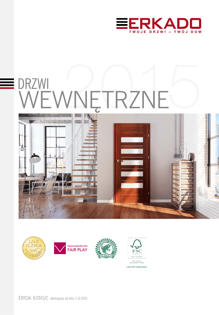 DRZWI WEWNĘTRZNE EDYCJA: II/2015/C obowiązuje od dnia 1.10.2015 SPIS TREŚCI DRZWI RAMIAKOWE STILE..........................................................................................4 LAWENDA............................................................8 FREZJA NOWOŚĆ .................................................. 10 NEMEZJA NOWOŚĆ ...............................................12 BERBERYS ....................................................... 14 FLOKS................................................................ 16 KROKUS ........................................................... 18 DALIA ................................................................20 MAGNOLIA.........................................................22 DRZWI SZKLANE GRAF KAMELIA............................................................ 24 JUKA.................................................................26 PETUNIA............................................................28 MALWA..............................................................30 IRYS...................................................................32 AZALIA...............................................................34 HIACYNT............................................................36 FRAGI NOWOŚĆ .....................................................38 ....................................................................................42 DRZWI PŁYTOWE......................................................................................................48 NOWOŚĆ BRAND..............................................................50 CETRA...............................................................50 SAMUN..............................................................50 DORA................................................................. 51 EKA................................................................... 51 MANHATTAN......................................................52 TOP...................................................................52 GAMA................................................................52 TOLEDO.............................................................53 DRZWI WEWNĘTRZNE WEJŚCIOWE DŹWIĘKOCHŁONNOŚĆ 32dB HERSE SET NOWOŚĆ .............................................62 HERSE LUX SET NOWOŚĆ ....................................63 HERSE MAX SET NOWOŚĆ ....................................66 Naszym atutem jest doświadczenie Jesteśmy rodzinną firmą, która swój prężny rozwój oraz dzisiejszy status zawdzięcza prawdziwym pasjonatom i najlepszym fachowcom - własnym przodkom. Nasza działalność w zakresie produkcji drzwi trwa z sukcesem nieprzerwanie już prawie 40 lat. W początkowych latach funkcjonowania firmy (rok 1976), naszą specjalizacją były różnorodne usługi stolarskie dla każdego rodzaju Klientów. Z czasem działalność naszą zawęziliśmy do drewnianych drzwi oraz okien, by w późniejszych latach wyspecjalizować się typowo w produkcji drzwi. Dzięki wyraźnemu ukierunkowaniu mogliśmy skupić się na konkretnym produkcie, zakupić coraz bardziej nowoczesny sprzęt do produkcji, podejmować coraz to nowe wyzwania związane z tym określonym profilem działalności. Ta odważna decyzja pozwoliła nam również na stałą poprawę jakości naszego produktu, dzięki czemu mogliśmy dołączyć do grona niekwestionowanych liderów w produkcji drzwi. BROADWAY........................................................53 GALERIA............................................................54 ALEJA NOWOŚĆ ....................................................54 UNO...................................................................54 ZEFIR.................................................................55 CORTINA ..........................................................55 UNO LUX NOWOŚĆ ...............................................56 CLASIC...............................................................57 .............................................................58 OŚCIEŻNICA STAŁA I REGULOWANA DO SERII HERSE SET NOWOŚĆ ...............................70 DRZWI WEWNĘTRZNE WEJŚCIOWE PRZECIWPOŻAROWE LEDA EI30 ......................................................... 71 DŹWIĘKOCHŁONNOŚĆ 32dB ............................71 LEDA EI60 ......................................................... 71 DRZWI HYBRYDOWE.................................................................................................73 BOSTON ........................................................... 74 MESA ...............................................................75 NEVADA ........................................................... 76 MONTANA ........................................................77 OMAHA ............................................................78 DALLAS ............................................................79 TAMPA .............................................................80 OKUCIA ....................................................................................................................81 Bogata oferta, ale i skupienie na indywidualnych potrzebach INFORMACJE TECHNICZNE........................................................................................84 Nasza firma od wielu, wielu lat specjalizuje się w szczególnej i wymagającej profesji, jaką jest wszechstronna produkcja drzwi. Przez wiele lat ciężkiej pracy i doskonalenia fachowych umiejętności doszliśmy niemal do perfekcji w kwestii nie tylko technicznego wykonania i wykończenia naszych wyrobów, ale i na płaszczyźnie oferowanego wyboru. ERKADO oferuje Państwu bogaty wybór zarówno drzwi wewnętrznych jak i zewnętrznych, które charakteryzują się niepowtarzalnym stylem, dopracowanymi detalami oraz najwyższą jakością wykonania. Wszystkie nasze produkty są zawsze aktualne z trendami i nowoczesne. Jednocześnie proponujemy modele zupełnie klasyczne i ponadczas