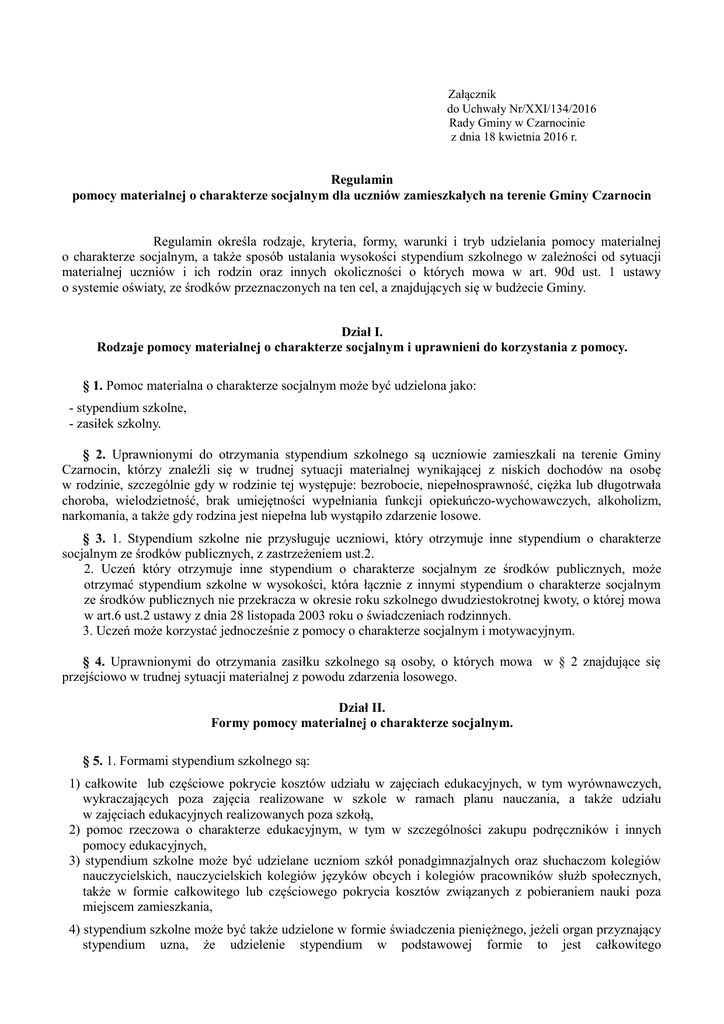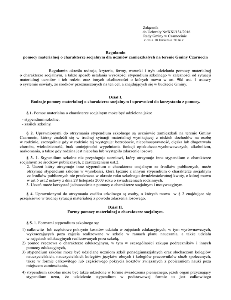 Załącznik do Uchwały Nr/XXI/134/2016 Rady Gminy w Czarnocinie z dnia 18 kwietnia 2016 r. Regulamin pomocy materialnej o charakterze socjalnym dla uczniów zamieszkałych na terenie Gminy Czarnocin Regulamin określa rodzaje, kryteria, formy, warunki i tryb udzielania pomocy materialnej o charakterze socjalnym, a także sposób ustalania wysokości stypendium szkolnego w zależności od sytuacji materialnej uczniów i ich rodzin oraz innych okoliczności o których mowa w art. 90d ust. 1 ustawy o systemie oświaty, ze środków przeznaczonych na ten cel, a znajdujących się w budżecie Gminy. Dział I. Rodzaje pomocy materialnej o charakterze socjalnym i uprawnieni do korzystania z pomocy. § 1. Pomoc materialna o charakterze socjalnym może być udzielona jako: - stypendium szkolne, - zasiłek szkolny. § 2. Uprawnionymi do otrzymania stypendium szkolnego są uczniowie zamieszkali na terenie Gminy Czarnocin, którzy znaleźli się w trudnej sytuacji materialnej wynikającej z niskich dochodów na osobę w rodzinie, szczególnie gdy w rodzinie tej występuje: bezrobocie, niepełnosprawność, ciężka lub długotrwała choroba, wielodzietność, brak umiejętności wypełniania funkcji opiekuńczo-wychowawczych, alkoholizm, narkomania, a także gdy rodzina jest niepełna lub wystąpiło zdarzenie losowe. § 3. 1. Stypendium szkolne nie przysługuje uczniowi, który otrzymuje inne stypendium o charakterze socjalnym ze środków publicznych, z zastrzeżeniem ust.2. 2. Uczeń który otrzymuje inne stypendium o charakterze socjalnym ze środków publicznych, może otrzymać stypendium szkolne w wysokości, która łącznie z innymi stypendium o charakterze socjalnym ze środków publicznych nie przekracza w okresie roku szkolnego dwudziestokrotnej kwoty, o której mowa w art.6 ust.2 ustawy z dnia 28 listopada 2003 roku o świadczeniach rodzinnych. 3. Uczeń może korzystać jednocześnie z pomocy o charakterze socjalnym i motywacyjnym. § 4. Uprawnionymi do otrzymania zasiłku szkolnego są osoby, o których mowa w § 2 znajdujące się przejściowo w trudnej sytuacji materialnej z powodu zdarzenia losowego. Dział II. Formy pomocy materialnej o charakterze socjalnym. § 5. 1. Formami stypendium szkolnego są: 1) całkowite lub częściowe pokrycie kosztów udziału w zajęciach edukacyjnych, w tym wyrównawczych, wykraczających poza zajęcia realizowane w szkole w ramach planu nauczania, a także udziału w zajęciach edukacyjnych realizowanych poza szkołą, 2) pomoc rzeczowa o charakterze edukacyjnym, w tym w szczególności zakupu podręczników i innych pomocy edukacyjnych, 3) stypendium szkolne może być udzielane uczniom szkół ponadgimnazjalnych oraz słuchaczom kolegiów nauczycielskich, nauczycielskich kolegiów języków obcych i kolegiów pracowników służb społecznych, także w formie całkowitego lub częściowego pokrycia kosztów związanych z pobieraniem nauki poza miejscem zamieszkania, 4) stypendium szkolne może być także udzielone w formie świadczenia pieniężnego, jeżeli organ przyznający stypendium uzna, że udzielenie stypendium w podstawowej formie to jest całkowitego lub częściowego pokrycia kosztów udziału w zajęciach edukacyjnych, w tym wyrównawczych, wykraczających poza zajęcia realizowane w szkole w ramach planu nauczania, a także udziału w zajęciach edukacyjnych realizowanych poza szkołą czy w formie pomocy rzeczowej o charakterze edukacyjnym, w tym w szczególności zakupu podręczników, a w przypadku uczniów szkół ponadgimnazjalnych także w formie, całkowitego lub częściowego pokrycia kosztów związanych z pobieraniem nauki poza miejscem zamieszkania nie jest możliwe. Natomiast w przypadku słuchaczy kolegiów nauczycielskich, nauczycielskich kolegiów języków obcych i kolegiów pracowników służb społecznych, udzielanie stypendium w formie całkowitego lub częściowego pokrycia kosztów udziału w zajęciach edukacyjnych, w tym wyrównawczych, wykraczających poza zajęcia realizowane w szkole w ramach planu nauczania, a także udziału w zajęciach edukacyjnych realizowanych poza szkołą czy w formie pomocy rzeczowej o charakterze edukacyjnym, w tym w szczególności zakupu podręczników, a także w formie, całkowitego lub częściowego pokrycia kosztów związanych z pobieraniem nauki poza miejscem zamieszkania, nie jest celowe. § 6.1. Pomoc polegająca na całkowitym lub częściowym pokryciu kosztów udziału w zajęciach edukacyjnych realizowanych w szkole lub poza szkołą, polega w szczególności na: 1) zwrocie kosztów uczestnictwa w zajęciach edukacyjnych, w tym m. in. nauka języków obcych, 2) kurs komputerowy, udział w „zielonej szkole”, udział w zorganizowanych wycieczkach szkolnych, itp., 3) zwrocie kosztów uczestnictwa w obozach sportowych oraz zajęciach pozaszkolnych związanych z rozwijaniem indywidualnych zdolności , w tym zwrocie kosztów zakupu niezbędnego oprzyrządowania, zwrocie kosztów korepetycji. 2. Pomoc rzeczowa o charakterze edukacyjnym polega w szczególności na zwrocie kosztów zakupu: 1) podręczników i materiałów szkolnych wymaganych do nauki; 2) stroju sportowego (nie częściej niż raz na półrocze) i obuwia sportowego (nie częściej niż dwa razy na półrocze); 3) przyrządów i odzieży niezbędnych na zajęcia praktyczne realizowane w szkołach; 4) kostiumu kąpielowego; 5) tornistra lub plecaka szkolnego (nie częściej niż raz w roku szkolnym); 6) sprzętu komputerowego i oprogramowania dla ucznia. 3. Stypendium szkolne może być udzielane uprawnionym ze szkół ponadgimnazjalnych oraz słuchaczom kolegiów, także w formie całkowitego lub częściowego pokrycia kosztów związanych z pobieraniem nauki poza miejscem zamieszkania. 4. Stypendium szkolne może być także udzielone w formie świadczenia pieniężnego, jeżeli Kierownik Ośrodka uzna, że udzielenie stypendium w formach, o których mowa w ust. 1 i 2, nie jest możliwe albo nie jest ce