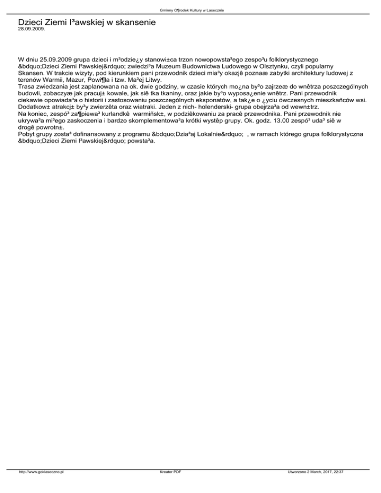 Gminny O¶rodek Kultury w Lasecznie Dzieci Ziemi I³awskiej w skansenie 28.09.2009. W dniu 25.09.2009 grupa dzieci i m³odzie¿y stanowi±ca trzon nowopowsta³ego zespo³u folklorystycznego „Dzieci Ziemi I³awskiej” zwiedzi³a Muzeum Budownictwa Ludowego w Olsztynku, czyli popularny Skansen. W trakcie wizyty, pod kierunkiem pani przewodnik dzieci mia³y okazjê poznaæ zabytki architektury ludowej z terenów Warmii, Mazur, Powi¶la i tzw. Ma³ej Litwy. Trasa zwiedzania jest zaplanowana na ok. dwie godziny, w czasie których mo¿na by³o zajrzeæ do wnêtrza poszczególnych budowli, zobaczyæ jak pracuj± kowale, jak siê tka tkaniny, oraz jakie by³o wyposa¿enie wnêtrz. Pani przewodnik ciekawie opowiada³a o historii i zastosowaniu poszczególnych eksponatów, a tak¿e o ¿yciu ówczesnych mieszkañców wsi. Dodatkow± atrakcj± by³y zwierzêta oraz wiatraki. Jeden z nich- holenderski- grupa obejrza³a od wewn±trz. Na koniec, zespó³ za¶piewa³ kurlandkê warmiñsk±, w podziêkowaniu za pracê przewodnika. Pani przewodnik nie ukrywa³a mi³ego zaskoczenia i bardzo skomplementowa³a krótki wystêp grupy. Ok. godz. 13.00 zespó³ uda³ siê w drogê powrotn±. Pobyt grupy zosta³ dofinansowany z programu „Dzia³aj Lokalnie” , w ramach którego grupa folklorystyczna „Dzieci Ziemi I³awskiej” powsta³a. http://www.goklaseczno.pl Kreator PDF Utworzono 2 March, 2017, 22:37