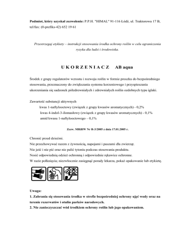 Podmiot, który uzyskał zezwolenie: P.P.H. "HIMAL" 91-116 Łódź, ul. Traktorowa 17 B, tel/fax: (0-prefiks-42) 652 19 61 Przestrzegaj etykiety – instrukcji stosowania środka ochrony roślin w celu ograniczenia ryzyka dla ludzi i środowiska. UKORZENIACZ AB aqua Środek z grupy regulatorów wzrostu i rozwoju roślin w formie proszku do bezpośredniego stosowania, przeznaczony do zwiększania systemu korzeniowego i przyspieszania ukorzeniania się sadzonek półzdrewniałych i zdrewniałych roślin ozdobnych typu iglaki. Zawartość substancji aktywnych kwas 1-naftylooctowy (związek z grupy kwasów aromatycznych) - 0,2% kwas 4-indol-3-ilomasłowy (związek z grupy kwasów aromatycznych) - 0,1% amid kwasu 1-naftylooctowego – 0,1% Zezw. MRiRW Nr R-3/2005 z dnia 17.01.2005 r. Chronić przed dziećmi. Nie przechowywać razem z żywnością, napojami i paszami dla zwierząt. Nie jeść i nie pić oraz nie palić tytoniu podczas stosowania produktu. Nosić odpowiednią odzież ochronną i odpowiednie rękawice ochronne. W razie połknięcia; niezwłocznie zasięgnąć porady lekarza, pokaż opakowanie lub etykietę. Uwaga: 1. Zabrania się stosowania środka w strefie bezpośredniej ochrony ujęć wody oraz na terenie rezerwatów i otulin parków narodowych. 2. Nie zanieczyszczać wód środkiem ochrony roślin lub jego opakowaniem. ZAKRES STOSOWANIA, TERMINY I DAWKI - Rośliny ozdobne ( pod osłonami ): - cyprysik, żywotnik, cis. Sadzonki zanurzyć do głębokości 0,5 cm w środku Ukorzeniacz AB aqua umieszczonym w płytkim naczyniu, nadmiar otrząsnąć, następnie wysadzić sadzonkę do podłoża (korzystnie perlitu)w uprzednio przygotowane dołki unikając starcia środka z sadzonki. Sadzonek nie zwilżać przed zanurzeniem w środku. OKRES KARENCJI ( okres od dnia ostatniego zabiegu do dnia zbioru roślin przeznaczonych do konsumpcji ) – nie dotyczy OKRES PREWENCJI DLA LUDZI, PSZCZÓŁ I ZWIERZĄT ( okres zapobiegający zatruciu ) – nie dotyczy WARUNKI BEZPIECZNEGO STOSOWANIA ŚRODKA Opróżnione opakowania traktować jako odpady komunalne. Zabrania się spalania opakowań po środku we własnym zakresie. UWAGA ZABRANIA SIĘ WYKORZYSTYWANIA OPRÓŻNIONYCH OPAKOWAŃ PO ŚRODKACH OCHRONY ROŚLIN DO INNYCH CELÓW, W TYM TAKŻE TRAKTOWANIA ICH JAKO SUROWCE WTÓRNE. PRZECHOWYWANIE Przechowywać wyłącznie w oryginalnym opakowaniu w temperaturze nie niższej niż 0oC i nie wyższej niż 30oC. POMOC MEDYCZNA W przypadku awarii lub jeśli źle się poczujesz, niezwłocznie zasięgnij porady lekarza (o ile to możliwe, należy pokazać etykietę). ANTIDOTUM: BRAK, STOSOWAĆ LECZENIE OBJAWOWE. W zaistniałych sytuacjach, kiedy wymagana jest lub konieczna inna pomoc medyczna niż ujęta w wyżej wymienionych ostrzeżeniach skontaktować się z najbliższym ośrodkiem toksykologicznym: Gdańsk - (0-prefiks-58) 301 65 16 Kraków - (0-prefiks-12) 411 99 99, Lublin - (0-prefiks-81) 740-26-76 Łódź Poznań - (0-prefiks-61) 847 69 46 Rzeszów - (0-prefiks-17) 866 44 09, Sosnowiec - (0-prefiks-32) 266 11 45 Warszawa - (0-prefiks-22) 619 08 97, Wrocław - (0-prefiks-71) 343 30 08 Okres ważności - 2 lata Data produkcji - ........ Zawartość netto - ........ Nr partii - ........ - (0-prefiks-42) 657 99 00,