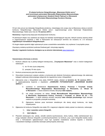 IX edycja konkursu fotograficznego „Mazowsze bliskie sercu” pod honorowym patronatem Marszałka Województwa Mazowieckiego, patronatem artystycznym Akademii Sztuk Pięknych w Warszawie oraz Patronatem Mazowieckiego Kuratora Oświaty. W tym roku już po raz dziewiąty fotografowie-amatorzy, mieszkający lub uczący się na Mazowszu staną w szranki konkursu fotograficznego „Mazowsze bliskie sercu”, organizowanego przez Samorząd Województwa Mazowieckiego. Nabór prac trwa do 16 czerwca 2014 r. Nowością w tegorocznej edycji jest dwuetapowość konkursu. W pierwszym etapie Jury wybierze nie więcej niż dziesięć wyróżniających się prac, których autorzy wezmą udział w organizowanych wspólnie z ASP w Warszawie we wskazanym terminie we wrześniu br. 2-3 dniowych wyjazdowych warsztatach fotograficznych. W drugim etapie spośród zdjęć wykonanych przez uczestników warsztatów Jury wybierze 3 zwycięskie prace. Zwycięzcy zostaną wyróżnieni podczas finałowej gali i otrzymają nagrody. Zasady i regulamin konkursu dostępne są na stronie internetowej www.mazovia.pl . Najważniejsze informacje w skrócie: 1. Konkurs odbywa się w jednej kategorii tematycznej: „Turystyczne Mazowsze” oraz w dwóch kategoriach wiekowych: 1) do 16 roku życia (włącznie), 2) powyżej 16 roku życia. 2. Konkurs przeznaczony jest dla amatorów. 3. Warunkiem koniecznym wzięcia udziału w konkursie jest złożenie formularza zgłoszeniowego dla właściwej kategorii wiekowej (stanowiącego załączniki do regulaminu) wraz z fotografiami. 4. Zgłoszenia wraz z fotografiami oraz płytą CD/DVD należy składać w terminie do 16 czerwca 2014 r. w zapieczętowanej kopercie z dopiskiem: „KONKURS FOTOGRAFICZNY „MAZOWSZE BLISKIE SERCU”: 5. 6. 1) osobiście w sekretariacie Departamentu Kultury, Promocji i Turystyki Urzędu Marszałkowskiego Województwa Mazowieckiego w Warszawie, ul. Okrzei 35 w Warszawie – o dacie złożenia wniosku decyduje data wpływu, 2) lub drogą pocztową na adres: Urząd Marszałkowski Województwa Mazowieckiego w Warszawie, Departament Kultury, Promocji i Turystyki, ul. Okrzei 35, 03 – 715 Warszawa – o dacie złożenia wniosku decyduje data stempla pocztowego bądź stempel nadania w przypadku przesyłki kurierskiej. 3) Zgłoszenia złożone poza terminem określonym dla danej edycji konkursu, nie będą rozpatrywane. Zgłaszane do konkursu fotografie oraz płytę CD z nagranym zdjęciem należy opisać na odwrocie, wskazując: 1) imię i nazwisko autora fotografii, 2) tytuł zdjęcia. Placówki edukacyjne (np. szkoły, ośrodki szkolno-wychowawcze, domy kultury, kółka zainteresowań itp.) mogą nadsyłać zbiorczo fotografie uczniów/wychowanków na konkurs, przy czym fotografia każdej osoby wraz z formularzem zgłoszeniowym musi być wyraźnie rozdzielona (osobna koperta z imieniem i nazwiskiem każdego uczestnika wewnątrz jednej koperty zbiorczej). 7. Nagrodami w konkursie są: 1) I nagroda – karta podarunkowa do sklepu fotograficznego o wartości 600 zł; 2) II nagroda – karta podarunkowa do sklepu fotograficznego o wartości 500 zł; 3) III nagroda – karta podarunkowa do sklepu fotograficznego o wartości 400 zł; 4) nagroda publiczności - internautów – karta podarunkowa do sklepu fotograficznego o wartości 400 zł. UWAGA! Pełna informacja na temat zasad konkursu oraz wzory formularzy zgłoszeniowych znajdują się w regulaminie. Prace nie spełniające wymogów formalnych nie zostaną dopuszczone do konkursu. Formuła konkursu nie przewiduje możliwości składania prac grupowych. Wszelkie informacje o konkursie można otrzymać pod nr tel. (22) 59 79 532 lub wysyłając pytania na adres e-mail: [email protected] . Znajdziecie nas także na: www.facebook.com/Mazowsze.serce.Polski