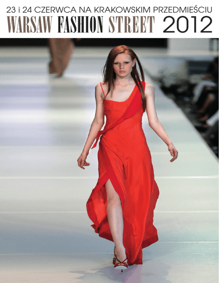 23 i 24 CZERWCA NA KRAKOWSKIM PRZEDMIEŚCIU 2012 Szanowni Państwo, Już po raz ósmy mam wielki zaszczyt zaprosić na Warsaw Fashion Street. Święto mody, kultury i sztuki. Tematem przewodnim tegorocznej edycji jest sztuka i malarstwo, które stanowiły źródło inspiracji dla projektantów przy tworzeniu niezwykłych kolekcji. Podczas Warsaw Fashion Street odbędą się pokazy mody. Pragnę podziękować wszystkim naszym partnerom, artystom i projektantom biorącym udział w Warsaw Fashion Street 2012 za zaangażowanie i wsparcie w realizacji tego przedsięwzięcia. Do zobaczenie w przyszłym roku. Zapraszam Dorota Wróblewska Producent MediaSukces s.c. To już VIII edycja Warsaw Fashion Street. Jakie były początki? Skąd narodził się pomysł na zorganizowanie tak dużego wydarzenia modowego w Polsce? Pomysł narodził się z potrzeby. Wydarzenie jest otwarte dla szerokiego grona publiczności, które zainteresowane jest modą i kulturą . Jest to wspaniała promocja Warszawy, która pokazuje się od innej strony, strony twórczej. Która edycja WFS zapadła Tobie najbardziej w pamięci? Pierwsza, która odbyła się na Nowym Świecie. Była najtrudniejsza i najkrótsza, nikt w nią jeszcze wtedy nie wierzył. Ile trwają przygotowania do realizacji tak dużego projektu, jakim jest WFS? Przygotowania trwają od końca poprzedniej edycji. Przez cały rok wybieram kolekcje, siedząc w jury w różnych konkursach. Natomiast intensywnie pracujemy 6 miesięcy przed wydarzeniem. W tym samym czasie trwa Euro 2012. Nie obawiałaś się, że społeczeństwo będzie skoncentrowane właśnie na tym i WFS nie przyciągnie tak dużej publiczności jak co roku? Wręcz przeciwnie, cieszę się że WFS odbywa się w trakcie Euro 2012, mimo że jest to najtrudniejsza edycja ze wszystkich pod względem finansowym, bo wszystkie budżety promocyjne wspierają Mistrzostwa. Podczas naszego wydarzenia będzie w Warszawie około 100 000 turystów, a na wybiegu ani jednego akcentu związanego z piłką nożną. Skąd czerpiesz pomysły i inspiracje do swoich projektów? Inspirują mnie projektanci. Pomysły rodzą się w różnych okolicznościach, przeważnie podczas podróży i słuchania muzyki. Czasami może to być jakaś sytuacja lub zdjęcie Co nowego w tegorocznej edycji WFS? Po sukcesie Street of Design zadecydowaliśmy, że będą showroomy, wystawy, konkursy. Na ulicy postawimy duży stół, na którym będzie można podziwiać kolekcje projektantów biżuterii, realizujemy ten pomysł we współpracy z Kuchnią Tv pod patronatem mojego bloga. Czy masz już plany na kolejną edycję? W przyszłym roku Warsaw Fashion Street będzie dedykowane i inspirowane naturą oraz ekologią. Konkursy, pokazy mody, a nawet scenografia wszystkich zaskoczy. Jak myślisz, ile czasu potrzebujemy na zmianę w myśleniu i postrzeganiu mody w Polsce? Myślę, że ta zmiana już nastąpiła, a dowodem tego jest druga edycja książki Fashion People Colours. Zmieniają się ulice, są bardziej kolorowe, ludzie są bardziej odważni. Brakuje nam jeszcze tolerancji, ale i tę lekcję odrabiamy. Twoja złota rada dla osób, które chcą odnieść sukces, nie tylko w modzie? Marzenia przekładać na plany i zawsze myśleć pozytywnie. Nie poddawać się i pracować. Co zmieniło się przez te lata? Zmienił się wybieg, miejsce z Nowego Światu na Krakowskie Przedmieście, publiczność która jest większa i bije rekordy oraz projektanci których poziom jest coraz wyższy. Abstrahując od wszystkiego: O czym marzy Dorota Wróblewska? O spokoju, wyłączonym telefonie i grillu w towarzystwie przyjaciół. Rozmawiała Magdalena Iwańska PROGRAM WARSAW FASHION STREET 2012 SCENA GŁÓWNA – 24 CZERWCA 2012 11.30-21.30 11:30 Children Fashion Show Pokaz kolekcji Matel Rozwiązanie konkursu – Zaprojektuj sukienkę dla Barbie Pokaz kolekcji „Prosto z bajki” z udziałem Omeny Mensah 12:00 Projektanci CRACOW FASHION AWARDS 2012 – pokazy nagrodzonych kolekcji: • Alicja Wala • Weronika Szynczewska • Joanna Buksiak • Anna Kraszewska • Agnieszka Piekarczyk • Anna Wiszniewska • Anna Walicka Projektanci OFF FASHION KIELCE 2012 – pokazy nagrodzonych kolekcji: • George Stoilov • Jacek Mroczkowski • Magdalena Stępnik Kozłowska • Natalia Ślizowska • Lidia Sajdak • Emilia Jankowska • Marcin Tomaszewski • Ireneusz Rolewski • Karolina Marczuk 13.30 POKAZ CHARYTATYWNY Z UDZIAŁEM GWIAZD – FUNDACJA SPEŁNIONYCH MARZEŃ Pokaz kolekcji dziecięcej Endo z udziałem Gwiazd i podopiecznych Fundacji Spełnionych Marzeń: • Szymon Majewski • Andrzej Nejman • Kamil Durczok • Bilguun Ariunbaatar • Andrzej Grabowski • Jan Wieczorkowski • Mateusz Damięcki • Anna Przybylska • Anna Dereszowska • Patrycja Markowska • Edyta Olszówka • Anna Samusionek • Maja Hirsch Wręczenie czeku od firmy Endo dla Fundacji Spełnionych Marzeń Pokaz PERWOLL – specjlnie przygotowany program Prowadzący – Olivier Janiak Gwiazda – Sylwia Gliwa TALENT WARSAW FASHION STREET – pokazy kolekcji konkursowych: • Ewelina Jaśkowiec • Karolina Arasimowicz • Justyna Czekała • Marta Kuba • Ola Bajer • Maciej Trzmiel • Zuzanna Szamocka Spotkanie z Krzysztofem Łoszewskim – Autorem książki „Dress Code” NEW LOOK DESGN 2012 – pokazy kolekcji konkursowych: • Barbara Mucha • Iwona Wołowiec • Katarzyna Janeczek • Anna Palka-Nowak • Lidia Schabowska • Ewelina Mederska • Anna Kaczmarek-Janowska • Danuta i Anna Dąbrowska • Monika Makowska • Ilona Urbańska-Grzyb • Aleksandra Ciapka • Joanna Augustyn • Monika Szymczak • Piotr Pandyra • Bogusława Jaworska-Zniszczoł Ewelina Smok – pokaz Laureatki konkursu NEW LOOK DESIGN 2011 kolekcji Venezia – pokaz kolekcji najnowszych kolekcji Unisono – pokaz kolekcji Six – pokaz bizuterii Viola Arlak Katarzyna Żak POKAZ CHARYTATYWNY – DWUNASTU POLSKICH PROJEKTANTÓW NA RZECZ DZIECI „ Zaradna mama” pokaz z ud