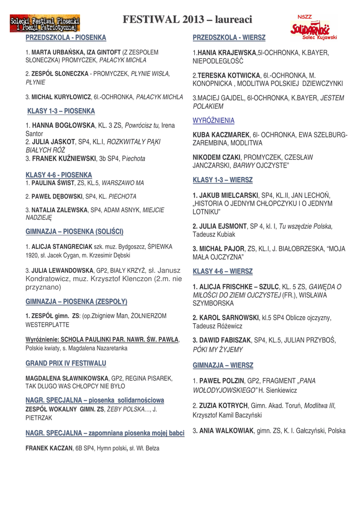 FESTIWAL 2013 – laureaci PRZEDSZKOLA - PIOSENKA PRZEDSZKOLA - WIERSZ 1. MARTA URBA SKA, IZA GINTOFT (Z ZESPOŁEM SŁONECZKA) PROMYCZEK, PAŁACYK MICHLA 1.HANIA KRAJEWSKA,5l-OCHRONKA, K.BAYER, NIEPODLEGŁO 2. ZESPÓŁ SŁONECZKA - PROMYCZEK, PŁYNIE WISŁA, PŁYNIE 2.TERESKA KOTWICKA, 6l.-OCHRONKA, M. KONOPNICKA , MODLITWA POLSKIEJ DZIEWCZYNKI 3. MICHAŁ KURYŁOWICZ, 6l.-OCHRONKA, PAŁACYK MICHLA 3.MACIEJ GAJDEL, 6l-OCHRONKA, K.BAYER, JESTEM POLAKIEM KLASY 1-3 – PIOSENKA 1. HANNA BOGŁOWSKA, KL. 3 ZS, Powrócisz tu, Irena Santor 2. JULIA JASKOT, SP4, KL.I, ROZKWITAŁY P KI BIAŁYCH RÓ 3. FRANEK KU NIEWSKI, 3b SP4, Piechota KLASY 4-6 - PIOSENKA 1. PAULINA WIST, ZS, KL.5, WARSZAWO MA 2. PAWEŁ D BOWSKI, SP4, KL. PIECHOTA 3. NATALIA ZALEWSKA, SP4, ADAM ASNYK, MIEJCIE NADZIEJ WYRÓ NIENIA KUBA KACZMAREK, 6l- OCHRONKA, EWA SZELBURGZAREMBINA, MODLITWA NIKODEM CZAKI, PROMYCZEK, CZESŁAW JANCZARSKI, BARWY OJCZYSTE” KLASY 1-3 – WIERSZ 1. JAKUB MIELCARSKI, SP4, KL.II, JAN LECHO , „HISTORIA O JEDNYM CHŁOPCZYKU I O JEDNYM LOTNIKU” GIMNAZJA – PIOSENKA (SOLI CI) 2. JULIA EJSMONT, SP 4, kl. I, Tu wsz dzie Polska, Tadeusz Kubiak 1. ALICJA STANGRECIAK szk. muz. Bydgoszcz, PIEWKA 1920, sł. Jacek Cygan, m. Krzesimir D bski 3. MICHAŁ PAJOR, ZS, KL.I, J. BIAŁOBRZESKA, “MOJA MAŁA OJCZYZNA” 3. JULIA LEWANDOWSKA, GP2, BIAŁY KRZY , sł. Janusz KLASY 4-6 – WIERSZ GIMNAZJA – PIOSENKA (ZESPOŁY) 1. ALICJA FRISCHKE – SZULC, KL. 5 ZS, GAW DA O MIŁO CI DO ZIEMI OJCZYSTEJ (FR.), WISŁAWA SZYMBORSKA 1. ZESPÓŁ gimn. ZS: (op.Zbigniew Man, OŁNIERZOM WESTERPLATTE 2. KAROL SARNOWSKI, kl.5 SP4 Oblicze ojczyzny, Tadeusz Ró ewicz Wyró nienie: SCHOLA PAULINKI PAR. NAWR. W. PAWŁA, Polskie kwiaty, s. Magdalena Nazaretanka 3. DAWID FABISZAK, SP4, KL.5, JULIAN PRZYBO , PÓKI MY YJEMY GRAND PRIX IV FESTIWALU GIMNAZJA – WIERSZ MAGDALENA SŁAWNIKOWSKA, GP2, REGINA PISAREK, TAK DŁUGO WAS CHŁOPCY NIE BYŁO 1. PAWEŁ POLZIN, GP2, FRAGMENT „PANA WOŁODYJOWSKIEGO” H. Sienkiewicz Kondratowicz, muz. Krzysztof Klenczon (2.m. nie przyznano) NAGR. SPECJALNA – piosenka solidarno ciowa ZESPÓŁ WOKALNY GIMN. ZS, EBY POLSKA…, J. PIETRZAK 2. ZUZIA KOTRYCH, Gimn. Akad. Toru , Modlitwa III, Krzysztof Kamil Baczy ski NAGR. SPECJALNA – zapomniana piosenka mojej babci 3. ANIA WALKOWIAK, gimn. ZS, K. I. Gałczy ski, Polska FRANEK KACZAN, 6B SP4, Hymn polski, sł. Wł. Bełza