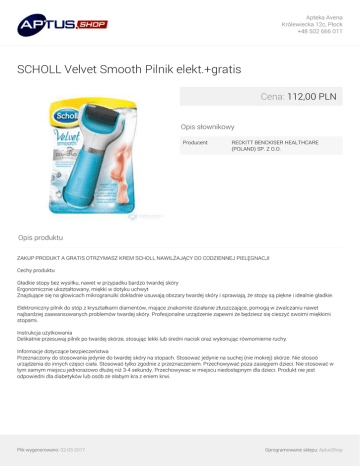 Apteka Avena Królewiecka 12c, Płock +48 502 666 011 SCHOLL Velvet Smooth Pilnik elekt.+gratis Cena: 112,00 PLN Opis słownikowy Producent RECKITT BENCKISER HEALTHCARE (POLAND) SP. Z O.O. Opis produktu ZAKUP PRODUKT A GRATIS OTRZYMASZ KREM SCHOLL NAWILŻAJĄCY DO CODZIENNEJ PIELĘGNACJI Cechy produktu Gładkie stopy bez wysiłku, nawet w przypadku bardzo twardej skóry Ergonomicznie ukształtowany, miękki w dotyku uchwyt Znajdujące się na głowicach mikrogranulki dokładnie usuwają obszary twardej skóry i sprawiają, że stopy są piękne i idealnie gładkie. Elektroniczny pilnik do stóp z kryształkami diamentów, mające znakomite działanie złuszczające, pomogą w zwalczaniu nawet najbardziej zaawansowanych problemów twardej skóry. Profesjonalne urządzenie zapewni że będziesz się cieszyć swoimi miękkimi stopami. Instrukcja użytkowania Delikatnie przesuwaj pilnik po twardej skórze, stosując lekki lub średni nacisk oraz wykonując równomierne ruchy. Informacje dotyczące bezpieczeństwa Przeznaczony do stosowania jedynie do twardej skóry na stopach. Stosować jedynie na suchej (nie mokrej) skórze. Nie stosoó urządzenia do innych częsci ciała. Stosowaó tylko zgodnie z przeznaczeniem. Przechowywać poza zasięgiem dzieci. Nie stosować w tym samym miejscu jednorazowo dłużej niż 3-4 sekundy. Przechowywac w miejscu niedostępnym dla dzieci. Produkt nie jest odpowiedni dla diabetyków lub osób ze słabym krążeniem krwi. Plik wygenerowano: 02-03-2017 Powered by TCPDF (www.tcpdf.org) Oprogramowanie sklepu: AptusShop