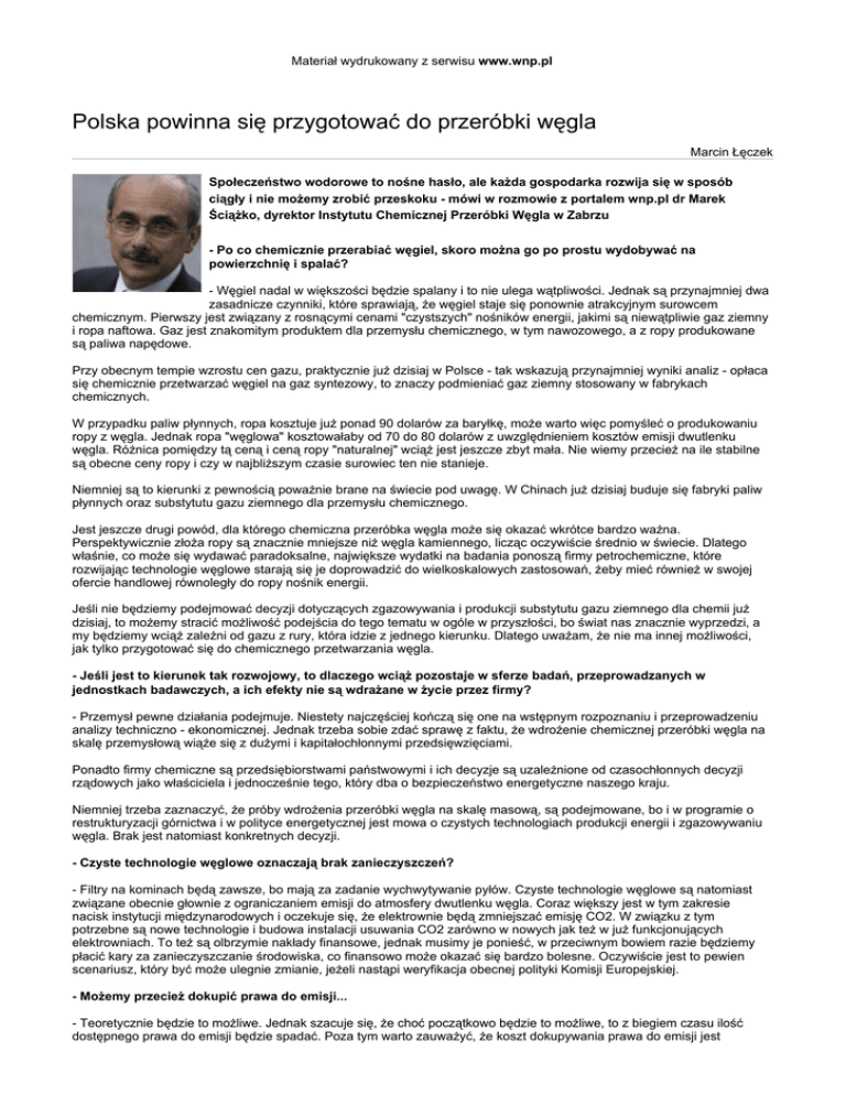 Materiał wydrukowany z serwisu www.wnp.pl Polska powinna się przygotować do przeróbki węgla Marcin Łęczek Społeczeństwo wodorowe to nośne hasło, ale każda gospodarka rozwija się w sposób ciągły i nie możemy zrobić przeskoku - mówi w rozmowie z portalem wnp.pl dr Marek Ściążko, dyrektor Instytutu Chemicznej Przeróbki Węgla w Zabrzu - Po co chemicznie przerabiać węgiel, skoro można go po prostu wydobywać na powierzchnię i spalać? - Węgiel nadal w większości będzie spalany i to nie ulega wątpliwości. Jednak są przynajmniej dwa zasadnicze czynniki, które sprawiają, że węgiel staje się ponownie atrakcyjnym surowcem chemicznym. Pierwszy jest związany z rosnącymi cenami "czystszych" nośników energii, jakimi są niewątpliwie gaz ziemny i ropa naftowa. Gaz jest znakomitym produktem dla przemysłu chemicznego, w tym nawozowego, a z ropy produkowane są paliwa napędowe. Przy obecnym tempie wzrostu cen gazu, praktycznie już dzisiaj w Polsce - tak wskazują przynajmniej wyniki analiz - opłaca się chemicznie przetwarzać węgiel na gaz syntezowy, to znaczy podmieniać gaz ziemny stosowany w fabrykach chemicznych. W przypadku paliw płynnych, ropa kosztuje już ponad 90 dolarów za baryłkę, może warto więc pomyśleć o produkowaniu ropy z węgla. Jednak ropa "węglowa" kosztowałaby od 70 do 80 dolarów z uwzględnieniem kosztów emisji dwutlenku węgla. Różnica pomiędzy tą ceną i ceną ropy "naturalnej" wciąż jest jeszcze zbyt mała. Nie wiemy przecież na ile stabilne są obecne ceny ropy i czy w najbliższym czasie surowiec ten nie stanieje. Niemniej są to kierunki z pewnością poważnie brane na świecie pod uwagę. W Chinach już dzisiaj buduje się fabryki paliw płynnych oraz substytutu gazu ziemnego dla przemysłu chemicznego. Jest jeszcze drugi powód, dla którego chemiczna przeróbka węgla może się okazać wkrótce bardzo ważna. Perspektywicznie złoża ropy są znacznie mniejsze niż węgla kamiennego, licząc oczywiście średnio w świecie. Dlatego właśnie, co może się wydawać paradoksalne, największe wydatki na badania ponoszą firmy petrochemiczne, które rozwijając technologie węglowe starają się je doprowadzić do wielkoskalowych zastosowań, żeby mieć również w swojej ofercie handlowej równoległy do ropy nośnik energii. Jeśli nie będziemy podejmować decyzji dotyczących zgazowywania i produkcji substytutu gazu ziemnego dla chemii już dzisiaj, to możemy stracić możliwość podejścia do tego tematu w ogóle w przyszłości, bo świat nas znacznie wyprzedzi, a my będziemy wciąż zależni od gazu z rury, która idzie z jednego kierunku. Dlatego uważam, że nie ma innej możliwości, jak tylko przygotować się do chemicznego przetwarzania węgla. - Jeśli jest to kierunek tak rozwojowy, to dlaczego wciąż pozostaje w sferze badań, przeprowadzanych w jednostkach badawczych, a ich efekty nie są wdrażane w życie przez firmy? - Przemysł pewne działania podejmuje. Niestety najczęściej kończą się one na wstępnym rozpoznaniu i przeprowadzeniu analizy techniczno - ekonomicznej. Jednak trzeba sobie zdać sprawę z faktu, że wdrożenie chemicznej przeróbki węgla na skalę przemysłową wiąże się z dużymi i kapitałochłonnymi przedsięwzięciami. Ponadto firmy chemiczne są przedsiębiorstwami państwowymi i ich decyzje są uzależnione od czasochłonnych decyzji rządowych jako właściciela i jednocześnie tego, który dba o bezpieczeństwo energetyczne naszego kraju. Niemniej trzeba zaznaczyć, że próby wdrożenia przeróbki węgla na skalę masową, są podejmowane, bo i w programie o restrukturyzacji górnictwa i w polityce energetycznej jest mowa o czystych technologiach produkcji energii i zgazowywaniu węgla. Brak jest natomiast konkretnych decyzji. - Czyste technologie węglowe oznaczają brak zanieczyszczeń? - Filtry na kominach będą zawsze, bo mają za zadanie wychwytywanie pyłów. Czyste technologie węglowe są natomiast związane obecnie głownie z ograniczaniem emisji do atmosfery dwutlenku węgla. Coraz większy jest w tym zakresie nacisk instytucji międzynarodowych i oczekuje się, że elektrownie będą zmniejszać emisję CO2. W związku z tym potrzebne są nowe technologie i budowa instalacji usuwania CO2 zarówno w nowych jak też w już funkcjonujących elektrowniach. To też są olbrzymie nakłady finansowe, jednak musimy je ponieść, w przeciwnym bowiem razie będziemy płacić kary za zanieczyszczanie środowiska, co finansowo może okazać się bardzo bolesne. Oczywiście jest to pewien scenariusz, który być może ulegnie zmianie, jeżeli nastąpi weryfikacja obecnej polityki Komisji Europejskiej. - Możemy przecież dokupić prawa do emisji... - Teoretycznie będzie to możliwe. Jednak szacuje się, że choć początkowo będzie to możliwe, to z biegiem czasu ilość dostępnego prawa do emisji będzie spadać. Poza tym warto zauważyć, że koszt dokupywania prawa do emisji jest porównywalny z kosztami sekwestracji CO2 - wliczając w to wyodrębnienie gazu, jego transport i podziemne składowanie. Zasadą czystych technologii jest, że po wychwyceniu CO2 będzie on zatłaczany do składowisk podziemnych, czyli poniekąd usuwany ze środowiska. Tylko w warunkach trwałego przechowywania CO2 ma ono sens, inaczej bowiem kiedy gaz wydostanie się na zewnątrz bilans wyjdzie na zero z tą tylko różnicą, że gaz nie będzie się uwalniał podczas spalania, a uwolnimy go sami. W Polsce podziemne zatłaczanie dwutlenku węgla prowadzi się, choć wciąż na niewielką skalę. PGNiG. w Borzęcinie lokuje się pod ziemią CO2 z wydobywanego metanu. Oczywiście nie wszędzie jest to możliwe, bo zbiornik podziemny, choć naturalny, musi się charakteryzować pewnymi właściwościami technicznymi, chemicznymi i fizycznymi. Muszą być spełnione takie specyficzne warunki geologiczne, żeby zbiornik był szczelny, a jednocześnie żeby gromadzony gaz ni