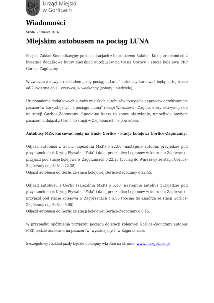 Wiadomości Środa, 23 marca 2016 Miejskim autobusem na pociąg LUNA Miejski Zakład Komunikacyjny po konsultacjach z burmistrzem Rafałem Kuklą uruchomi od 2 kwietnia dodatkowe kursy miejskich autobusów na trasie Gorlice – stacja kolejowa PKP Gorlice-Zagórzany. W związku z nowym rozkładem jazdy pociągu „Luna” autobusy kursować będą na tej trasie od 2 kwietnia do 11 czerwca, w weekendy (soboty i niedziele). Uruchomienie dodatkowych kursów miejskich autobusów to wyjście naprzeciw oczekiwaniom pasażerów korzystających z pociągu „Luna” relacji Warszawa – Zagórz, który zatrzymuje się na stacji Gorlice-Zagórzany. Specjalne kursy to spore ułatwienie, umożliwią bowiem pasażerom dojazd z Gorlic do stacji w Zagórzanach i z powrotem. Autobusy MZK kursować będą na trasie Gorlice – stacja kolejowa Gorlice-Zagórzany: Odjazd autobusu z Gorlic (zajezdnia MZK) o 22.00 (następnie autobus przyjedzie pod przystanek obok Krytej Pływalni "Fala" i dalej przez ulicę Legionów w kierunku Zagórzan) – przyjazd pod stację kolejową w Zagórzanach o 22.25 (pociąg do Warszawy ze stacji GorliceZagórzany odjeżdża o 22.35). Odjazd autobusu do Gorlic ze stacji kolejowej Gorlice-Zagórzany o 22.45. Odjazd autobusu z Gorlic (zajezdnia MZK) o 5.30 (następnie autobus przyjedzie pod przystanek obok Krytej Pływalni "Fala" i dalej przez ulicę Legionów w kierunku Zagórzan) – przyjazd pod stację kolejową w Zagórzanach o 5.55 (pociąg do Zagórza ze stacji GorliceZagórzany odjeżdża o 6.05). Odjazd autobusu do Gorlic ze stacji kolejowej Gorlice-Zagórzany o 6.15. W przypadku opóźnienia przyjazdu pociągu do stacji kolejowej Gorlice-Zagorzany autobus MZK będzie oczekiwał na pasażerów wysiadających w Zagórzanach. Szczegółowy rozkład jazdy będzie dostępny wkrótce na stronie: www.mzkgorlice.pl