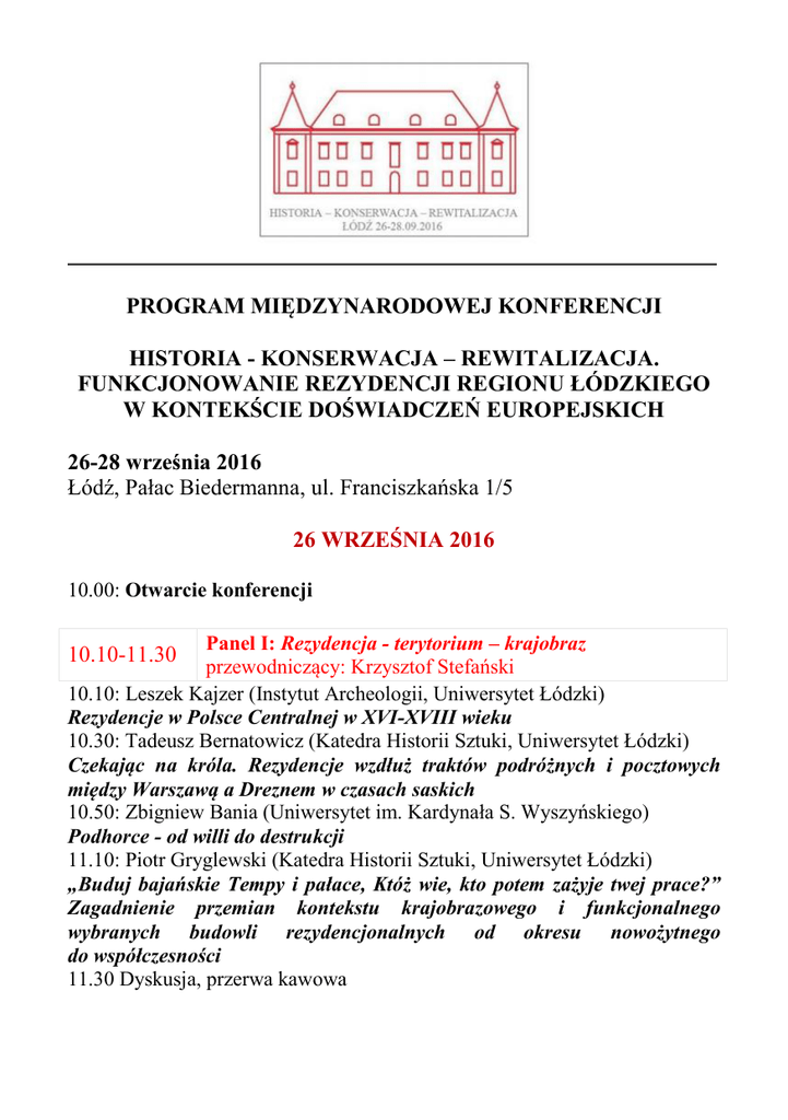 PROGRAM MIĘDZYNARODOWEJ KONFERENCJI HISTORIA - KONSERWACJA – REWITALIZACJA. FUNKCJONOWANIE REZYDENCJI REGIONU ŁÓDZKIEGO W KONTEKŚCIE DOŚWIADCZEŃ EUROPEJSKICH 26-28 września 2016 Łódź, Pałac Biedermanna, ul. Franciszkańska 1/5 26 WRZEŚNIA 2016 10.00: Otwarcie konferencji Panel I: Rezydencja - terytorium – krajobraz przewodniczący: Krzysztof Stefański 10.10: Leszek Kajzer (Instytut Archeologii, Uniwersytet Łódzki) Rezydencje w Polsce Centralnej w XVI-XVIII wieku 10.30: Tadeusz Bernatowicz (Katedra Historii Sztuki, Uniwersytet Łódzki) Czekając na króla. Rezydencje wzdłuż traktów podróżnych i pocztowych między Warszawą a Dreznem w czasach saskich 10.50: Zbigniew Bania (Uniwersytet im. Kardynała S. Wyszyńskiego) Podhorce - od willi do destrukcji 11.10: Piotr Gryglewski (Katedra Historii Sztuki, Uniwersytet Łódzki) „Buduj bajańskie Tempy i pałace, Któż wie, kto potem zażyje twej prace?” Zagadnienie przemian kontekstu krajobrazowego i funkcjonalnego wybranych budowli rezydencjonalnych od okresu nowożytnego do współczesności 11.30 Dyskusja, przerwa kawowa 10.10-11.30 12.00-13.40 Panel II: Rezydencje wiejskie - nowe odkrycia i identyfikacje przewodniczący: Tadeusz Bernatowicz 12.00: Alicja Król-Kamińska (Bratoszewice) Bratoszewice i Rzewuscy. Dzieje rodziny i jej rezydencji 12.20: Ewa Janina Sadowska (Politechnika Krakowska) „Sibi amico et posteritati” i „Z darów Bożych” czyli podkrakowskie rezydencje rodzin Żeleńskich w Grodkowicach i Badenich w Wadowie 12.40: Klara Kantorowicz (Politechnika Warszawska) Edukacja w zespołach rezydencjonalnych województwa łódzkiego 13.00: Daria Rutkowska-Siuda (Katedra Historii Sztuki, Uniwersytet Łódzki) Dwór w Dłużewie – historia utrwalona. Rewitalizacja obiektu warszawskiego ASP 13.20: Marta Rajewska (Uniwersytet Kazimierza Wielkiego w Bydgoszczy) Rezydencje gminy Ujście – wczoraj i dziś 13.40: Dyskusja, przerwa obiadowa Panel III: Rezydencje burżuazji przemysłowej regionu łódzkiego przewodniczący: Jakub Sito 14.30: Katarzyna Schatt-Babińska (Katedra Historii Sztuki, Uniwersytet Łódzki) Ile z zabytku pozostało w zrekonstruowanej willi? 14.50: Maria Dankowska (Politechnika Łódzka, Miejska Pracownia Urbanistyczna w Łodzi) Łódzkie rezydencje z XIX i początku XX w. – stan ochrony, stan zachowania 15.10: Krzysztof Stefański (Katedra Historii Sztuki, Uniwersytet Łódzki) Pałac Schlösserów w Ozorkowie i Friedrich Adler 15.30: Olga Tuszyńska-Szczepaniak (Centralne Muzeum Włókiennictwa w Łodzi, Uniwersytet Łódzki) „Augustówka” – założenie pałacowo-parkowe w Zgierzu 15.50: Krzysztof Cichoń, Ewa Kubiak (Katedra Historii Sztuki, Uniwersytet Łódzki) Tradycja czy manifestacja. Nowe rezydencje w Polsce na przełomie XX i XXI w. 16.10: Dyskusja, przerwa kawowa 14.30-16.10 Panel IV: Wokół dworów: doświadczenia właścicieli przewodniczący: Krzysztof Stefański 16.40: Olga Jagielińska (Babsk) Dwór w Babsku 17.00: Piotr Biliński („Piotr Biliński Architekt”) Dwór w Sułkowicach Pierwszych 17.20: Marzena Lachowska (Węgrzynowice) Dwór w Węgrzynowicach 17.40 Dyskusja 16.40-17.40 19.00: Bankiet 27 WRZEŚNIA 2016 Panel V: Współczesne problemy rewitalizacji rezydencji przewodnicząca: Volha Popko 9.30: Aleksandra Marcinów (Politechnika Wrocławska) Adaptacje rezydencji Dolnego Śląska do współczesnych funkcji użytkowych 09.50: Andrzej Borucki (Muzeum w Łęczycy) Zamek w Łęczycy 10.10: Anna Czerwińska (Muzeum w Nieborowie i Arkadii) Nieborów i Arkadia. Problemy ochrony krajobrazowego otoczenia rezydencji Radziwiłłów. 10.30: Piotr A. Stasiak (Muzeum Regionalne w Kutnie) Królewski pałac pocztowy (podróżny) Augusta III w Kutnie 10.50: Dyskusja, przerwa kawowa 09.30-10.50 Panel VI: Doświadczenia europejskie i polskie przewodniczący: Zbigniew Bania 11.20: Volha Popko (Muzeum Kompleks Zamkowy „Mir”, Białoruś) Zamek Mirski w XX – pocz. XXI wieku: los romantycznej ruiny, która stała muzeum i światowym dziedzictwem 11.40: Natalja Pjech (Państwowy Historyczno-Architektoniczny Rezerwat w Żółkwi, Ukraina) Zamek w Żółkwi w świetle najnowszych badań naukowych. Obecny stan rezydencji królewskiej, tworzenie koncepcji muzeum i zagospodarowania zamku Żółkiewskiego na podstawie nowych doświadczeń 12.00: Vadzim Glinnik (Centrum Naukowo-Projektowe „RESTABILIS”, Białoruś) Romaniszki. Planowana rekonstrukcja historycznej siedziby 12.20: Anna Tejszerska (Katolicki Uniwersytet Lubelski) Dwory lubelskich uczelni 11.20-12.40 12.40: Dyskusja, przerwa kawowa Panel VII: Współczesność rezydencji arystokratycznych przewodniczący: Piotr Gryglewski 13.10: Witold Czartoryski (Pełkinie) Odzyskane dziedzictwo. Program rewaloryzacji pałacu w Pełkiniach i jego realizacja 13.30: Alina Barczyk (Katedra Historii Sztuki, Uniwersytet Łódzki) Pałac w Dęblinie. Historia i adaptacja na siedzibę szkoły lotniczej 13.50: Marzena Żemejda-Zybura (Akademia im. Jana Długosza w Częstochowie) Działalność rodziny Lubomirskich w Kruszynie 14.10: Emilia Pełka (Instytut Sztuki Polskiej Akademii Nauk) Wyszków nad Liwcem: barokowe założenie urbanistyczne, rezydencjonalne i sakralne na Podlasiu. 14.30 Dyskusja, przerwa obiadowa 13.10-14.30 Panel VIII: Wokół pałacu: ogrody i ich wyposażenie przewodnicząca: Ewa Kubiak 15.20: Jakub Sito (Instytut Sztuki Polskiej Akademii Nauk) Zespół rzeźb ogrodowych w rezydencji Walewskich – Grabińskich w Walewicach. Nieznane dzieła rzeźbiarzy warszawskiego rokoka – Pierre’a Coudray’a i Johanna Chrisostoma Redtlera 15.40: Kinga Kimic (Szkoła Główna Gospodarstwa Wiejskiego) Przekształcenia rezydencjonalnych założeń ogrodowych w obiekty publiczne - wybrane problemy 16.00: Iwona Wildner-Nurek (Narodowy Instytut Dziedzictwa) Problematyka ochrony autentyczności historycznych parków i ogrodów w kontekście współczesnych rewaloryzacji 16.20: Wiesław Małkowski (Uniwersytet Warszawski