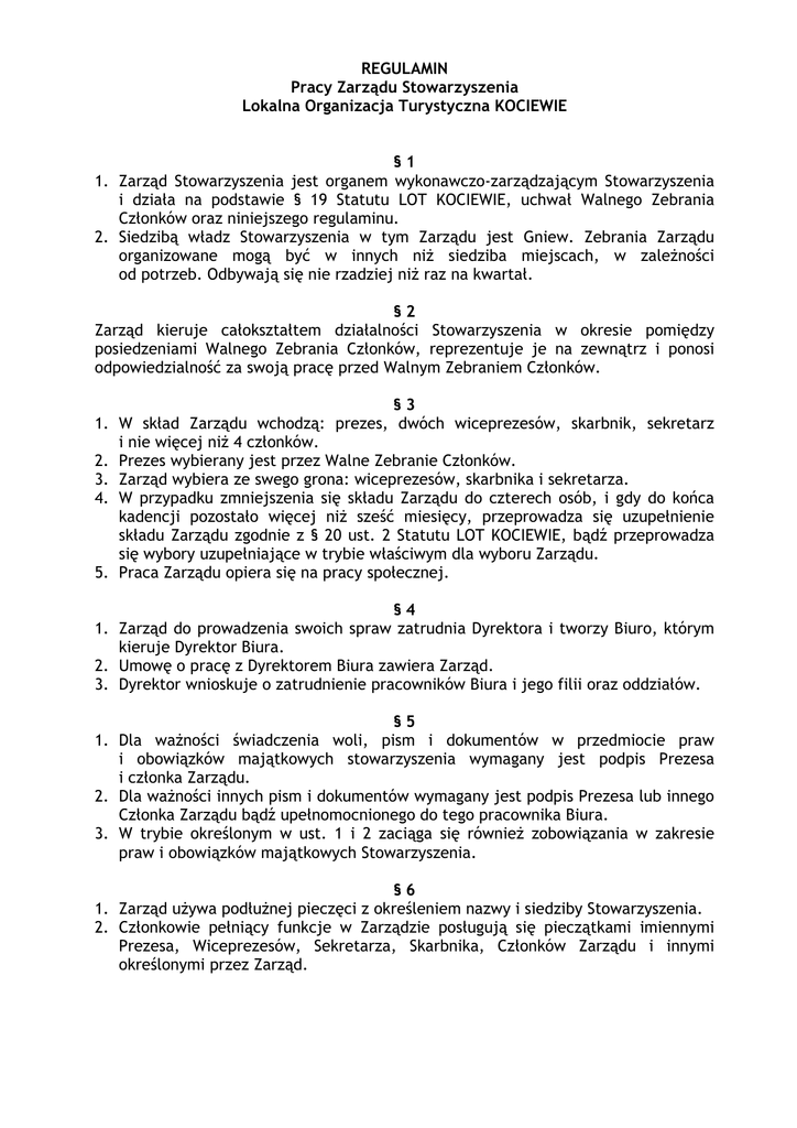 Regulamin Pracy Zarządu LOT KOCIEWIE