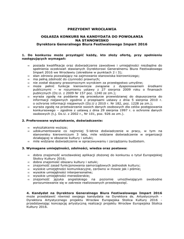 PREZYDENT WROCŁAWIA OGŁASZA KONKURS NA KANDYDATA DO POWOŁANIA NA STANOWISKO Dyrektora Generalnego Biura Festiwalowego Impart 2016 1. Do konkursu moŜe przystąpić kaŜdy, kto złoŜy ofertę, przy spełnieniu następujących wymagań: • • • • • • • posiada kwalifikacje oraz doświadczenie zawodowe i umiejętności niezbędne do spełnienia oczekiwań stawianych Dyrektorowi Generalnemu Biura Festiwalowego Impart 2016 we Wrocławiu (określone w punktach 2 i 3); stan zdrowia pozwalający na zajmowanie stanowiska kierowniczego; ma pełną zdolność do czynności prawnych; nie został skazany prawomocnym wyrokiem za przestępstwo umyślne; moŜe pełnić funkcje kierownicze związane z dysponowaniem środkami publicznymi – w rozumieniu ustawy z 27 sierpnia 2009 roku o finansach publicznych (Dz.U. z 2009 Nr 157 poz. 1240 ze zm.); wyraŜa zgodę na poddanie się procedurze przewidzianej do dopuszczenia do informacji niejawnych zgodnie z przepisami ustawy z dnia 5 sierpnia 2010 r. o ochronie informacji niejawnych (Dz.U z 2010 r. Nr 182, poz. 1228 ze zm.); wyraŜa zgodę na przetwarzanie swoich danych osobowych dla celów postępowania konkursowego – zgodnie z ustawą z dnia 29 sierpnia 1997 r. o ochronie danych osobowych (t.j. Dz.U. z 2002 r., Nr 101, poz. 926 ze zm.). 2. Preferowane wykształcenie, doświadczenie: • • • wykształcenie wyŜsze; udokumentowane co najmniej 5-letnie doświadczenie w pracy, w tym na stanowisku kierowniczym 3 lata, mile widziane doświadczenie w organizacji działającej w obszarze kultury i sztuki; mile widziane doświadczenie w opracowywaniu i zarządzaniu budŜetem. 3. Wymagane umiejętności, zdolności, wiedza oraz postawa: • • • • • • • dobra znajomość wrocławskiej aplikacji złoŜonej do konkursu o tytuł Europejskiej Stolicy Kultury 2016; dobra znajomość obszaru kultury i sztuki; znajomość zasad funkcjonowania samorządowych jednostek kultury; wysokie umiejętności komunikacyjne, zarówno w mowie jak i piśmie; wysokie umiejętności interpersonalne; wysokie umiejętności menedŜerskie; znajomość języka angielskiego na poziomie umoŜliwiającym swobodne porozumiewanie się w zakresie realizowanych przedsięwzięć. 4. Kandydat na Dyrektora Generalnego Biura Festiwalowego Impart 2016 moŜe przedstawić równieŜ swojego kandydata na Dyrektora ds. Artystycznych Dyrektora Artystycznego projektu Wrocław Europejska Stolica Kultury 2016 przedstawiając koncepcję artystyczną realizacji projektu Wrocław Europejska Stolica Kultury 2016. 5. Oferty wraz z dopiskiem Dyrektor Generalny Biura Festiwalowego Impart 2016 moŜna składać osobiście w siedzibie lub przesyłać na adres: Urząd Miejski Wrocławia Wydział Organizacyjny i Kadr, pl. Nowy Targ 1/8, 50-141 Wrocław, w terminie do 15 marca 2012 (decyduje data stempla pocztowego). 6. W przypadku niepodjęcia przez Radę Miejską Wrocławia uchwały o połączeniu instytucji Impart i Wrocław 2016, konkurs zostanie uniewaŜniony. 7. Oferta na Konkurs powinna zawierać: • List motywacyjny opisujący: - powody ubiegania się o stanowisko Dyrektora Generalnego Biura Festiwalowego Impart 2016; - dotychczasowe doświadczenie w pracy zawodowej i aktualną sytuację zawodową; - ewentualnie inne informacje wskazujące lub uzasadniające przekonanie kandydata o moŜliwości spełnienia opisanych w ogłoszeniu oczekiwań, - własne oczekiwania, jakie kandydat wiąŜe z tym stanowiskiem pracy. • szczegółowe curriculum vitae z uwzględnieniem dokładnego przebiegu kariery zawodowej. List motywacyjny oraz cv powinny być opatrzone klauzulą: WyraŜam zgodę na przetwarzanie moich danych osobowych zawartych w ofercie pracy dla potrzeb niezbędnych do realizacji procesu rekrutacji zgodnie z ustawą z dnia 29 sierpnia 1997 r. o ochronie danych osobowych (Dz.U. z 2002 r. Nr 101, poz. 926 ze zm.). Na rozmowy zostaną zakwalifikowane osoby, które przedstawią najciekawszą koncepcję oraz spełnią wymagania formalne określone w ogłoszeniu o konkursie. Informacja o wyniku konkursu będzie umieszczona na stronie internetowej Biuletynu Informacji Publicznej oraz na tablicy informacyjnej przy pl. Nowy Targ 1/8.