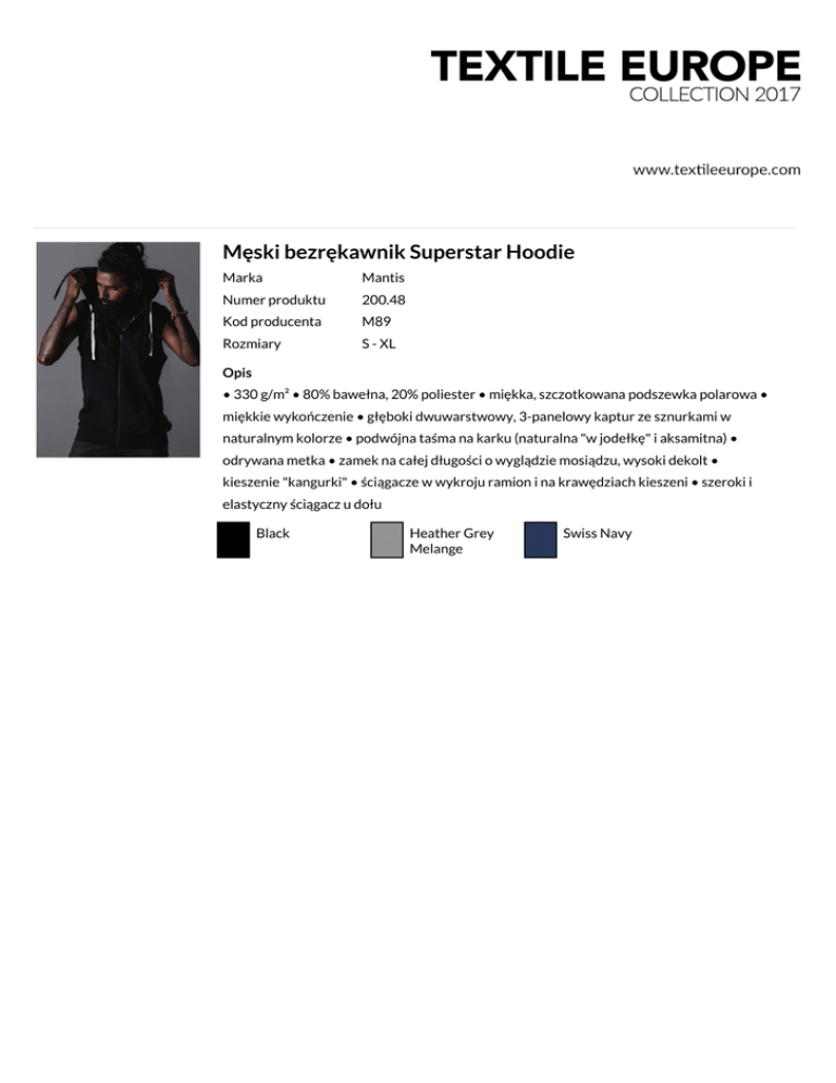 Męski bezrękawnik Superstar Hoodie Marka Mantis Numer produktu 200.48 Kod producenta M89 Rozmiary S - XL Opis • 330 g/m² • 80% bawełna, 20% poliester • miękka, szczotkowana podszewka polarowa • miękkie wykończenie • głęboki dwuwarstwowy, 3-panelowy kaptur ze sznurkami w naturalnym kolorze • podwójna taśma na karku (naturalna "w jodełkę" i aksamitna) • odrywana metka • zamek na całej długości o wyglądzie mosiądzu, wysoki dekolt • kieszenie "kangurki" • ściągacze w wykroju ramion i na krawędziach kieszeni • szeroki i elastyczny ściągacz u dołu Black Heather Grey Melange Swiss Navy
