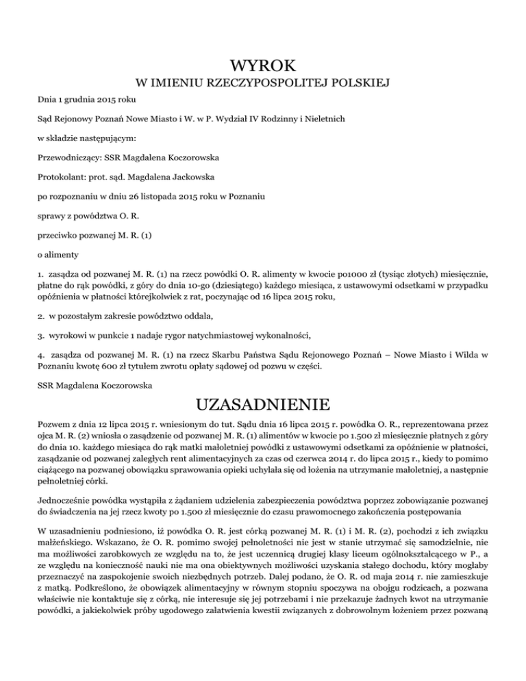 WYROK W IMIENIU RZECZYPOSPOLITEJ POLSKIEJ Dnia 1 grudnia 2015 roku Sąd Rejonowy Poznań Nowe Miasto i W. w P. Wydział IV Rodzinny i Nieletnich w składzie następującym: Przewodniczący: SSR Magdalena Koczorowska Protokolant: prot. sąd. Magdalena Jackowska po rozpoznaniu w dniu 26 listopada 2015 roku w Poznaniu sprawy z powództwa O. R. przeciwko pozwanej M. R. (1) o alimenty 1. zasądza od pozwanej M. R. (1) na rzecz powódki O. R. alimenty w kwocie po1000 zł (tysiąc złotych) miesięcznie, płatne do rąk powódki, z góry do dnia 10-go (dziesiątego) każdego miesiąca, z ustawowymi odsetkami w przypadku opóźnienia w płatności którejkolwiek z rat, poczynając od 16 lipca 2015 roku, 2. w pozostałym zakresie powództwo oddala, 3. wyrokowi w punkcie 1 nadaje rygor natychmiastowej wykonalności, 4. zasądza od pozwanej M. R. (1) na rzecz Skarbu Państwa Sądu Rejonowego Poznań – Nowe Miasto i Wilda w Poznaniu kwotę 600 zł tytułem zwrotu opłaty sądowej od pozwu w części. SSR Magdalena Koczorowska UZASADNIENIE Pozwem z dnia 12 lipca 2015 r. wniesionym do tut. Sądu dnia 16 lipca 2015 r. powódka O. R., reprezentowana przez ojca M. R. (2) wniosła o zasądzenie od pozwanej M. R. (1) alimentów w kwocie po 1.500 zł miesięcznie płatnych z góry do dnia 10. każdego miesiąca do rąk matki małoletniej powódki z ustawowymi odsetkami za opóźnienie w płatności, zasądzanie od pozwanej zaległych rent alimentacyjnych za czas od czerwca 2014 r. do lipca 2015 r., kiedy to pomimo ciążącego na pozwanej obowiązku sprawowania opieki uchylała się od łożenia na utrzymanie małoletniej, a następnie pełnoletniej córki. Jednocześnie powódka wystąpiła z żądaniem udzielenia zabezpieczenia powództwa poprzez zobowiązanie pozwanej do świadczenia na jej rzecz kwoty po 1.500 zł miesięcznie do czasu prawomocnego zakończenia postępowania W uzasadnieniu podniesiono, iż powódka O. R. jest córką pozwanej M. R. (1) i M. R. (2), pochodzi z ich związku małżeńskiego. Wskazano, że O. R. pomimo swojej pełnoletności nie jest w stanie utrzymać się samodzielnie, nie ma możliwości zarobkowych ze względu na to, że jest uczennicą drugiej klasy liceum ogólnokształcącego w P., a ze względu na konieczność nauki nie ma ona obiektywnych możliwości uzyskania stałego dochodu, który mogłaby przeznaczyć na zaspokojenie swoich niezbędnych potrzeb. Dalej podano, że O. R. od maja 2014 r. nie zamieszkuje z matką. Podkreślono, że obowiązek alimentacyjny w równym stopniu spoczywa na obojgu rodzicach, a pozwana właściwie nie kontaktuje się z córką, nie interesuje się jej potrzebami i nie przekazuje żadnych kwot na utrzymanie powódki, a jakiekolwiek próby ugodowego załatwienia kwestii związanych z dobrowolnym łożeniem przez pozwaną na rzecz O. renty alimentacyjnej, okazały się dotychczas bezskuteczne. Podniesiono, że koszt utrzymania O. R. kształtuje się na poziomie około 3.000 zł miesięcznie, a na koszty te składają się wydatki związane z zakupem odzieży, wyżywienia, środków czystości, wydatkami związanymi z rozrywką i zajęciami pozaszkolnymi. W piśmie zaznaczono, że pozwana M. R. (1) ma duże możliwości zarobkowe i majątkowe, zatem może i powinna odpowiednio partycypować w utrzymaniu powódki. Podkreślono, że fakt, iż w chwili obecnej pozwana nie przekazuje żadnych kwot na utrzymanie dziecka nie jest wynikiem jej złej sytuacji materialnej a jedynie elementarnym brakiem poczucia odpowiedzialności za czyny własne oraz los dziecka. Podniesiono, że pozwana prowadzi własną działalność gospodarczą „……" M. R. (3), jest członkiem rady nadzorczej FUNDACJI (...), a posiadany przez nią majątek i osiągane dochody pozwalają jej na życie na wysokiej stopie. Podkreślono, że pozwana posiada oszczędności w formie lokat, funduszy inwestycyjnych na kwotę ponad 200.000 zł, posiada nowe, komfortowo wyposażone trzypokojowe mieszkanie na ul. (...), samochód marki A. (...) o wartości nie niższej niż 50 000 zł. Dalej wskazano, że wysoka stopa życiowa pozwanej pozwala jej na korzystanie z pomocy domowej w formie sprzątaczki, a ponadto dzięki wysokim osiąganym dochodom pozwana w ciągu ostatnich 12 miesięcy odbyła kilka podróży zagranicznych m.in. na Korsykę, do W. czy do Indonezji i jak i wiele wycieczek krajowych. W odpowiedzi na pozew z dnia 12 października 2015 r. M. R. (1) wniosła o oddalenie powództwa w części ponad kwotę 500 zł. Jednocześnie pozwana wniosła o oddalenie wniosku o zabezpieczenie. W uzasadnieniu pozwana podkreśliła, iż nie uchyla się od obowiązku alimentacyjnego wobec córki O. R. co do zasady, jednak nie zgadza się na wnoszoną w pozwie wysokość tego świadczenia. Pozwana zakwestionowała, iż kwota 3.000 zł miesięcznie, jako konieczną do utrzymania córki O. R.. Zdaniem pozwanej kwota ta została zdecydowanie zawyżona i nie znajduje uzasadnienia w świetle doświadczenia życiowego, zasad logiki, a także bieżącej sytuacji faktycznej stron. Pozwana wskazała, że kwota 3.000 zł stanowi sumę dwukrotnie wyższą od obecnie przyjętego progu minimalnego miesięcznego wynagrodzenia netto z tytułu umowy o pracę, a doświadczenie życiowe wskazuje, że w większości przypadków wyłącznie na tyle mogą liczyć młode osoby debiutujące na rynku pracy, zatem zdaniem pozwanej nie sposób uzasadnić potrzeb uprawnionej kształtujących się na pułapie 3.000 zł miesięcznie, co nie zostało poparte żadnymi dokumentami, rachunkami. Pozwana podkreśliła, iż przed wyprowadzeniem się córki do M. R. (2), przez 11 lat sprawowałam opiekę nad O. R. na podstawie wyroku rozwodowego, dlatego też bazując na doświadczeniu w zakresie dotychczasowych kosztów jej utrzymania podała, że jej zdaniem miesięczne wydatki na O. R., zgodnie z jej wiedzą i wieloletnim doświadczeniem, kształtują się w sposób następujący: podręczniki 35 zł, przybory szkoln