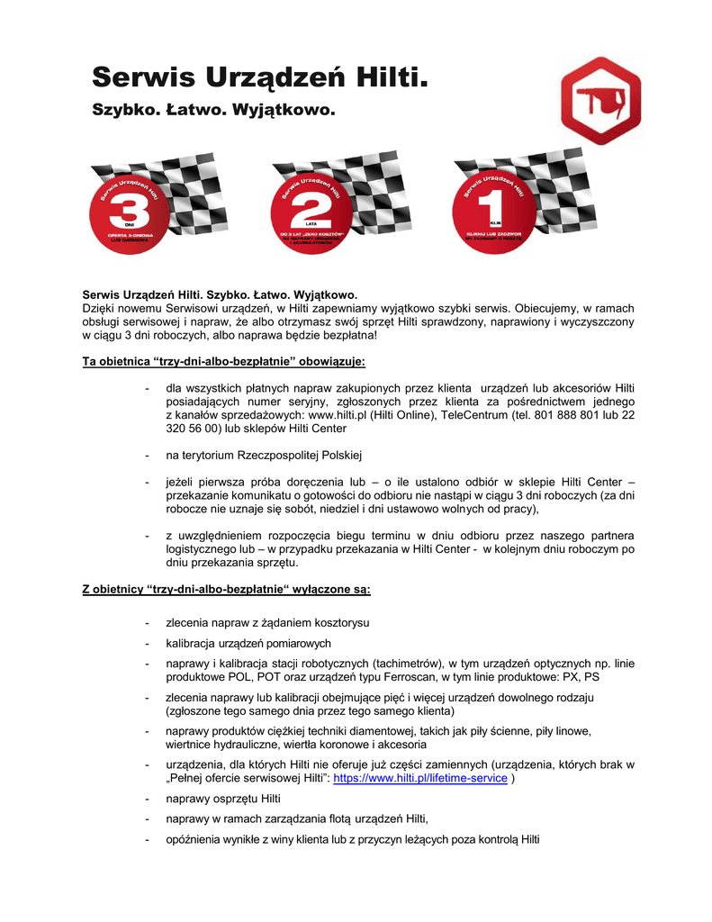 Serwis Urządzeń Hilti. Szybko. Łatwo. Wyjątkowo. Serwis Urządzeń Hilti. Szybko. Łatwo. Wyjątkowo. Dzięki nowemu Serwisowi urządzeń, w Hilti zapewniamy wyjątkowo szybki serwis. Obiecujemy, w ramach obsługi serwisowej i napraw, że albo otrzymasz swój sprzęt Hilti sprawdzony, naprawiony i wyczyszczony w ciągu 3 dni roboczych, albo naprawa będzie bezpłatna! Ta obietnica “trzy-dni-albo-bezpłatnie” obowiązuje: - dla wszystkich płatnych napraw zakupionych przez klienta urządzeń lub akcesoriów Hilti posiadających numer seryjny, zgłoszonych przez klienta za pośrednictwem jednego z kanałów sprzedażowych: www.hilti.pl (Hilti Online), TeleCentrum (tel. 801 888 801 lub 22 320 56 00) lub sklepów Hilti Center - na terytorium Rzeczpospolitej Polskiej - jeżeli pierwsza próba doręczenia lub – o ile ustalono odbiór w sklepie Hilti Center – przekazanie komunikatu o gotowości do odbioru nie nastąpi w ciągu 3 dni roboczych (za dni robocze nie uznaje się sobót, niedziel i dni ustawowo wolnych od pracy), - z uwzględnieniem rozpoczęcia biegu terminu w dniu odbioru przez naszego partnera logistycznego lub – w przypadku przekazania w Hilti Center - w kolejnym dniu roboczym po dniu przekazania sprzętu. Z obietnicy “trzy-dni-albo-bezpłatnie“ wyłączone są: - zlecenia napraw z żądaniem kosztorysu - kalibracja urządzeń pomiarowych - naprawy i kalibracja stacji robotycznych (tachimetrów), w tym urządzeń optycznych np. linie produktowe POL, POT oraz urządzeń typu Ferroscan, w tym linie produktowe: PX, PS - zlecenia naprawy lub kalibracji obejmujące pięć i więcej urządzeń dowolnego rodzaju (zgłoszone tego samego dnia przez tego samego klienta) - naprawy produktów ciężkiej techniki diamentowej, takich jak piły ścienne, piły linowe, wiertnice hydrauliczne, wiertła koronowe i akcesoria - urządzenia, dla których Hilti nie oferuje już części zamiennych (urządzenia, których brak w „Pełnej ofercie serwisowej Hilti”: https://www.hilti.pl/lifetime-service ) - naprawy osprzętu Hilti - naprawy w ramach zarządzania flotą urządzeń Hilti, - opóźnienia wynikłe z winy klienta lub z przyczyn leżących poza kontrolą Hilti - zlecenia naprawy z dostawą COD (za pobraniem) - zlecenia naprawy maszyn skradzionych - niektóre regiony kraju, w szczególnych ramach czasowych - sprzeczne z zasadami uczciwego obrotu przypadki nadużycia uprawnień Zwrot już uregulowanych kosztów naprawy odbywa się poprzez wystawienie faktury korygującej. Wyklucza się wypłaty gotówkowe. W ramach serwisu sprzętowego Hilti oraz w związku z obietnicą „trzy-dni-albobezpłatnie“, Hilti nie gwarantuje określonego czasu trwania naprawy. Usługi serwisu Hilti obejmują wszystkie urządzenia Hilti, które klient nabył lub nabędzie w Hilti oraz dla których oferowane są usługi serwisowe Hilti. W przypadku pytań, prosimy zwracać się do TeleCentrum Hilti pod numer 801 888 801 lub 22 320 56 00 bądź do swojego przedstawiciela handlowego Hilti.