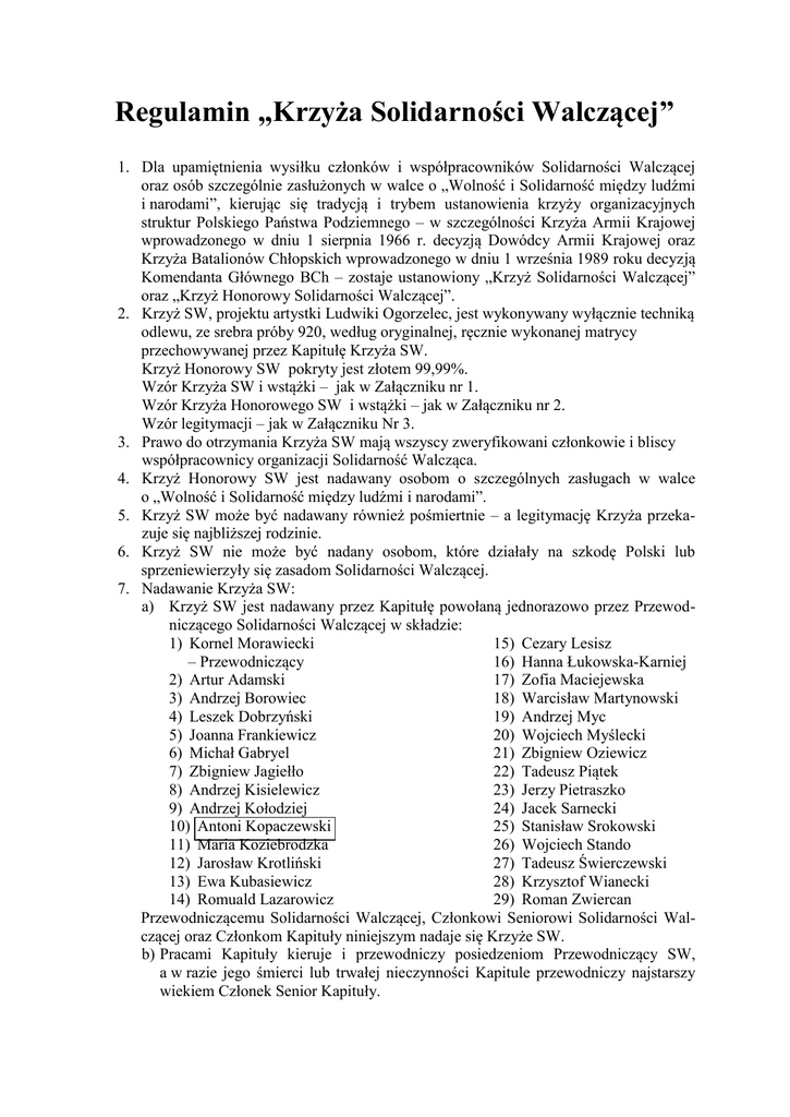 Regulamin „Krzyża Solidarności Walczącej” 1. Dla upamiętnienia wysiłku członków i współpracowników Solidarności Walczącej oraz osób szczególnie zasłużonych w walce o „Wolność i Solidarność między ludźmi i narodami”, kierując się tradycją i trybem ustanowienia krzyży organizacyjnych struktur Polskiego Państwa Podziemnego – w szczególności Krzyża Armii Krajowej wprowadzonego w dniu 1 sierpnia 1966 r. decyzją Dowódcy Armii Krajowej oraz Krzyża Batalionów Chłopskich wprowadzonego w dniu 1 września 1989 roku decyzją Komendanta Głównego BCh – zostaje ustanowiony „Krzyż Solidarności Walczącej” oraz „Krzyż Honorowy Solidarności Walczącej”. 2. Krzyż SW, projektu artystki Ludwiki Ogorzelec, jest wykonywany wyłącznie techniką odlewu, ze srebra próby 920, według oryginalnej, ręcznie wykonanej matrycy przechowywanej przez Kapitułę Krzyża SW. Krzyż Honorowy SW pokryty jest złotem 99,99%. Wzór Krzyża SW i wstążki – jak w Załączniku nr 1. Wzór Krzyża Honorowego SW i wstążki – jak w Załączniku nr 2. Wzór legitymacji – jak w Załączniku Nr 3. 3. Prawo do otrzymania Krzyża SW mają wszyscy zweryfikowani członkowie i bliscy współpracownicy organizacji Solidarność Walcząca. 4. Krzyż Honorowy SW jest nadawany osobom o szczególnych zasługach w walce o „Wolność i Solidarność między ludźmi i narodami”. 5. Krzyż SW może być nadawany również pośmiertnie – a legitymację Krzyża przekazuje się najbliższej rodzinie. 6. Krzyż SW nie może być nadany osobom, które działały na szkodę Polski lub sprzeniewierzyły się zasadom Solidarności Walczącej. 7. Nadawanie Krzyża SW: a) Krzyż SW jest nadawany przez Kapitułę powołaną jednorazowo przez Przewodniczącego Solidarności Walczącej w składzie: 1) Kornel Morawiecki 15) Cezary Lesisz – Przewodniczący 16) Hanna Łukowska-Karniej 2) Artur Adamski 17) Zofia Maciejewska 3) Andrzej Borowiec 18) Warcisław Martynowski 4) Leszek Dobrzyński 19) Andrzej Myc 5) Joanna Frankiewicz 20) Wojciech Myślecki 6) Michał Gabryel 21) Zbigniew Oziewicz 7) Zbigniew Jagiełło 22) Tadeusz Piątek 8) Andrzej Kisielewicz 23) Jerzy Pietraszko 9) Andrzej Kołodziej 24) Jacek Sarnecki 10) Antoni Kopaczewski 25) Stanisław Srokowski 11) Maria Koziebrodzka 26) Wojciech Stando 12) Jarosław Krotliński 27) Tadeusz Świerczewski 13) Ewa Kubasiewicz 28) Krzysztof Wianecki 14) Romuald Lazarowicz 29) Roman Zwiercan Przewodniczącemu Solidarności Walczącej, Członkowi Seniorowi Solidarności Walczącej oraz Członkom Kapituły niniejszym nadaje się Krzyże SW. b) Pracami Kapituły kieruje i przewodniczy posiedzeniom Przewodniczący SW, a w razie jego śmierci lub trwałej nieczynności Kapitule przewodniczy najstarszy wiekiem Członek Senior Kapituły. c) Kapituła podejmuje decyzje zwykłą większością głosów, w obecności Przewodniczącego i co najmniej jednej trzeciej liczby członków, jednak nie mniej niż w liczbie trzech członków Kapituły. Przy trwałej niezdolności Kapituły do spełnienia tych warunków zaprzestaje się nadawania Krzyża SW. d) Po zaprzestaniu nadawania Krzyża SW matrycę Krzyża oraz ewidencję członków przekazuje się do Kancelarii Prezydenta RP. To samo dotyczy przypadku, gdy na mocy postanowień państwowych Krzyż SW zostanie wpisany na listę odznaczeń Rzeczypospolitej Polskiej. 8. Ewidencję odznaczonych Krzyżem SW prowadzi Kapituła. 9. Krzyż lub jego miniaturę nosi się zgodnie z państwowymi przepisami o odznaczeniach. 10. Przyznanie Krzyża SW nie jest związane z żadnymi przywilejami państwowymi. Niniejszy Regulamin został przyjęty z datą 15 kwietnia 2010 r. Przewodniczący Solidarności Walczącej Kornel Morawiecki