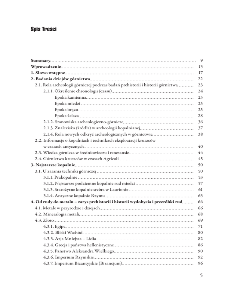 Spis Treści Summary Wprowadzenie 1. Słowo wstępne 2. Badania dziejów górnictwa 2.1. Rola archeologii górniczej podczas badań prehistorii i historii górnictwa 2.1.1. Określenie chronologii (czasu) Epoka kamienna Epoka miedzi Epoka brązu Epoka żelaza 2.1.2. Stanowiska archeologiczno-górnicze 2.1.3. Znaleziska (źródła) w archeologii kopalnianej 2.1.4. Rola nowych odkryć archeologicznych w górnictwie 2.2. Informacje o kopalniach i technikach eksploatacji kruszców w czasach antycznych 2.3. Wiedza górnicza w średniowieczu i renesansie 2.4. Górnictwo kruszców w czasach Agricoli 3. Najstarsze kopalnie 3.1. U zarania techniki górniczej 3.1.1. Prakopalnie 3.1.2. Najstarsze podziemne kopalnie rud miedzi 3.1.3. Starożytne kopalnie srebra w Laurionie 3.1.4. Antyczne kopalnie Rzymu 4. Od rudy do metalu – zarys prehistorii i historii wydobycia i przeróbki rud 4.1. Metale w przyrodzie i dziejach 4.2. Mineralogia metali 4.3. Złoto 4.3.1. Egipt 4.3.2. Bliski Wschód 4.3.3. Azja Mniejsza – Lidia 4.3.4. Grecja i państwa hellenistyczne 4.3.5. Państwo Aleksandra Wielkiego 4.3.6. Imperium Rzymskie 4.3.7. Imperium Bizantyjskie (Bizancjum) 9 13 17 22 23 24 25 25 25 28 36 37 38 40 44 45 50 50 53 57 61 63 66 66 68 69 71 80 82 86 90 92 96 5 4.3.8. Europa Zachodnia po upadku Cesarstwa Rzymskiego 4.3.9. Czasy Karola Wielkiego 4.3.10. Późne Średniowiecze (od X-XV w.) 4.3.11. Wielkie odkrycia geograficzne – Nowy Świat 4.3.12. Bilans wydobycia złota na świecie 4.4. Srebro 4.4.1. Egipt i Bliski Wschód 4.4.2. Mezopotamia (Sumer, Asyria, Babilon) 4.4.3. Azja Mniejsza i Państwo Perskie 4.4.4. Grecja i kraje Europy Wschodniej 4.4.5. Imperium Rzymskie 4.4.6. Cesarstwo Wschodnie – Bizancjum 4.4.7. Europa Zachodnia i Środkowa w czasach Karola Wielkiego 4.4.8. Wielkie odkrycia geograficzne – Nowy Świat 4.5. Miedź 4.6. Ołów 4.7. Cyna 4.8. Rtęć 5. Od metalu do wyrobu 5.1. U zarania odlewnictwa 5.2. Pierwsze centra odlewnicze 5.3. Pierwsze polskie odlewy w średniowieczu 6. Od górnictwa kruszców szlachetnych do mennictwa 6.1. Pierwsze monety „płacidła” 6.2. Monety na ziemiach polskich 6.3. Najstarsza mennica na ziemiach polskich 6.4. Produkcja złota i złotych monet 6.5. Produkcja srebra i srebrnych monet 7. Tradycje górnicze w ważniejszych ośrodkach Europy Środkowej 7.1. Zarys historii górnictwa w ważniejszych ośrodkach Europy Środkowej 7.1.1. Historyczne i socjalne uwarunkowania wydobycia kruszców w Europie Środkowej 7.1.2. Tradycje robót górniczych w Europie Środkowej 7.1.2.1. Złoto 7.1.2.2. Miedź 7.1.2.3. Ołów i srebro 7.1.2.4. Cyna 7.1.3. Zasługi Celtów w rozwoju górnictwa Europy Środkowej 7.1.4. Roboty górnicze w okresie Cesarstwa Rzymskiego i wędrówek ludów 6 98 99 100 102 105 105 107 109 110 111 117 119 120 122 125 138 145 152 156 156 163 166 167 167 178 181 184 188 191 192 192 193 194 195 196 197 197 200 7.1.5. Górnictwo za czasów Karola Wielkiego 7.1.6. Rozwój górnictwa w XIII i XIV w. 7.1.7. Wnioski 7.2. Ważniejsze ośrodki górnictwa kruszców Europy Środkowej 7.2.1. Dolny Harz 7.2.2. Górny Harz 7.2.3. Mansfeld 7.2.4. Turyngia 7.2.5. Górna Saksonia 7.2.6. Vogtland 7.2.7. Tyrol, Salzkamergut i Karyntia 7.2.8. Góry Kruszcowe 7.2.9. Czechy 7.2.10. Słowacja – okręg dolnosłowacki 7.2.11. Okręg Górnosłowacki 7.2.12. Siedmiogród (Rumunia) 7.3. Eksploatacja kruszców na ziemiach polskich 7.3.1. Okręg krakowsko-górnośląski 7.3.1.1. Srebro i ołów 7.3.2. Okręg dolnośląski 7.3.2.1. Miedź 7.3.2.2. Srebro i ołów 7.3.2.3. Cyna 7.3.2.4. Złoto 7.3.3. Okręg świętokrzyski 7.3.3.1. Miedź 7.3.3.2. Srebro i ołów 7.3.4. Okręg tatrzańsko-pieniński 7.3.4.1. Srebro, ołów i miedź 7.4. Zestawienie ważniejszych starych ośrodków wydobycia kruszców w Europie Środkowej 7.5. Epoka Fuggerów 7.6. Epoka Thurzonów 7.7. Podsumowanie 8. Zabytkowe kopalnie i sztolnie w krajach Europy Środkowej 8.1. Kopalnie wpisane na Listę Światowego Dziedzictwa Kulturowego i Naturalnego UNESCO 8.2. Kopalnie i sztolnie będące dziedzictwem kultury materialnej, pomnikami historii i techniki, zabytkami przyrody 200 202 203 204 204 205 207 209 210 214 215 217 219 224 227 229 232 233 233 237 237 238 240 241 247 247 249 252 253 254 258 269 272 275 275 277 7 8.2.1. Niemcy 8.2.2. Austria 8.2.3. Szwajcaria 8.2.4. Czechy 8.2.5. Słowacja 8.2.6. Rumunia 8.2.7. Polska 8.3. Istniejące i zagospodarowywane zabytkowe kopalnie i sztolnie w Polsce 8.3.1. Neolityczna Kopalnia Krzemienia „Krzemionki” 8.3.2. Kopalnia złota w Złotym Stoku 8.3.3. Kopalnia rud srebronośnych w Tarnowskich Górach 8.3.4. Nieczynna Kopalnia Uranu w Kletnie 8.3.5. Sztolnie Kowary w Jeleniej Strudze k. Kowar (kopalnie żelaza i uranu) 8.3.6. Sztolnia Czarnego Pstrąga w Tarnowskich Górach 8.3.7. Kopalnia „Złota Aurelia” w Złotoryi 9. Zakończenie Literatura Podziękowania 277 282 283 284 286 287 287 290 290 295 306 310 313 315 317 320 323 334