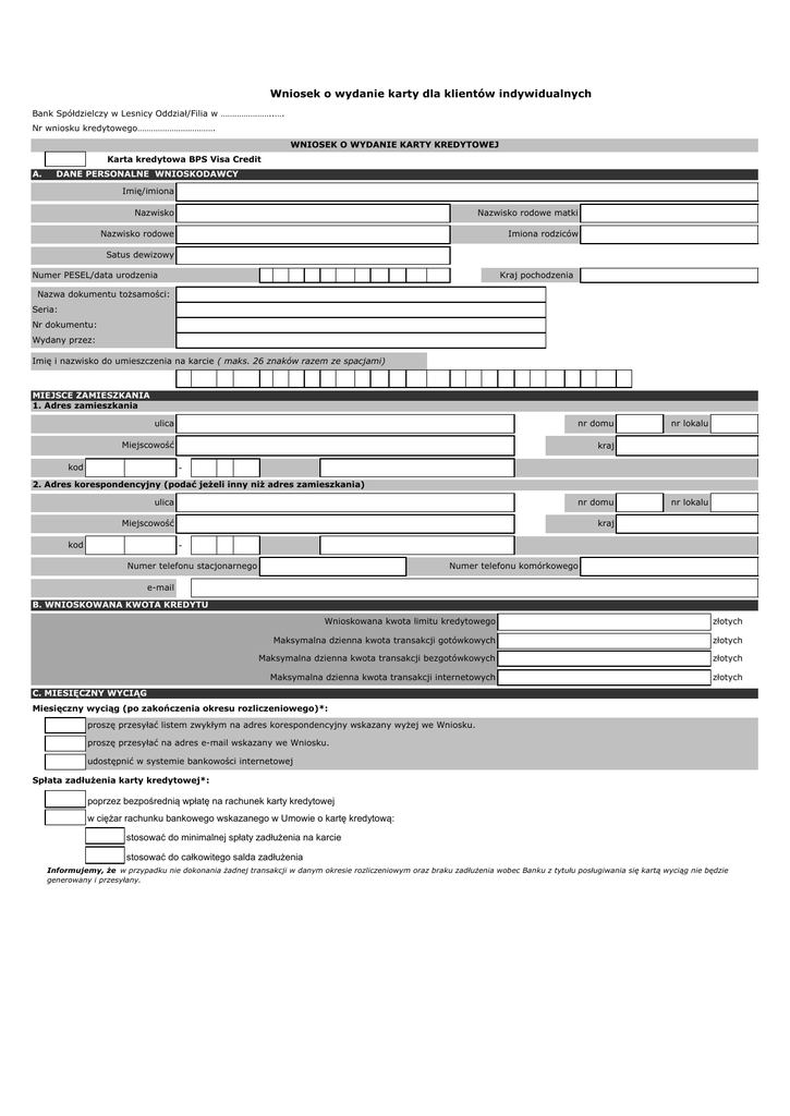 Wniosek o wydanie karty dla klientów indywidualnych Bank Spółdzielczy w Lesnicy Oddział/Filia w …………………..…. Nr wniosku kredytowego……………………………. WNIOSEK O WYDANIE KARTY KREDYTOWEJ Karta kredytowa BPS Visa Credit A. DANE PERSONALNE WNIOSKODAWCY Imię/imiona Nazwisko Nazwisko rodowe matki Nazwisko rodowe Imiona rodziców Satus dewizowy Numer PESEL/data urodzenia Kraj pochodzenia Nazwa dokumentu tożsamości: Seria: Nr dokumentu: Wydany przez: Imię i nazwisko do umieszczenia na karcie ( maks. 26 znaków razem ze spacjami) MIEJSCE ZAMIESZKANIA 1. Adres zamieszkania ulica nr domu Miejscowość kraj kod nr lokalu - 2. Adres korespondencyjny (podać jeżeli inny niż adres zamieszkania) ulica nr domu Miejscowość kraj kod nr lokalu Numer telefonu stacjonarnego Numer telefonu komórkowego e-mail B. WNIOSKOWANA KWOTA KREDYTU Wnioskowana kwota limitu kredytowego złotych Maksymalna dzienna kwota transakcji gotówkowych złotych Maksymalna dzienna kwota transakcji bezgotówkowych złotych Maksymalna dzienna kwota transakcji internetowych złotych C. MIESIĘCZNY WYCIĄG Miesięczny wyciąg (po zakończenia okresu rozliczeniowego)*: proszę przesyłać listem zwykłym na adres korespondencyjny wskazany wyżej we Wniosku. proszę przesyłać na adres e-mail wskazany we Wniosku. udostępnić w systemie bankowości internetowej Spłata zadłużenia karty kredytowej*: poprzez bezpośrednią wpłatę na rachunek karty kredytowej w ciężar rachunku bankowego wskazanego w Umowie o kartę kredytową: stosować do minimalnej spłaty zadłużenia na karcie stosować do całkowitego salda zadłużenia Informujemy, że w przypadku nie dokonania żadnej transakcji w danym okresie rozliczeniowym oraz braku zadłużenia wobec Banku z tytułu posługiwania się kartą wyciąg nie będzie generowany i przesyłany. D.INFORMACJE O WNIOSKODAWCY Wykształcenie*: wyższe magisterskie licencjat/inżynier średnie zasadnicze zawodowe podstawowe/gimnazjalne Wykonywany zawód: Stan cywilny*: żonaty/zamężna panna/kawaler separacja wdowa/wdowiec wspólnota majątkowa*: rozwiedziona/y Liczba osób w gospodarstwie (w tym dzieci) Wydatki stałe gospodarstwa domowego: PLN Status zatrudnienia*: Całkowity staż pracy: Okres zatrudnenia u obecnego pracodawcy/czas prowadzenia obecnej dział. gospodarczej (w latach) Informacje o pracodawcy (nazwa, adres) właściciel firmy wyższa kadra zarządzająca średnia kadra zarządzająca urzędnik specjalista pracownik inne Stanowisko*: Miesięczny dochód netto: w tym: Źródła dochodów* umowa o pracę:…………………………………………………….. emerytura:…………………………………………………………. renta:………………………………………………………………….. zasiłek przedemerytalny:………………………………………………. wolne zawody:……………………………………………………………….. działalność gospodarcza:…………………………………………………………………. działalność rolnicza:………………………………………………………………………………. umowa cywilno-prawna:………………………………………………………………………………….. umowa najmu:………………………………………………………………………………………………………………… umowa o pracę na czas określony do………………………………………………………………………………… odsetki z aktywów finansowych:…………………………………………………………………………. dywidendy:……………………………………………………………………. inne:………………………………………………………………………………………………………….. Informacje o zobowiązaniach: Zobowiązania kwota zobowiązania kwota pozostała do spłaty rata miesięczna Bank limit w ROR limit w ROR limit karty kredytowej limit karty kredytowej kredyt…………………… kredyt…………………… kredyt…………………… Poręczenie/przystąpienie do długu Poręczenie/przystąpienie do długu Inne (np. alimenty, obciążenia komornicze) Inne (np. alimenty, obciążenia komornicze) ……………………………………… …………………………………….. Informacje o posiadanym majątku: Status mieszkaniowy*: Status własności samochodu*: właściciel/współwłaściciel domu/mieszkania posiadacz wpółdzielczego prawa do lokalu posiadacz spółdzielczego własnościowego prawa do lokalu/domu jednorodzinnego najemnca: mieszkania komunalnego mieszkania zakładowego od osoby prywatnej (dom, mieszkanie) od osoby prywatnej (pokój) zamieszkiwanie z rodzicami zamieszkiwanie z dziećmi inne……………………………………………………………………………………………………………………………….. własny leasing na kredyt rodziców nie posiadam inny…………………………………………………………………………………………………………………. Oszczędności (kwota, waluta, okres lokaty)…………………………………………………………………………………………………………………………. Papiery wartościowe (ilość, wartość)……………………………………………………………………………………………………………………………………… Inne……………………………………………………………………………………………………………………………………………………………………………………….. tak nie OŚWIADCZENIA 1. Przyjmuję do wiadomości informację Banku Spółdzielczego w Leśnicy, że: 1) Bank Spółdzielczy w Leśnicy z siedzibą w Strzelcach Op. 47-100 St