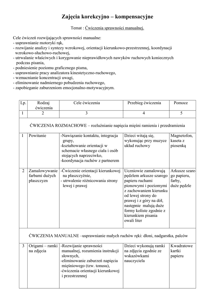 Zajęcia korekcyjno – kompensacyjne Temat : Ćwiczenia sprawności manualnej. Cele ćwiczeń rozwijających sprawności manualne: - usprawnianie motoryki rąk, - rozwijanie analizy i syntezy wzrokowej, orientacji kierunkowo-przestrzennej, koordynacji wzrokowo-słuchowo-ruchowej, - utrwalanie właściwych i korygowanie nieprawidłowych nawyków ruchowych koniecznych podczas pisania, - podniesienie poziomu graficznego pisma, - usprawnianie pracy analizatora kinestetyczno-ruchowego, - wzmacnianie koncentracji uwagi, - eliminowanie nadmiernego pobudzenia ruchowego, - zapobieganie zaburzeniom emocjonalno-motywacyjnym. Lp. 1 Rodzaj ćwiczenia 2 Cele ćwiczenia Przebieg ćwiczenia Pomoce 3 4 5 ĆWICZENIA ROZMACHOWE – rozluźnianie napięcia mięśni ramienia i przedramienia -Nawiązanie kontaktu, integracja grupy, -kształtowanie orientacji w schemacie własnego ciała i osób stojących naprzeciwko, -koordynacja ruchów z partnerem 1 Powitanie 2 Zamalowywanie -Ćwiczenie orientacji kierunkowej farbami dużych na płaszczyźnie, płaszczyzn - utrwalenie różnicowania strony lewej i prawej Dzieci witają się, Magnetofon, wykonując przy muzyce kaseta z układ ruchowy piosenką Uczniowie zamalowują pędzlem arkusze szarego papieru ruchami pionowymi i poziomymi z zachowaniem kierunku od lewej strony do prawej i z góry na dół, następnie malują duże formy koliste zgodnie z kierunkiem pisania owali liter Arkusze szarego papieru, farby, duże pędzle ĆWICZENIA MANUALNE –usprawnianie małych ruchów ręki: dłoni, nadgarstka, palców 3 Origami – ramki -Rozwijanie sprawności na zdjęcia manualnej, rozumienia instrukcji słownych, -eliminowanie zaburzeń napięcia mięśniowego (tzw. tonusu), -ćwiczenia orientacji kierunkowej i przestrzennej Dzieci wykonują ramki na zdjęcia zgodnie ze wskazówkami nauczyciela Kwadratowe kartki papieru 1 4 2 Modelowanie różnych form 3 - Doskonalenie umiejętności włączania odpowiednich napięć poszczególnych grup mięśni podczas wykonywania małych ruchów ręką 4 Uczniowie modelują z plasteliny najpierw proste formy (kulki, wałeczki), a następnie bardziej złożone wymagające łączenia różnych elementów (np. litery) 5 Plastelina lub modelina, podkładki do ćwiczeń ĆWICZENIA GRAFICZNE – usprawnianie drobnych ruchów ręki ułożonej w pozycji jak przy pisaniu 5 Kreskowanie -Rozwijanie umiejętności Dzieci uzupełniają Odpowiednio wykonywania szeregu drobnych, kontury obrazków dobrane nieznacznie zróżnicowanych liniami poziomymi, obrazki ruchów przy stałej zmianie ich pionowymi, ukośnymi – kierunków i jednoczesnym z zachowaniem kierunku zachowaniu kierunku pisania od lewej strony do prawej, z góry na dół 6 Obrysowywanie -Ćwiczenia płynnych, Dzieci rysują krasnale za Szablony szablonów, rytmicznych, ciągłych i pomocą szablonów, krasnali, kopiowanie postępujących ruchów pisarskich pogrubiają kontury kalka wzoru flamastrami linią ciągłą, techniczna a następnie kopiują wzory przez kalkę techniczną 7 Wodzenie po -Usprawnianie pracy ręki Zgodnie z kierunkami Wzory z wzorze dominującej, strzałek uczniowie książki M. -doskonalenie melodii wodzą palcami po Bogdanowicz kinestetycznej, śladach na otrzymanych pt. „Ćwicze-kształtowanie kierunkowości wzorach, nia grafomorysują po nich mazakami toryczne wg i przerysowują do H. Tymichozeszytów vej” Rysowanie wzorów po śladzie kropkowym, kreskowym, rysowanie szlaczków literopodobnych w liniaturze -Rozwijanie zdolności do Uczniowie zaznaczają przestrzennego organizowania czerwoną kredką materiału spostrzeżeniowego, narysowane pod -ćwiczenia kształtnego pisania liter spółgłoskami ich elementy, odnajdują te elementy w literach i zaznaczają wyraźnie czerwoną kredką, następnie tworzą z elementów właściwe litery 8 Odwzorowywa- -Doskonalenie melodii nie szlaczków kinestetyczno-ruchowej, według demon- -ćwiczenie w rozpoznawaniu strowanych liniatury wzorów Wzory szlaczków 9 Ćwiczenia w pisaniu liter Kartki z ćwiczeniami