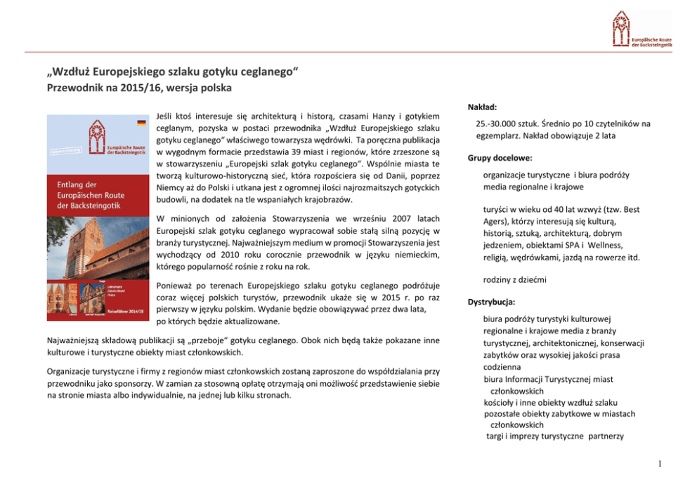 „Wzdłuż Europejskiego szlaku gotyku ceglanego“ Przewodnik na 2015/16, wersja polska Nakład: Jeśli ktoś interesuje się architekturą i historą, czasami Hanzy i gotykiem ceglanym, pozyska w postaci przewodnika „Wzdłuż Europejskiego szlaku gotyku ceglanego“ właściwego towarzysza wędrówki. Ta poręczna publikacja w wygodnym formacie przedstawia 39 miast i regionów, które zrzeszone są w stowarzyszeniu „Europejski szlak gotyku ceglanego“. Wspólnie miasta te tworzą kulturowo-historyczną sieć, która rozpościera się od Danii, poprzez Niemcy aż do Polski i utkana jest z ogromnej ilości najrozmaitszych gotyckich budowli, na dodatek na tle wspaniałych krajobrazów. W minionych od założenia Stowarzyszenia we wrześniu 2007 latach Europejski szlak gotyku ceglanego wypracował sobie stałą silną pozycję w branży turystycznej. Najważniejszym medium w promocji Stowarzyszenia jest wychodzący od 2010 roku corocznie przewodnik w języku niemieckim, którego popularność rośnie z roku na rok. Ponieważ po terenach Europejskiego szlaku gotyku ceglanego podróżuje coraz więcej polskich turystów, przewodnik ukaże się w 2015 r. po raz pierwszy w języku polskim. Wydanie będzie obowiązywać przez dwa lata, po których będzie aktualizowane. Najważniejszą składową publikacji są „przeboje“ gotyku ceglanego. Obok nich będą także pokazane inne kulturowe i turystyczne obiekty miast członkowskich. Organizacje turystyczne i firmy z regionów miast członkowskich zostaną zaproszone do współdzialania przy przewodniku jako sponsorzy. W zamian za stosowną opłatę otrzymają oni możliwość przedstawienie siebie na stronie miasta albo indywidualnie, na jednej lub kilku stronach. 25.-30.000 sztuk. Średnio po 10 czytelników na egzemplarz. Nakład obowiązuje 2 lata Grupy docelowe: organizacje turystyczne i biura podróży media regionalne i krajowe turyści w wieku od 40 lat wzwyż (tzw. Best Agers), którzy interesują się kulturą, historią, sztuką, architekturą, dobrym jedzeniem, obiektami SPA i Wellness, religią, wędrówkami, jazdą na rowerze itd. rodziny z dziećmi Dystrybucja: biura podróży turystyki kulturowej regionalne i krajowe media z branży turystycznej, architektonicznej, konserwacji zabytków oraz wysokiej jakości prasa codzienna biura Informacji Turystycznej miast członkowskich kościoły i inne obiekty wzdłuż szlaku pozostałe obiekty zabytkowe w miastach członkowskich targi i imprezy turystyczne partnerzy 1 14 grudnia 2014 Format: wg normy DIN podłużny, 105 x 210 mm, czterokolorowy Łączna objętość: 70-80 stron Treść: Wprowadzenie do Europejskiego szlak gotyku ceglanego wraz z mapą Przedstawienie wszystkich miast członkowskich wzdłuż Europejskiego szlaku gotyku ceglanego (informacje o budowlach i pozostałej ofercie turystycznej) Wszystko, co fascynujące wokół gotyku ceglanego (rozwój, informacje o materiałach budowlanych, ważnych budowniczych, informacje historyczne, co warto wiedzieć o Hanzie itd.) glosariusz architektoniczny z wyjaśnieniem najważniejszych dla gotyku ceglanego pojęć dalsze godne polecenia imprezy (wyprawy rowerowe, festiwale i koncerty, jarmarki i festyny) Egzemplarze dla partnerów: Każdy partner otrzyma co najmniej 50 publikacji do swojej dyspozycji (w razie potrzeby także wiecej) Przesyłanie danych: drogą mailową na adres: [email protected] Prezentacje w strefie partnerów teksty jako plik wordowski logo/zdjęcia w formacie jpg. albo eps. w wielkości nadającej się do druku Indywidualne prezentacje jako pliki jpg. albo pdf. w wielkości nadającej się do druku Koniec redakcji: Wydawca: Stowarzyszenie Europejski szlak gotyku ceglanego (Europäische Route der Backsteingotik e.V.) Littenstrasse 10 D-10179 Berlin www.eurob.org Kontakt: Steffi Zurmühlen Marketing i PR E-Mail: [email protected] 2 Tel. +49 (0)30 2061325-60 Fax +49 (0)30 2061325-1 Prezentacja w strefie partnerskiej na stronach miast członkowskich Ogłoszenia znajdują się po prawej stronie na stronie miasta członkowskiego i pokazane są w wydzielonych nas w szacie graficznej okienkach. przez 1/5 szpalty (szerokość 45 mm x wysokość 38,1 mm) nazwa partnera, adres, telefon i adres www logo w małym formacie LUB krótki opis na 50-100 znaków 100 EUR 1/3 szpalty (szerokość 45 mm x wysokość 55 mm) nazwa partnera, adres, telefon i adres www logo w małym formacie LUB zdjęcie krótki opis na 50-100 znaków 3 150 EUR 1/2 szpalty (szerokość 45 mm x wysokość 88,5 mm) nazwa partnera, adres, telefon i adres www logo w małym formacie LUB zdjęcie (po uzgodnieniu także obie możliwości) krótki opis na ok. 300 znaków 250 EUR 1/1 szpalta (szerokość 45 mm x wysokość 180 mm) nazwa partnera, adres, telefon i adres www logo w małym formacie i zdjęcie krótki opis na ok. 600 znaków 500 EUR Indywidualne prezentacje sponsorów Mogą Państwo także zaprezentowac swoją firmę w pełni indywidualnie, we własnym layout. 4 1/2-strony, 4 kolory (105 x 105 mm + 3 mm wcięcie) 500 EUR 1/1 strona, 4 kolory (105 x 210 mm + 3 mm wcięcie) 1 000 EUR Podwójna strona, 4 kolory (210 x 210 mm + 3 mm wcięcie) 1 500 EUR Na końcowej okładce, 4 kolory (105 x 210 mm + 3 mm wcięcie) 2 000 EUR 5