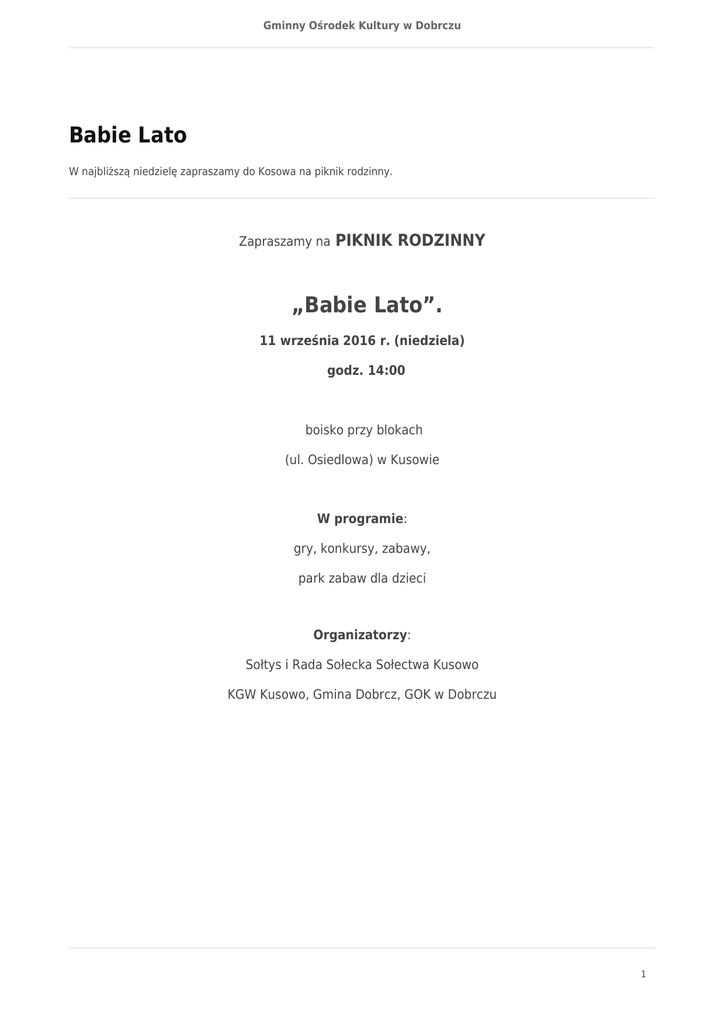 Gminny Ośrodek Kultury w Dobrczu Babie Lato W najbliższą niedzielę zapraszamy do Kosowa na piknik rodzinny. Zapraszamy na PIKNIK RODZINNY „Babie Lato”. 11 września 2016 r. (niedziela) godz. 14:00 boisko przy blokach (ul. Osiedlowa) w Kusowie W programie: gry, konkursy, zabawy, park zabaw dla dzieci Organizatorzy: Sołtys i Rada Sołecka Sołectwa Kusowo KGW Kusowo, Gmina Dobrcz, GOK w Dobrczu 1 Gminny Ośrodek Kultury w Dobrczu 2