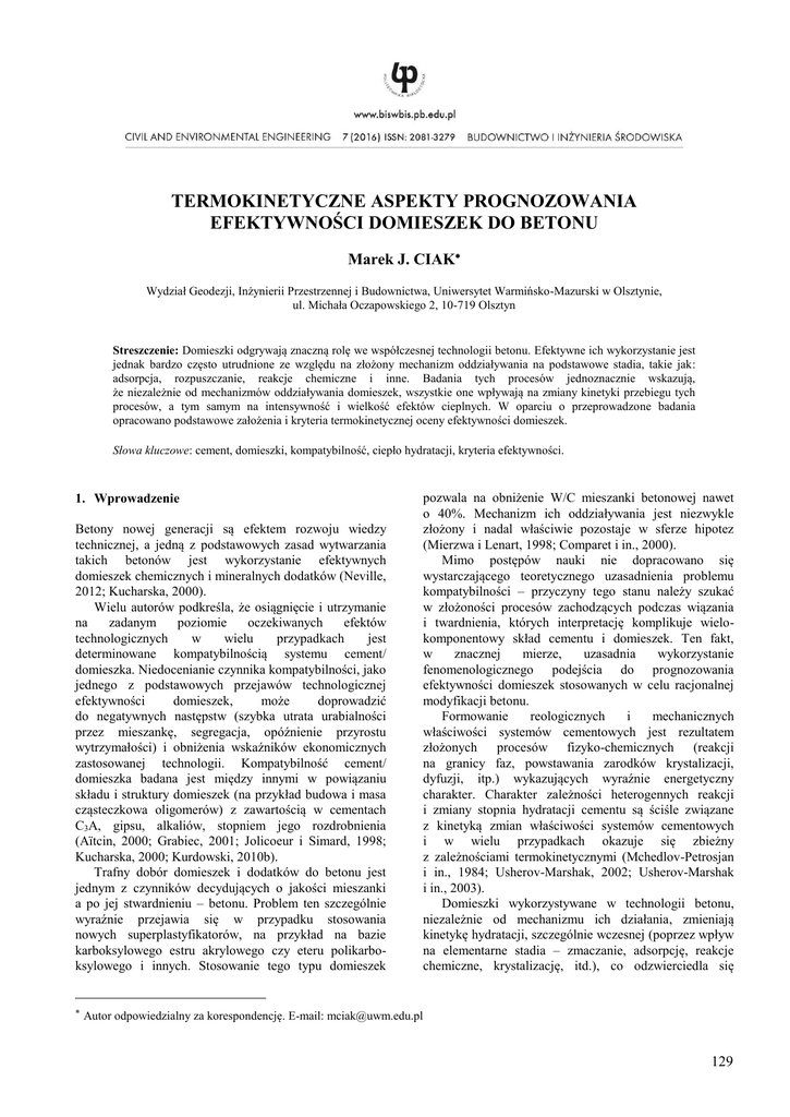 TERMOKINETYCZNE ASPEKTY PROGNOZOWANIA EFEKTYWNOŚCI DOMIESZEK DO BETONU Marek J. CIAK Wydział Geodezji, Inżynierii Przestrzennej i Budownictwa, Uniwersytet Warmińsko-Mazurski w Olsztynie, ul. Michała Oczapowskiego 2, 10-719 Olsztyn Streszczenie: Domieszki odgrywają znaczną rolę we współczesnej technologii betonu. Efektywne ich wykorzystanie jest jednak bardzo często utrudnione ze względu na złożony mechanizm oddziaływania na podstawowe stadia, takie jak: adsorpcja, rozpuszczanie, reakcje chemiczne i inne. Badania tych procesów jednoznacznie wskazują, że niezależnie od mechanizmów oddziaływania domieszek, wszystkie one wpływają na zmiany kinetyki przebiegu tych procesów, a tym samym na intensywność i wielkość efektów cieplnych. W oparciu o przeprowadzone badania opracowano podstawowe założenia i kryteria termokinetycznej oceny efektywności domieszek. Słowa kluczowe: cement, domieszki, kompatybilność, ciepło hydratacji, kryteria efektywności. 1. Wprowadzenie Betony nowej generacji są efektem rozwoju wiedzy technicznej, a jedną z podstawowych zasad wytwarzania takich betonów jest wykorzystanie efektywnych domieszek chemicznych i mineralnych dodatków (Neville, 2012; Kucharska, 2000). Wielu autorów podkreśla, że osiągnięcie i utrzymanie na zadanym poziomie oczekiwanych efektów technologicznych w wielu przypadkach jest determinowane kompatybilnością systemu cement/ domieszka. Niedocenianie czynnika kompatybilności, jako jednego z podstawowych przejawów technologicznej efektywności domieszek, może doprowadzić do negatywnych następstw (szybka utrata urabialności przez mieszankę, segregacja, opóźnienie przyrostu wytrzymałości) i obniżenia wskaźników ekonomicznych zastosowanej technologii. Kompatybilność cement/ domieszka badana jest między innymi w powiązaniu składu i struktury domieszek (na przykład budowa i masa cząsteczkowa oligomerów) z zawartością w cementach C3A, gipsu, alkaliów, stopniem jego rozdrobnienia (Аïtcin, 2000; Grabiec, 2001; Jolicoeur i Simard, 1998; Kucharska, 2000; Kurdowski, 2010b). Trafny dobór domieszek i dodatków do betonu jest jednym z czynników decydujących o jakości mieszanki a po jej stwardnieniu – betonu. Problem ten szczególnie wyraźnie przejawia się w przypadku stosowania nowych superplastyfikatorów, na przykład na bazie karboksylowego estru akrylowego czy eteru polikarboksylowego i innych. Stosowanie tego typu domieszek pozwala na obniżenie W/C mieszanki betonowej nawet o 40%. Mechanizm ich oddziaływania jest niezwykle złożony i nadal właściwie pozostaje w sferze hipotez (Mierzwa i Lenart, 1998; Comparet i in., 2000). Mimo postępów nauki nie dopracowano się wystarczającego teoretycznego uzasadnienia problemu kompatybilności – przyczyny tego stanu należy szukać w złożoności procesów zachodzących podczas wiązania i twardnienia, których interpretację komplikuje wielokomponentowy skład cementu i domieszek. Ten fakt, w znacznej mierze, uzasadnia wykorzystanie fenomenologicznego podejścia do prognozowania efektywności domieszek stosowanych w celu racjonalnej modyfikacji betonu. Formowanie reologicznych i mechanicznych właściwości systemów cementowych jest rezultatem złożonych procesów fizyko-chemicznych (reakcji na granicy faz, powstawania zarodków krystalizacji, dyfuzji, itp.) wykazujących wyraźnie energetyczny charakter. Charakter zależności heterogennych reakcji i zmiany stopnia hydratacji cementu są ściśle związane z kinetyką zmian właściwości systemów cementowych i w wielu przypadkach okazuje się zbieżny z zależnościami termokinetycznymi (Mchedlov-Petrosjan i in., 1984; Usherov-Marshak, 2002; Usherov-Marshak i in., 2003). Domieszki wykorzystywane w technologii betonu, niezależnie od mechanizmu ich działania, zmieniają kinetykę hydratacji, szczególnie wczesnej (poprzez wpływ na elementarne stadia – zmaczanie, adsorpcję, reakcje chemiczne, krystalizację, itd.), co odzwierciedla się Autor odpowiedzialny za korespondencję. E-mail: [email protected] 129 Civil and Environmental Engineering / Budownictwo i Inżynieria Środowiska 7 (2016) 129-134 w intensywności i czasie trwania mierzonych efektów cieplnych. Pozwala to na przyjęcie tezy, że kinetyczne, w tym i termokinetyczne, charakterystyki wczesnych stadiów hydratacji rozpatrywane z fizyko-chemicznego i fenomenologicznego punktu widzenia mogą stanowić podstawę oceny ich efektywności. Tym bardziej, że pomiary ciepła hydratacji wykorzystywane były w badaniach nad mechanizmami modyfikacji, wyjaśnieniem związków pomiędzy procesami hydratacji a zmianami właściwości modyfikowanych systemów cementowych, a także badaniach kompatybilności cementów i domieszek (Nocuń-Wczelik i Maziarz, 2012; Uszerow-Marszak, 2000; Jolicoeur i Simard, 1998). Ten ostatni kierunek rozwija się dostatecznie szybko w związku z rozwojem technologii betonów typu HPS, SCC, RPC. Został nawet opracowany dokument normalizacyjny ASTM C 1679 Practice for Measuring Hydration Kinetics of Hydraulic Cementitious Mixtures Using Isothermal Calorimetry. Jednak możliwości analizy termokinetycznej nie są w tym przypadku w pełni. Częściowo z powodu braku termo-kinetycznych kryteriów kompatybilności domieszek i cementów. IV. spowolnienia wygasania. 2. Metodyka i wyniki badań Rys. 1. Charakterystyczne okresy wczesnych stadiów hydratacji cementów Podstawową bazą prowadzonych badań była analiza termokientyczna, oparta na prawach termodynamiki (Gibbsa, Kirchhoffa, Arrheniusa) i kalorymetrii, stanowiących zbiór metod i środków pomiaru ilości ciepła i efektów cieplnych towarzyszących procesom, na przykład podczas formowania struktury w systemach zdyspergowanych. Podstawowym założeniem przyjętej metodyki, było wyznaczenie granicznych stadiów w zależnościach szybkości dQ/dτ = f(τ) i ilości wydzielonego ciepła Q = f(τ) dla formalnego i konceptualnego opisania i model
