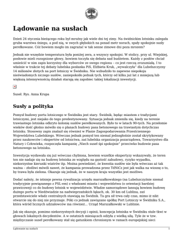Lądowanie na susłach Dzień 24 stycznia bieżącego roku był mroźny jak wiele dni tej zimy. Na świdnickim lotnisku zalegała gruba warstwa śniegu, a pod nią, w swych głębokich na ponad metr norach, spały spokojnie susły perełkowane. Cóż bowiem mogło im zagrażać w tak senne zimowe dni poza mrozem? Jednak nie wszędzie temperatura była poniżej zera, a wszyscy spokojni. W stolicy, przy ul. Wiejskiej, posłowie mieli rozognione głowy, bowiem toczyła się debata nad budżetem. Każdy z posłów chciał umieścić w nim zapis korzystny dla wyborców ze swego regionu – co jest rzeczą zrozumiałą. I to właśnie w trakcie tej debaty lubelska posłanka PiS, Elżbieta Kruk, „wywalczyła” dla Lubelszczyzny 14 milionów złotych na port lotniczy w Świdniku. Nie wzbudziło to zapewne niepokoju nieświadomych niczego susłów, zaniepokoiło jednak tych, którzy od kilku już lat z mniejszą lub większą intensywnością działań starają się zapobiec takiej lokalizacji inwestycji. Suseł. Rys. Anna Krupa Susły a polityka Pomysł budowy portu lotniczego w Świdniku jest stary. Świdnik, będąc miastem z tradycjami lotniczymi, jest niejako do tego predestynowany. Sytuacja jednak zmieniła się, kiedy na terenie trawiastego lotniska odkryto kolonię susłów perełkowanych. Było to w latach 90-tych. Na przełomie wieków dość głośno mówiło się o planach budowy pasa betonowego na trawiastym dotychczas lotnisku. Stosowny zapis znalazł się również w Planie Zagospodarowania Przestrzennego Województwa Lubelskiego. Wówczas jednak pomysł ten niemal jednogłośnie został skrytykowany przez naukowców i ekspertów od lotnictwa, zaś lubelska organizacja pozarządowa, Towarzystwo dla Natury i Człowieka, rozpoczęła kampanię „Niech suseł śpi spokojnie” przeciwko budowie pasa betonowego na lotnisku. Inwestycja wydawała się już wówczas chybiona, bowiem wszelkie ekspertyzy wskazywały, że teren ten nie nadaje się na budowę lotniska ze względu na gęstość zabudowy, ryzyko wypadku, niekorzystne kierunki wiatrów itp. Można powiedzieć, że kwestia susłów nie była wówczas aż tak ważna – złośliwi mówili nawet, że kampania prowadzona przez TdNiCz jest jak walka na wiosnę o to, by trawa była zielona. Okazuje się jednak, że w naszym kraju wszystko jest możliwe. Dodać należy, że istnieje pewna rywalizacja urzędu marszałkowskiego (na Lubelszczyźnie niemal tradycyjnie powiązanego z PSL-em) z władzami miasta i województwa (o orientacji bardziej prawicowej) co do budowy lotnisk w województwie. Władze samorządowe lansują bowiem budowę dużego portu w Niedźwiadzie na nadwieprzańskich łąkach, ok. 30 km od Lublina, zaś przedstawiciele władz centralnych stawiają na Świdnik. Ta gra sił trwa cały czas, mimo iż nikt otwarcie się do niej nie przyznaje. Póki co jednak zawiązano spółkę Port Lotniczy w Świdniku S.A., która wśród licznych udziałowców ma również... Urząd Marszałkowski w Lublinie. Jak się okazuje, pomimo niekorzystnych decyzji i opinii, koncepcja lotniska w Świdniku stale tkwi w głowach lokalnych decydentów. A w ostatnich miesiącach odżyła z wielką siłą. Tyle że w tzw. międzyczasie suseł perełkowany stał się gatunkiem chronionym w ramach europejskiej sieci Lądowanie na susłach 1 ekologicznej NATURA 2000. Co więcej, z uwagi na niewielką jego liczebność w krajach UE (jedyne stanowiska znajdują się w woj. lubelskim), nadano mu rangę gatunku priorytetowego. Zaś świdnicka kolonia jako największa w UE została zgłoszona do ochrony w formie obszaru NATURA 2000. Dyrektywa habitatowa zaś mówi jasno, że w obszarze NATURA 2000 i w jego sąsiedztwie nie można lokalizować inwestycji, które mogłyby pogorszyć stan gatunków czy siedlisk chronionych w ramach danego obszaru. Dodatkowo sytuację komplikuje fakt, że dla lokalizacji inwestycji na terenie występowania gatunku priorytetowego konieczna jest zgoda Unii Europejskiej. Powstała zatem dość trudna sytuacja, którą początkowo nikt się nie przejmował, jednak z czasem należało znaleźć dla niej rozwiązanie. I wkrótce znaleziono. Zaplanowano, że część susłów się przesiedli, czyli introdukuje w inne miejsce. Operacja udana – pacjent zszedł Historia przesiedleń susłów na Lubelszczyźnie ma już niemal 20 lat, to bowiem w latach 80. dr Stefan Męczyński z UMCS wraz z zespołem prowadził tego rodzaju działalność na susłach z terenów Zamojszczyzny. Teraz również pod jego kierunkiem został opracowany plan przesiedlenia części susłów z lotniska w Świdniku (ok. 1500 sztuk) z terenu, gdzie ma powstać betonowy pas startowy. Ów plan przesiedlenia został przyjęty przez Wojewódzką Komisję Ochrony Przyrody. Argumentuje się, że dzięki niemu możliwe będzie zachowanie populacji susła w Świdniku, przesiedlone osobniki wsiedli się na nowe tereny położone w sąsiedztwie lotniska, a także na lotnisko w Radawcu na zachód od Lublina, zaś obecny teren będzie ogrodzony i regularnie koszony. Trudno odmawiać doktorowi Męczyńskiemu zasług w badaniach susłów. Istnieje wszelako jeden „mały” szkopuł – żadna z prowadzonych przez niego introdukcji się nie powiodła. W najlepszym wypadku kolonia przetrwała 3 lata. Faktem jest, że ten sam naukowiec kieruje programem ochrony susła na Zamojszczyźnie, ale trzeba z całą mocą podkreślić, iż tam chroni się stanowiska naturalne, które susły same sobie wybrały, zaś jak pokazuje praktyka, naukowcy nie mają wystarczającej wiedzy, by przesiedlić ów gatunek z powodzeniem. Obawy budzą też wybrane lokalizacje przesiedlania, bowiem poza terenami przyległymi do lotniska w Świdniku mówi się o Radawcu (teren położony jeszcze bardziej na zachód od i tak położonego poza zasięgiem występowania gatunku, Świdnika). Innym terenem miał być rezerwat Żmudź w okolicach Chełma, co już brzmi jak kiepski żart, gdyż podłoże w 