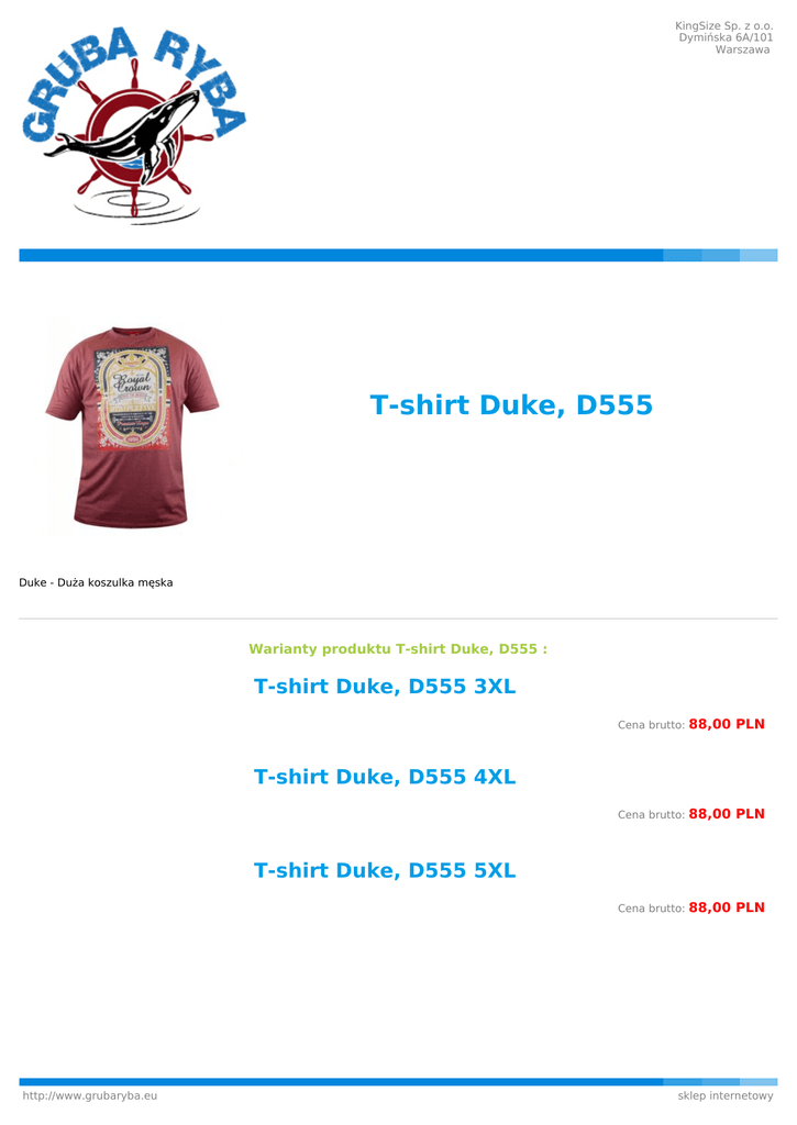 KingSize Sp. z o.o. Dymińska 6A/101 Warszawa T-shirt Duke, D555 Duke - Duża koszulka męska Warianty produktu T-shirt Duke, D555 : T-shirt Duke, D555 3XL Cena brutto: 88,00 PLN Cena brutto: 88,00 PLN Cena brutto: 88,00 PLN T-shirt Duke, D555 4XL T-shirt Duke, D555 5XL http://www.grubaryba.eu sklep internetowy