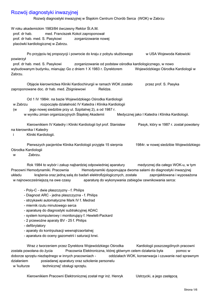 Rozwój diagnostyki inwazyjnej Rozwój diagnostyki inwazyjnej w Śląskim Centrum Chorób Serca (WOK) w Zabrzu W roku akademickim 1983/84 ówczesny Rektor Śl.A.M. prof. dr hab. med. Franciszek Kokot zaproponował prof. dr hab. med. S. Pasykowi zorganizowanie nowej placówki kardiologicznej w Zabrzu. Po przyjęciu tej propozycji i powrocie do kraju z pobytu służbowego w USA Wojewoda Katowicki powierzył prof. dr hab. med. S. Pasykowi zorganizowanie od podstaw ośrodka kardiologicznego, w nowo wybudowanym budynku, mianując Go z dniem 1 X 1983 r. Dyrektorem Wojewódzkiego Ośrodka Kardiologii w Zabrzu. Objęcie kierownictwa Kliniki Kardiochirurgii w ramach WOK zostało zaproponowane doc. dr hab. med. Zbigniewowi Relidze. przez prof. S. Pasyka Od 1 IV 1984r. na bazie Wojewódzkiego Ośrodka Kardiologii w Zabrzu rozpoczęła działalność IV Katedra i Klinika Kardiologii (w jego nowej siedzibie przy ul. Szpitalnej 2), a od 1987 r. w wyniku zmian organizacyjnych Śląskiej Akademii Medycznej jako I Katedra i Klinika Kardiologii. Kierownikiem IV Katedry i Kliniki Kardiologii był prof. Stanisław na kierownika I Katedry i Kliniki Kardiologii. Pierwszych pacjentów Klinika Kardiologii przyjęła 15 sierpnia Ośrodka Kardiologii w Zabrzu. Pasyk, który w 1987 r. został powołany 1984r. w nowej siedzibie Wojewódzkiego Rok 1984 to wybór i zakup najbardziej odpowiedniej aparatury medycznej dla całego WOK-u, w tym Pracowni Hemodynamiki. Pracownia Hemodynamiki dysponująca dwoma salami do diagnostyki inwazyjnej układu krążenia oraz jedną salą do badań elektrofizjologicznych, została zaprojektowana i wyposażona w najnowocześniejszą na owe czasy aparaturę do wykonywania zabiegów cewnikowania serca: - Poly-C - dwie płaszczyzny - f. Philips - Diagnost ARC - jedna płaszczyzna - f. Philips - strzykawki automatyczne Mark IV f. Medrad - miernik rzutu minutowego serca - aparaturę do diagnostyki subtrakcyjnej ADAC - system komputerowy i monitorujący f. Hewlett-Packard - 2 przewoźne aparaty BV - 25 f. Philips - defibrylatory - aparaty do kontrpulsacji wewnątrzaortalnej - aparatura do oceny gazometrii i saturacji krwi. Wraz z tworzeniem przez Dyrektora Wojewódzkiego Ośrodka Kardiologii poszczególnych pracowni została powołana do życia Pracownia Elektroniczna, której głównym celem działania była pomoc w doborze sprzętu niezbędnego w innych pracowniach oddziałach WOK, konserwacja i czuwanie nad sprawnym działaniem posiadanej aparatury oraz szkolenie personelu w 'kulturze technicznej' obsługi sprzętu. Kierownikiem Pracowni Elektronicznej został mgr inż. Henryk Ustrzycki, a jego zastępcą Strona 1/6 mgr inż. Jan Wójcik. Oni to w głównej mierze, własnymi siłami przyczynili się do zainstalowania i uruchomienia zakupionej aparatury hemodynamicznej, co pozwoliło Ośrodkowi zaoszczędzić istotne kwoty pieniężne i przeznaczyć je na zakupienie innego, niezbędnego sprzętu do wykonywania zabiegów cewnikowania serca. Instalacji i uruchomienia Pracowni dokonano w ciągu jednego miesiąca. W ramach Pracowni Hemodynamiki działała Pracownia Elektrofizjologii pod kierunkiem dr Zbigniewa Kalarusa. Jako odrębna jednostka wyodrębniona została w 1993 r. W pierwszym okresie działalności Pracowni Elektrofizjologicznej badania diagnostyczne i zabiegi terapeutyczne wykonywane były przez dr med. K. Barę, dr med. P.Kopcia, dr med. Z. Kalarusa, dr med. M.Gąsiora, lek. med.O Kowalskiego. W początkowym okresie działania zespół Pracowni Hemodynamiki WOK stanowili: dr med. Władysłąw Pluta lek. n.med. Andrzej Lekston lek. med. Krzysztof Bara lek. med.Bogdan Borkowski dr med.Paweł Kopeć Zespół ten zajął się szkoleniem od podstaw średniego personelu medycznego w zakresie diagnostyki hemodynamicznej chorych, a w następnych latach również szkoleniem młodych lekarzy podejmujących pracę w tejże pracowni. Pierwsze zabiegi hemodynamiczne w nowo otwartej Pracowni wykonano 2 września 1985r. W 1985 r. zaczęto stosować trombolizę selektywną, dowieńcową w świeżym zawale mięśnia sercowego. Cewnikowanie serca w ostrym zawale mięśnia sercowego pozwoliło wieńcowych u tych chorych, a tym samym ustalić strategię dalszego postępowania, skrócić czas pobytu ograniczyć koszty leczenia. Poszerzono współpracę naukowo-szkoleniową z szeregiem ośrodków granicą. poznać anatomię naczyń chorego w szpitalu, kardiologicznych w kraju i za Wynikiem tej współpracy były pierwsze zabiegi przezskórnej śródnaczyniowej wieńcowych (PTCA) wykonane w listopadzie 1985 r. (lek. med. Andrzej Lekston , lek. med. Bogdan Borkowski) pod Waldemara J. Wajszczuka z Sinai Hospital Detroit, USA. Od 1986 r. wykonujemy również zabiegi przezskórnej śródnaczyniowej (PTRA) u chorych z nadciśnieniem naczyniowo-nerkowym (lek med. A.Lekston). Wprowadzono stałą terapię chorych z zawałem serca, plastyki tętnic nadzorem dr. med. plastyki tętnic nerkowych niestabilną chorobą wieńcową, groźnymi dla życia zaburzeniami rytmu serca i innymi stanami bezpośredniego zagrożenia życia - Klinika pełni całodobowe, ostre dyżury kardiologiczne. W 1977 r. powstała w Zabrzu i działa do tej pory karetka kardiologiczna 'K'. Wzorując się na Zabrzu również inne miasta w Polsce wprowadziły później tę formę szybkiej fachowej pomocy chorym. Dyżury w karetce kardiologicznej pełnili lekarze pracujący Strona 2/6 na co dzień w Klinice Kardiologii. Wieloletnie doświadczenia pozwalają pozytywnie ocenić to przedsięwzięcie. Skrócił się bowiem czas oczekiwania na lekarza, rozszerzono znacznie możliwości diagnostyczne i terapeutyczne rozpoznawane już w domu chorego i kontynuowane podczas transportu. Skrócono w ten sposób czas od rozpoznania do wdrożenia diagnostyki inwazyjnej. W czerwcu 1987 r. wprowadzono w Pracowni Hemodynamiki 24-godzinny system pracy, co pozwoliło racjonalniej wykorzystać drogą aparaturę, zwiększyć ilość zabiegów oraz zakres pomocy ch