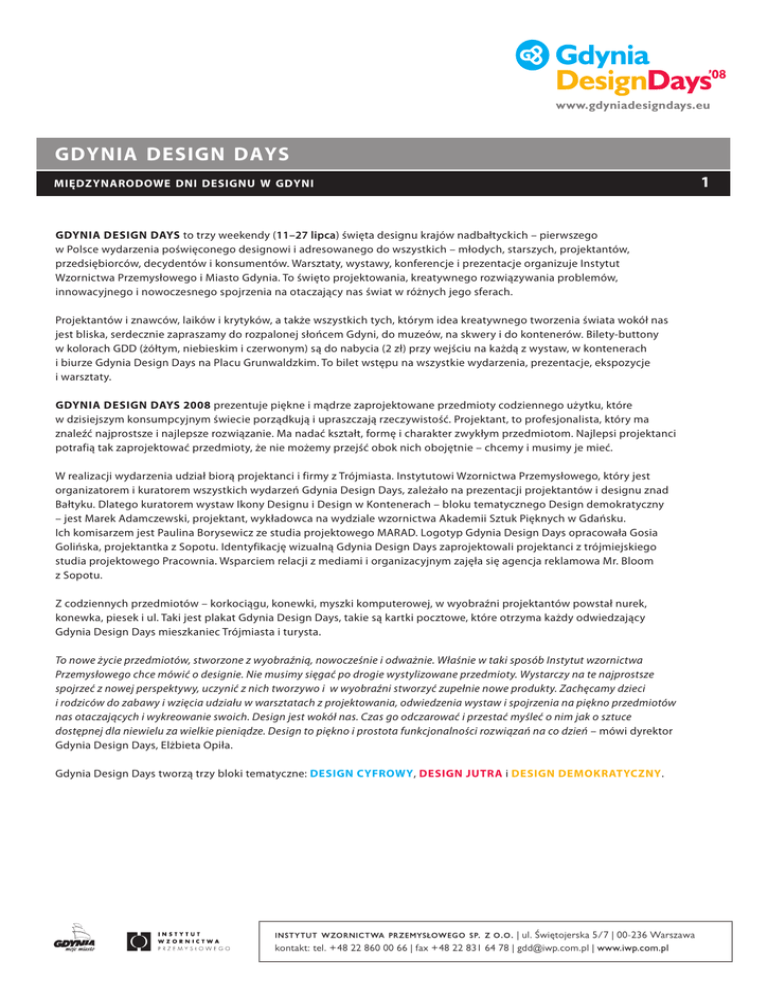 www.gdyniadesigndays.eu gdynia design days międzynarodowe dni designu w gdyni Gdynia Design Days to trzy weekendy (11–27 lipca) święta designu krajów nadbałtyckich – pierwszego w Polsce wydarzenia poświęconego designowi i adresowanego do wszystkich – młodych, starszych, projektantów, przedsiębiorców, decydentów i konsumentów. Warsztaty, wystawy, konferencje i prezentacje organizuje Instytut Wzornictwa Przemysłowego i Miasto Gdynia. To święto projektowania, kreatywnego rozwiązywania problemów, innowacyjnego i nowoczesnego spojrzenia na otaczający nas świat w różnych jego sferach. Projektantów i znawców, laików i krytyków, a także wszystkich tych, którym idea kreatywnego tworzenia świata wokół nas jest bliska, serdecznie zapraszamy do rozpalonej słońcem Gdyni, do muzeów, na skwery i do kontenerów. Bilety-buttony w kolorach GDD (żółtym, niebieskim i czerwonym) są do nabycia (2 zł) przy wejściu na każdą z wystaw, w kontenerach i biurze Gdynia Design Days na Placu Grunwaldzkim. To bilet wstępu na wszystkie wydarzenia, prezentacje, ekspozycje i warsztaty. Gdynia Design Days 2008 prezentuje piękne i mądrze zaprojektowane przedmioty codziennego użytku, które w dzisiejszym konsumpcyjnym świecie porządkują i upraszczają rzeczywistość. Projektant, to profesjonalista, który ma znaleźć najprostsze i najlepsze rozwiązanie. Ma nadać kształt, formę i charakter zwykłym przedmiotom. Najlepsi projektanci potrafią tak zaprojektować przedmioty, że nie możemy przejść obok nich obojętnie – chcemy i musimy je mieć. W realizacji wydarzenia udział biorą projektanci i firmy z Trójmiasta. Instytutowi Wzornictwa Przemysłowego, który jest organizatorem i kuratorem wszystkich wydarzeń Gdynia Design Days, zależało na prezentacji projektantów i designu znad Bałtyku. Dlatego kuratorem wystaw Ikony Designu i Design w Kontenerach – bloku tematycznego Design demokratyczny – jest Marek Adamczewski, projektant, wykładowca na wydziale wzornictwa Akademii Sztuk Pięknych w Gdańsku. Ich komisarzem jest Paulina Borysewicz ze studia projektowego MARAD. Logotyp Gdynia Design Days opracowała Gosia Golińska, projektantka z Sopotu. Identyfikację wizualną Gdynia Design Days zaprojektowali projektanci z trójmiejskiego studia projektowego Pracownia. Wsparciem relacji z mediami i organizacyjnym zajęła się agencja reklamowa Mr. Bloom z Sopotu. Z codziennych przedmiotów – korkociągu, konewki, myszki komputerowej, w wyobraźni projektantów powstał nurek, konewka, piesek i ul. Taki jest plakat Gdynia Design Days, takie są kartki pocztowe, które otrzyma każdy odwiedzający Gdynia Design Days mieszkaniec Trójmiasta i turysta. To nowe życie przedmiotów, stworzone z wyobraźnią, nowocześnie i odważnie. Właśnie w taki sposób Instytut wzornictwa Przemysłowego chce mówić o designie. Nie musimy sięgać po drogie wystylizowane przedmioty. Wystarczy na te najprostsze spojrzeć z nowej perspektywy, uczynić z nich tworzywo i w wyobraźni stworzyć zupełnie nowe produkty. Zachęcamy dzieci i rodziców do zabawy i wzięcia udziału w warsztatach z projektowania, odwiedzenia wystaw i spojrzenia na piękno przedmiotów nas otaczających i wykreowanie swoich. Design jest wokół nas. Czas go odczarować i przestać myśleć o nim jak o sztuce dostępnej dla niewielu za wielkie pieniądze. Design to piękno i prostota funkcjonalności rozwiązań na co dzień – mówi dyrektor Gdynia Design Days, Elżbieta Opiła. Gdynia Design Days tworzą trzy bloki tematyczne: design cyfrowy, design jutra i design demokratyczny. instytut wzornictwa przemysłowego sp. z o.o. | ul. Świętojerska 5/7 | 00-236 Warszawa kontakt: tel. +48 22 860 00 66 | fax +48 22 831 64 78 | [email protected] | www.iwp.com.pl 1 www.gdyniadesigndays.eu gdynia design days 2 design cyfrowy Design Cyfrowy [ Pomorski Park Naukowo-Technologiczny w Gdyni, Al. Zwycięstwa 96/98 ] – świat cyfrowy wyznacza kierunki rozwoju i wpływa na nasz nowy styl życia. Starszym pozwala zrozumieć młodych i się z nimi komunikować w nowych technologiach, młodym – zrealizować wizje i innowacyjne pomysły, bez których nie wyobrażają sobie życia. Międzynarodowa konferencja naukowa Ergonomia w cyfrowym świecie 16 lipca o godz. 11:30 O nowych mediach i ergonomicznych warunkach stanowisk pracy w świecie cyfrowym opowiedzą m.in. specjaliści z Université Paul Verlaine (Metz) oraz Ergonomic Institute (Berlin). Specjaliści od ergonomii zapraszają z kolei dzieci i z rodzicami. Na przygotowanych stanowiskach z grami komputerowymi będzie można sprawdzić, czy dziecko prawidłowo siedzi, czy wysokość krzesła i stolika jest dopasowana do jego ciała, co można usprawnić i jak prawidłowo korzystać z komputera. Imagine Cup 2008 15 lipca o godz. 12:00 Prezentacja innowacyjnych projektów oprogramowań i interfejsów młodych informatyków i designerów – polskich finalistów największego na świecie międzynarodowego konkursu Imagine Cup 2008, organizowanego przez Microsoft i Instytut Wzornictwa Przemysłowego. Można przyjść na pokaz m.in. aplikacji LifeTracker, przygotowanej przez zwycięski zespół DemoScene Spirit z Poznania, która umożliwia śledzenie w czasie rzeczywistym gatunków zwierząt zagrożonych wyginięciem, a także aplikacje przygotowane przez pozostałe drużyny finałowe. Fortis Young Design (FYD )15 lipca o godz. 14:00 Prezentacja finalistów konkursu Fortis Young design o stypendium im. Prof. Wandy Telakowskiej – założycielki Instytutu Wzornictwa Przemysłowego. Laureatka konkursu, Magdalena Sikorska, absolwentka wzornictwa poznańskiej ASP, pokaże zaprojektowany przez siebie telefon dla osób starszych, a także wszystkich zdrowych mających problem z ciągłą miniaturyzacją urządzeń. Aparat, z funkcją powiadamiania pogotowia o wypadku i miejscu przebywania właściciela telefonu oraz grupie krwi i przyjmowanych lekach, może być używany 